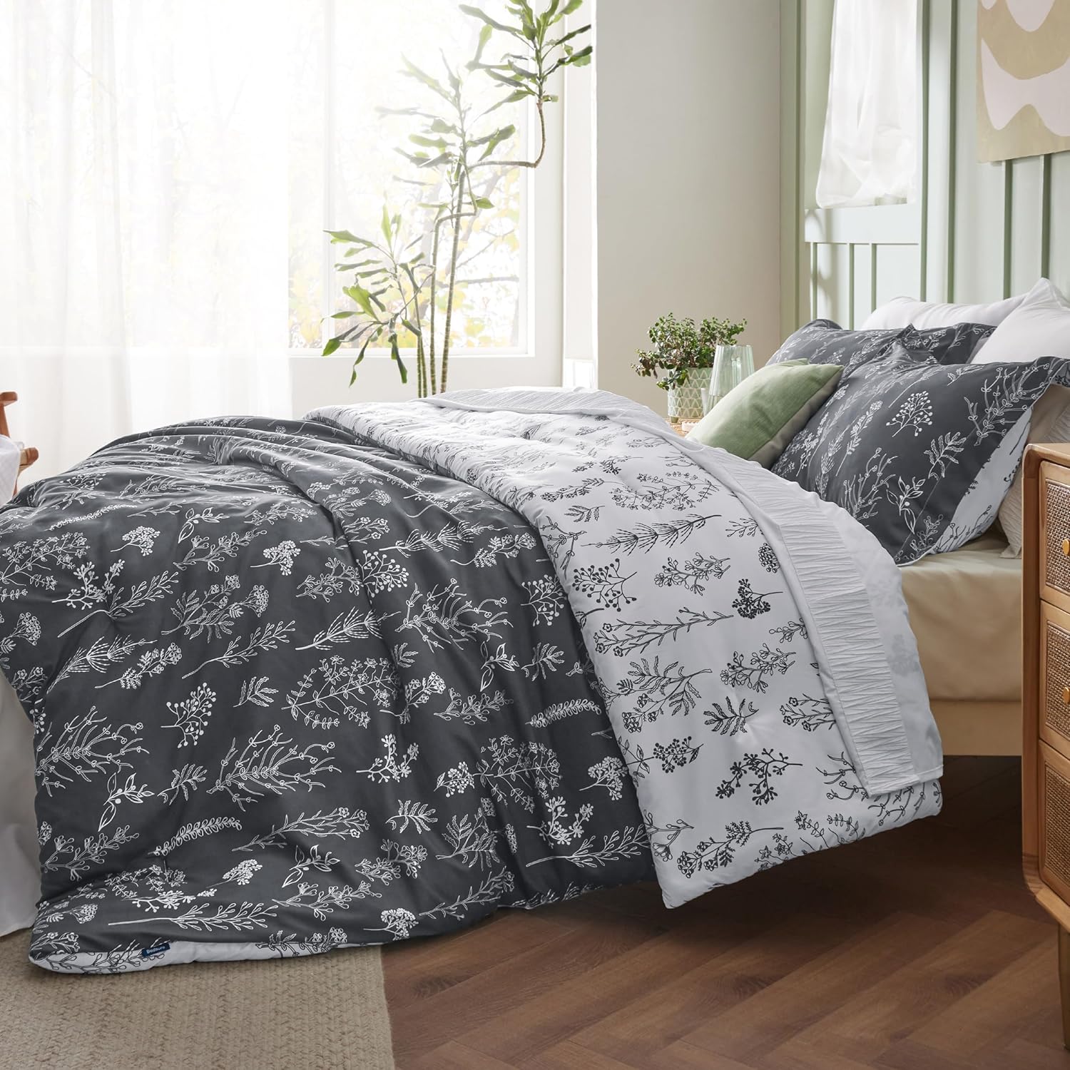 About this itemnUnique Reversible Design: This floral comforter set is reversible with delicate plant patterns, making it a fantastic choice for Christmas gift ideas. Simply flip the comforter or pillow shams to refresh your decor. The vibrant patterns bring a touch of elegance and a natural feel to your bedroom.nOptimal Comfort: Featuring Bedsure’s thoroughly tested, high-grade down alternative filling blend, this comforter set provides the right warmth while ensuring optimal support. Its exceptional softness makes it an excellent option for women Christmas gifts, offering a restful night’s sleep in all seasons.nA Perfect Holiday Gift for Your Loved Ones: Give the gift of coziness and freshness to your loved ones with this comforter set, perfect for any occasion, including Christmas gifts for her.nEasy to Maintain: This fluffy comforter set, ideal as gifts for woman, is durable and easy to maintain. Its subtle yet dense stitches prevent the filling from shifting. Simply machine wash in cold water on a gentle cycle for a like-new restoration.nCertified for Safety: This comforter set is Standard 100 by OEKO-TEX certified for meeting the highest testing criteria for harmful chemicals and has been found harmless for humans.nWhat You Can Get: This Bedsure queen size comforter set includes 1 comforter (90