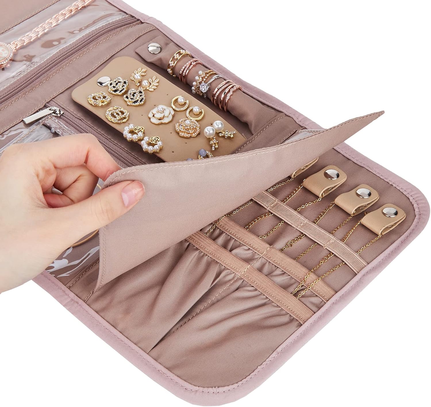 BELALIFE Travel Jewelry Case Organizer, Foldable Storage Roll for Earrings, Necklaces, Rings, Bracelets, Brooches, Pink