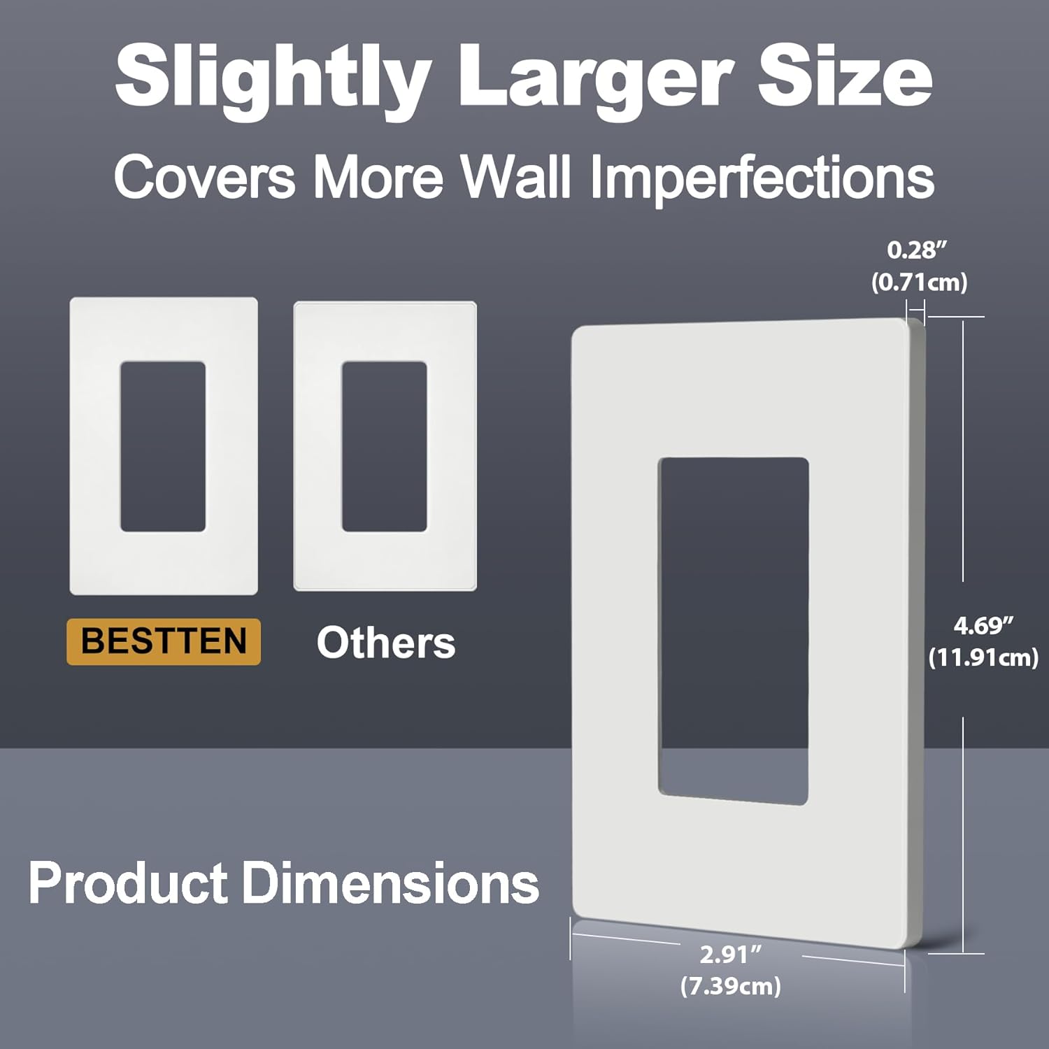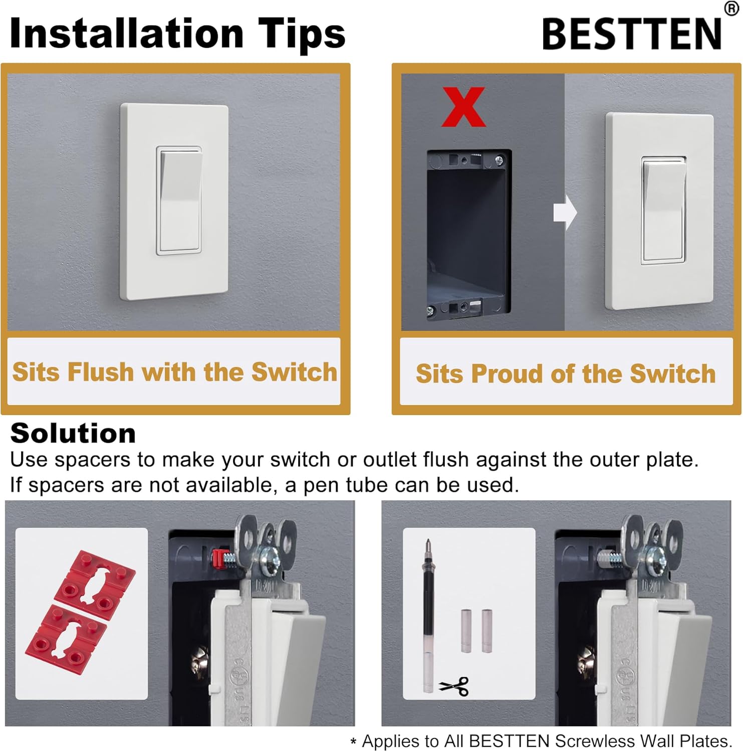 About this itemnMatte White is a popular subtle modern upgrade over the more traditional gloss finish. Matte White screwless wall plates perfectly accent contemporary interior decorsnHigh quality, polycarbonate material is stain resistant and easy to clean with a smooth Matte White finish makes for an incredibly durable wallplate that enhances the look and feel of your spacenBESTTEN screwless wall plates have 1 small prying slot on the bottom while other brands may have larger slots on both top and bottomnStandard Size: Height 4. 69 (11.91cm) x Width 2.91 (7.39cm) x Depth 0.28 (0.71cm)nUSWP4 series for white color and USWP6 series for snow white color. To match your outlets/switches, please select the right series, color, finish, and gangn See more product details