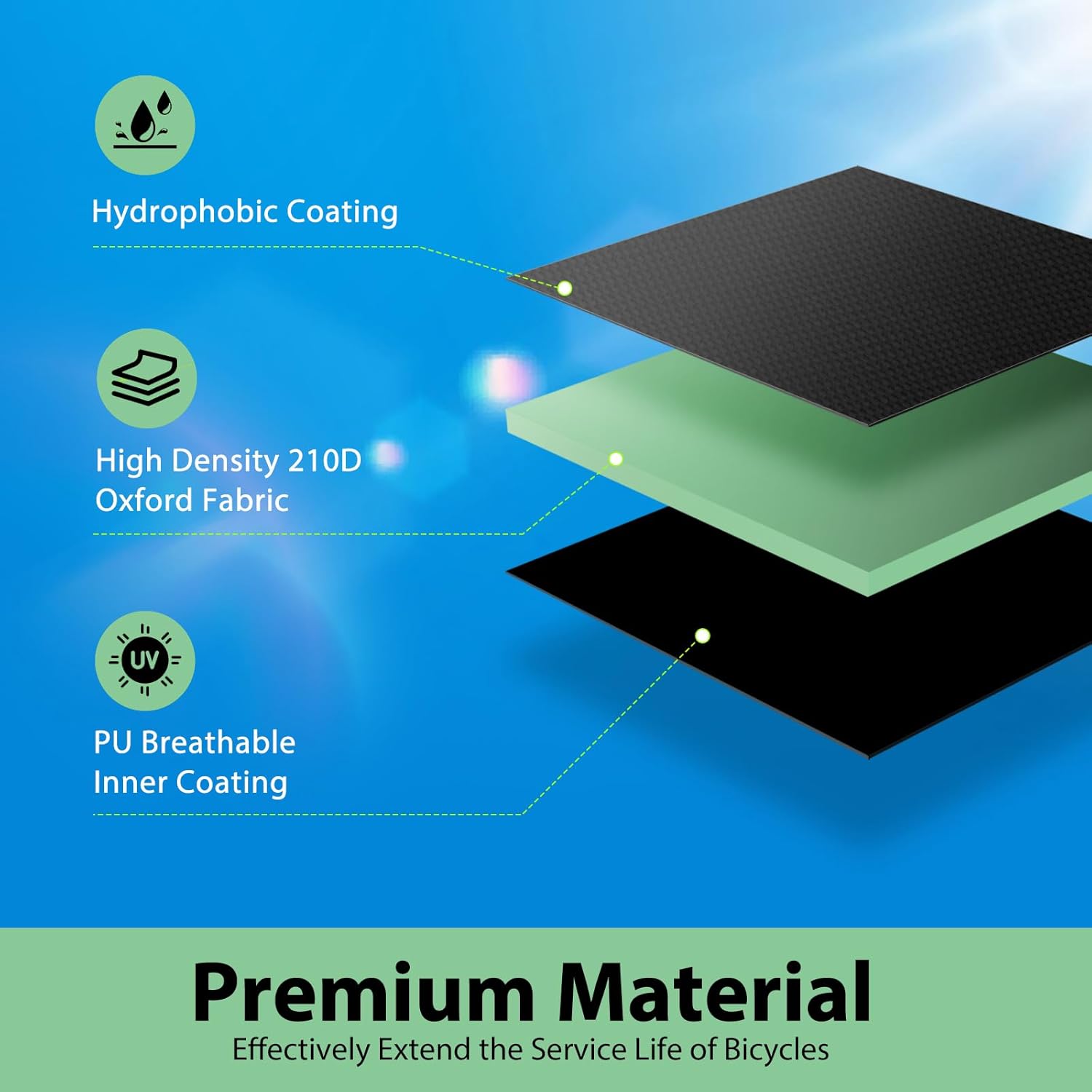 About this itemnFabric Characteristics – Topcrown bike cover uses 210D fabric combined with a hydrophobic coating, PU waterproof coating, and anti-UV coating, three core technologies to ensure excellent protection for bicycles. The fabric just has 80 GSM (g/m²), but its multi-layered design enables it to withstand water pressure of up to 3000mmH?O, striking an excellent balance in water resistance, sturdiness, and lightweight.nLarge Size – XL Size for 1 bike: 79” L x 28” W x 43” H, XXL Size for 2 bikes: 83” L x 37” W x 43” H, XXXL Size for 3 bikes: 87” L x 43” W x 47” H, easily covering bike up to 29