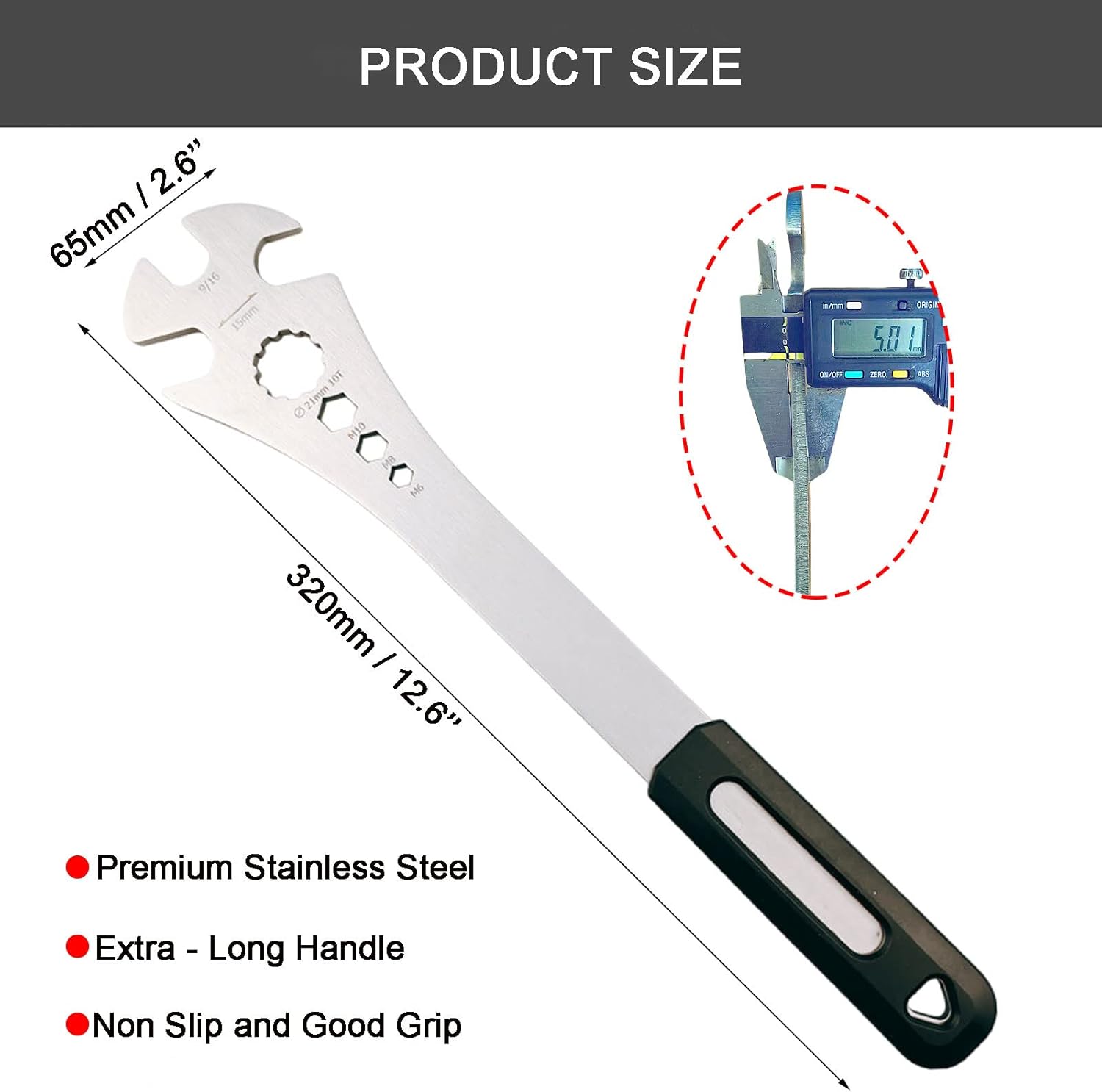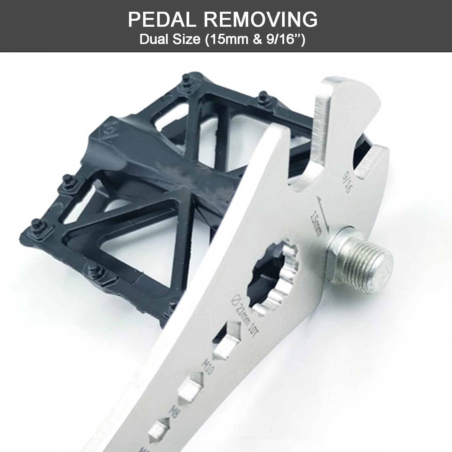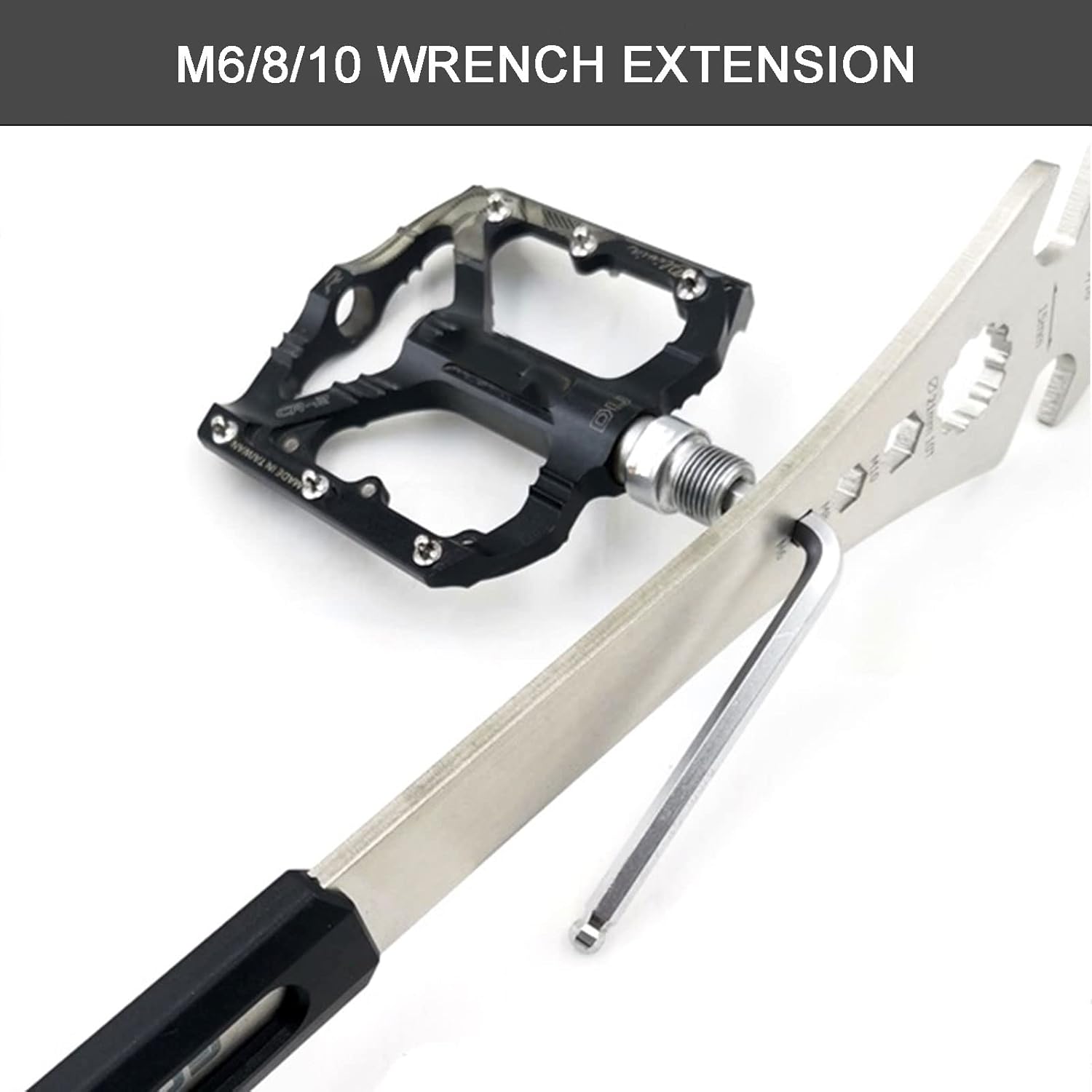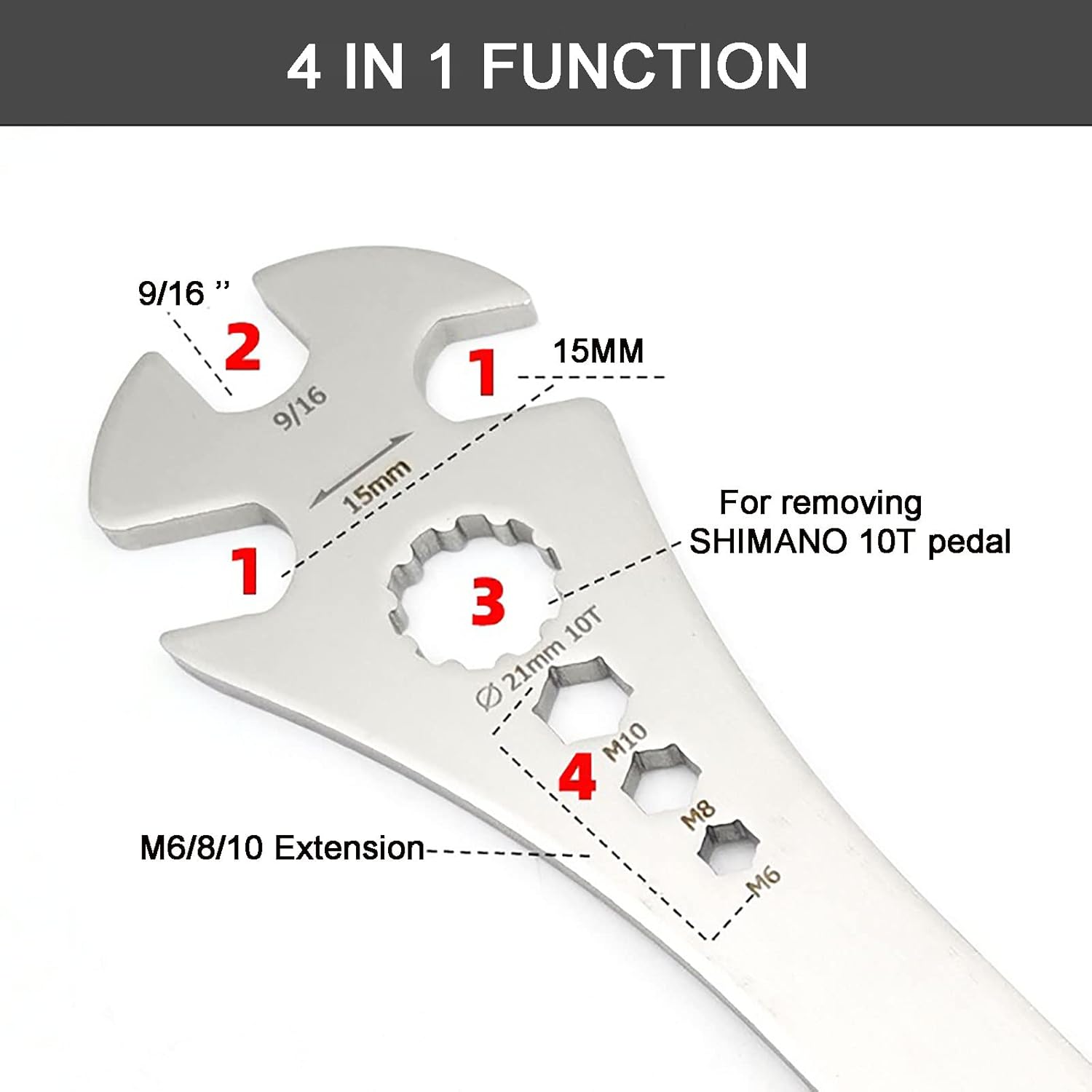 About this itemn?4 IN 1 Function?Our bicycle pedal wrench features two 15mm spanners, one 9/16 inch spanner, and three 6-8-10mm hexagon sockets, making it suitable for various pedal sizes and types. It even allows for removal of the pedal shaft, making pedal maintenance easy.n?High-Quality Craftsmanship? The bike pedal wrench tool made from heavy-duty steel and featuring precise laser cutting for a smooth, burr-free surface, our bike pedal removal tool is built to last. The 5mm thickness and quenching heat treatment ensure durability, making it difficult to break or damagen?Extra-Long and Ergonomic Design? The elongated handle(320MM) provides ample leverage, making pedal assembly and disassembly more convenient and labor-saving. The power coated handle provides a comfortable, non-slip grip, making it easier and more efficient to use.n?Easy to Use?With clearly marked numbers and an easy-to-use design, our bike pedal tool allows you to quickly and easily remove and install pedals on your bike. This makes maintenance work more efficient and hassle-free.n?Versatile and Practical?Suitable for various types of bikes including mountain bikes, racing bikes, and traffic bikes, our high-quality and user-friendly bike tool is perfect for outdoor riding and essential for home bicycle pedal repair. This practical tool is a must-have for all cyclists.