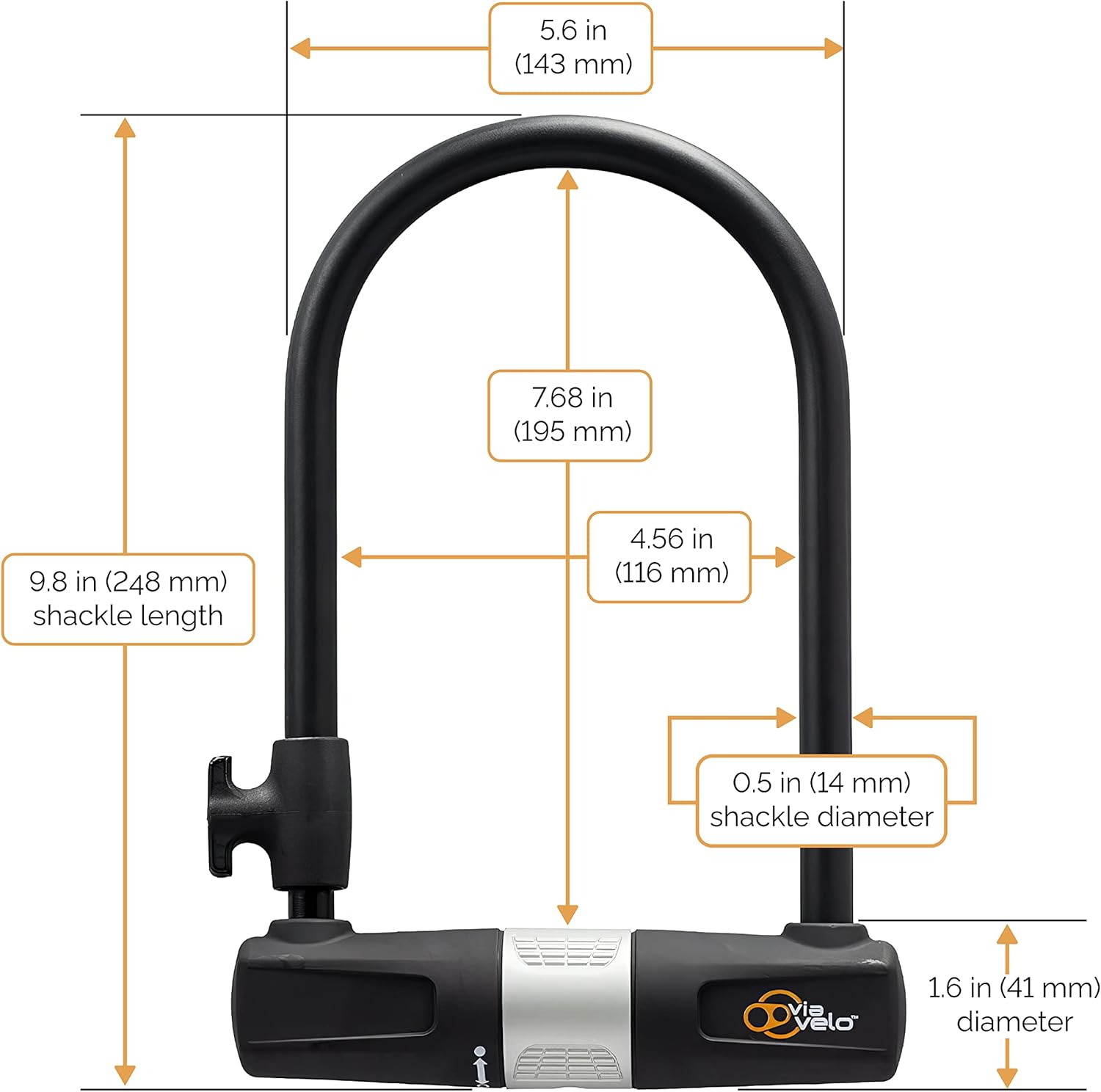About this itemnDURABLE ALL-WEATHER PROTECTION – Via Velo bike U-lock with hexagonal PVC cover resists corrosion from water, dust and dirt to prolong the life of your lock. All-weather performance means peace of mind and better securitynEASY AND STRONG TO LOCK YOUR BIKE – The bike lock with thickness(including rubber casing):14mm,9.84 in (250mm) x 5.51 in (140mm) U shack to lock and go! Locking your bike and your wheels with 10mm x 180cm cable, fast and easy with our quick, no-hassle system. Great bike safety toolnAMAZING CONVENIENCE AND SECURITY – 2 keys for convenience! The bike U-lock comes with 2 keys. One of them you can take and use in daily life and the other you can leave at home in case the trouble when you lose one carelesslynSIMPLY INSTALLING BRACKET ON YOUR BIKE – Convenient high-quality mounting bracket means your lock goes with you, Our bracket is suitable for bike tube:20-42mm. Pls refer to our picture to install the bracket Value for your moneynLIFETIME WARRANTY AND CUSTOMER SERVICE: Via Velo is committed to providing our customers with high quality products . If you are having any problems with Via Velo product, please reach out to our Customer Service Team. Our Team will solve your issue as soon as possible. We give our locks with a limited lifetime warranty so you can buy your lock with confidence. Rest Assuredn› See more product details