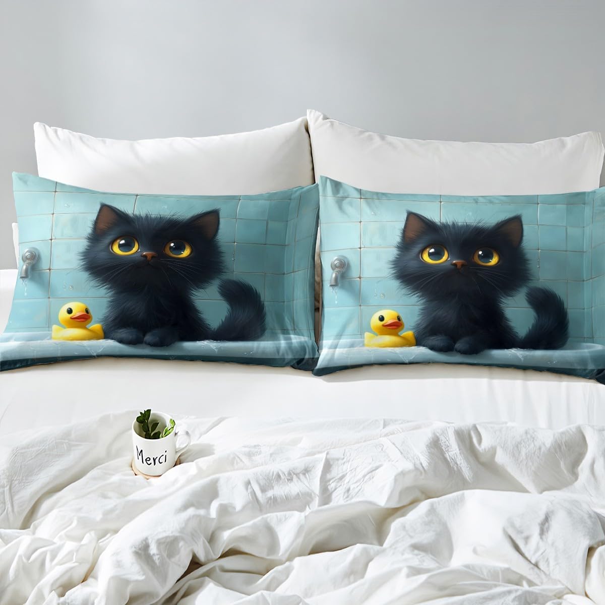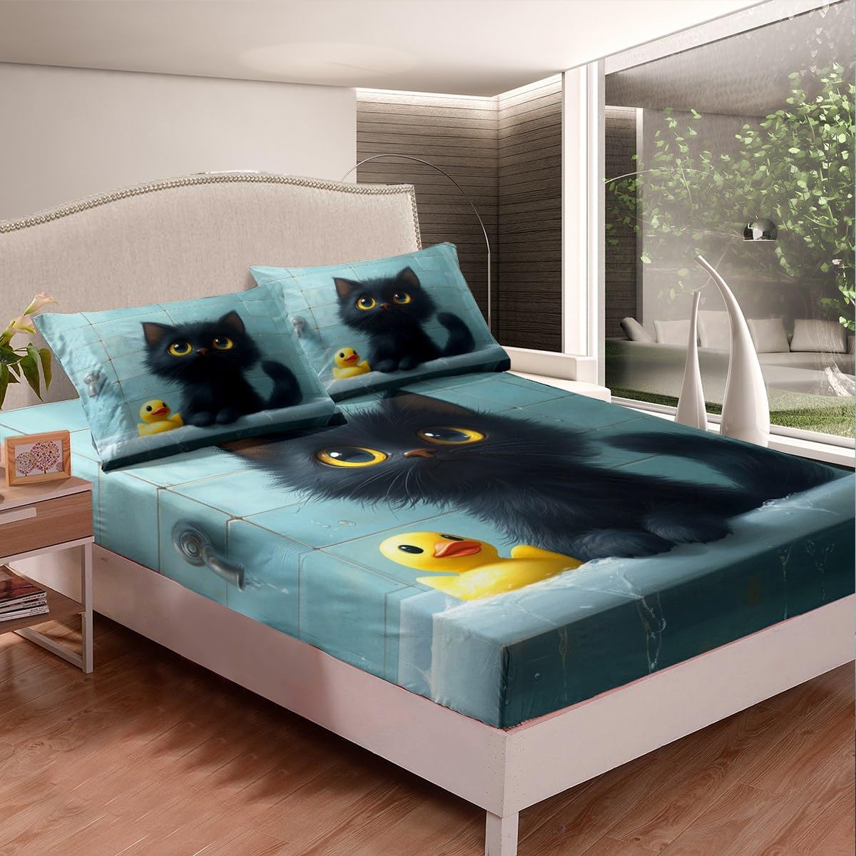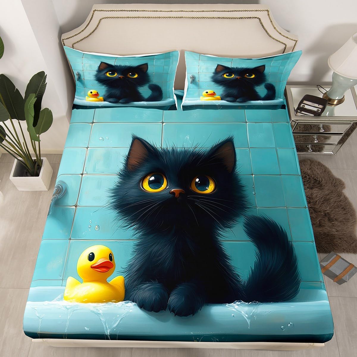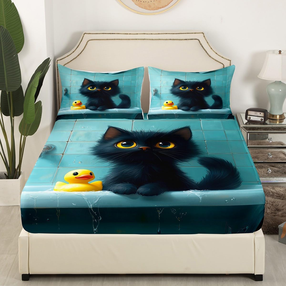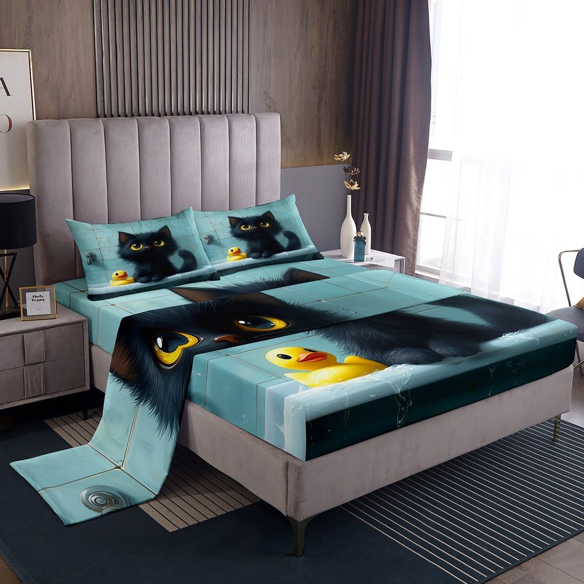 Black Cat Bed Sheet Set Twin Size,Cartoon Pet Kitten Lovely Bath Duck Sheet Set,Kawaii Animal Teal Brick Wall Print Bedding Set with 1 Flat & 1 Fitted Sheet with 1 Pillow Sham