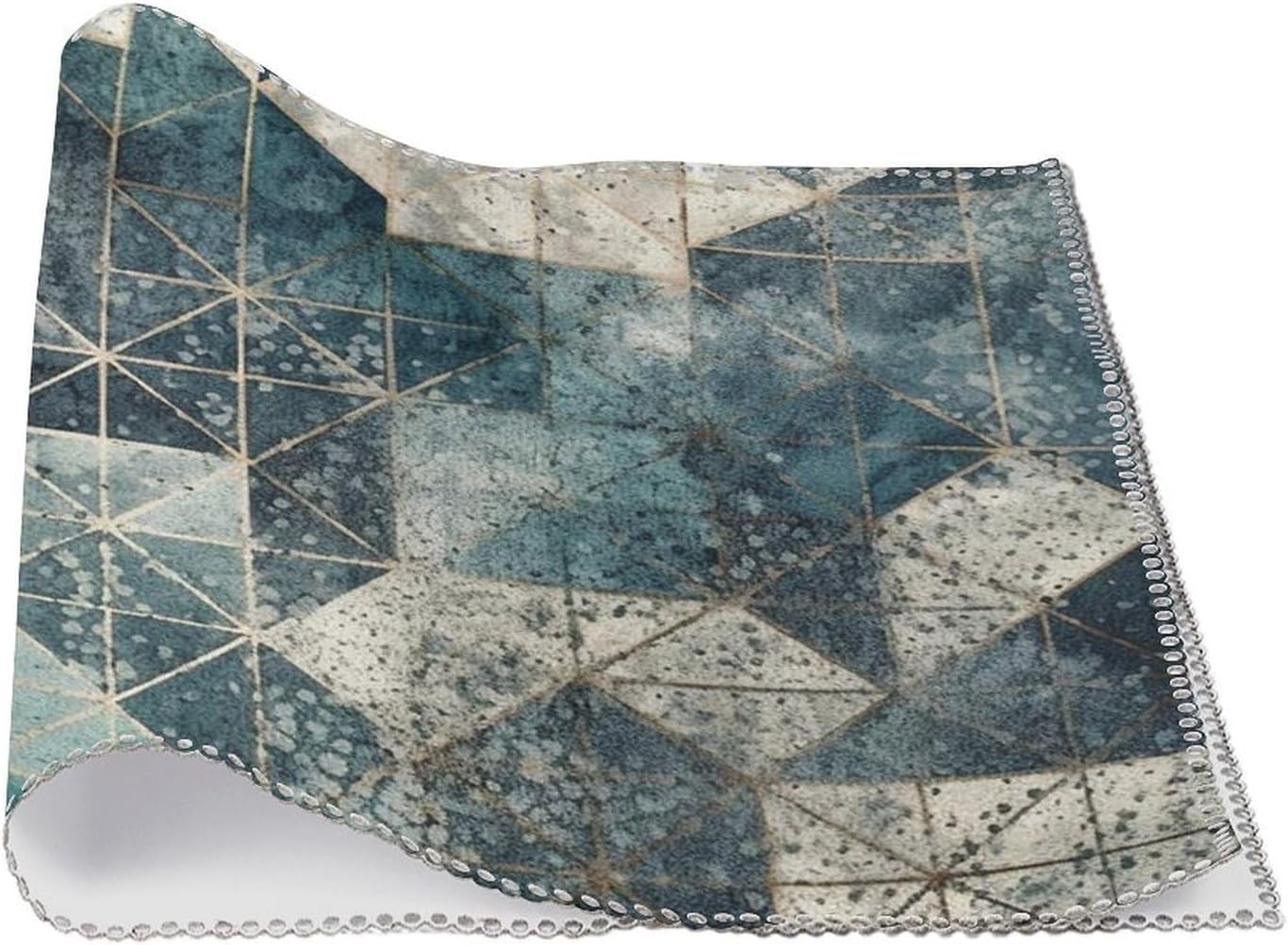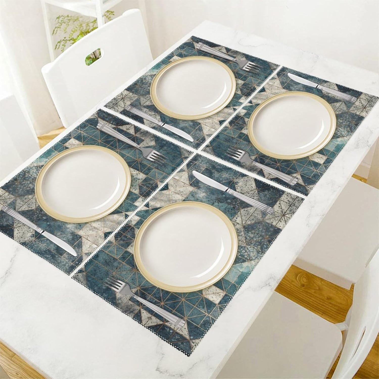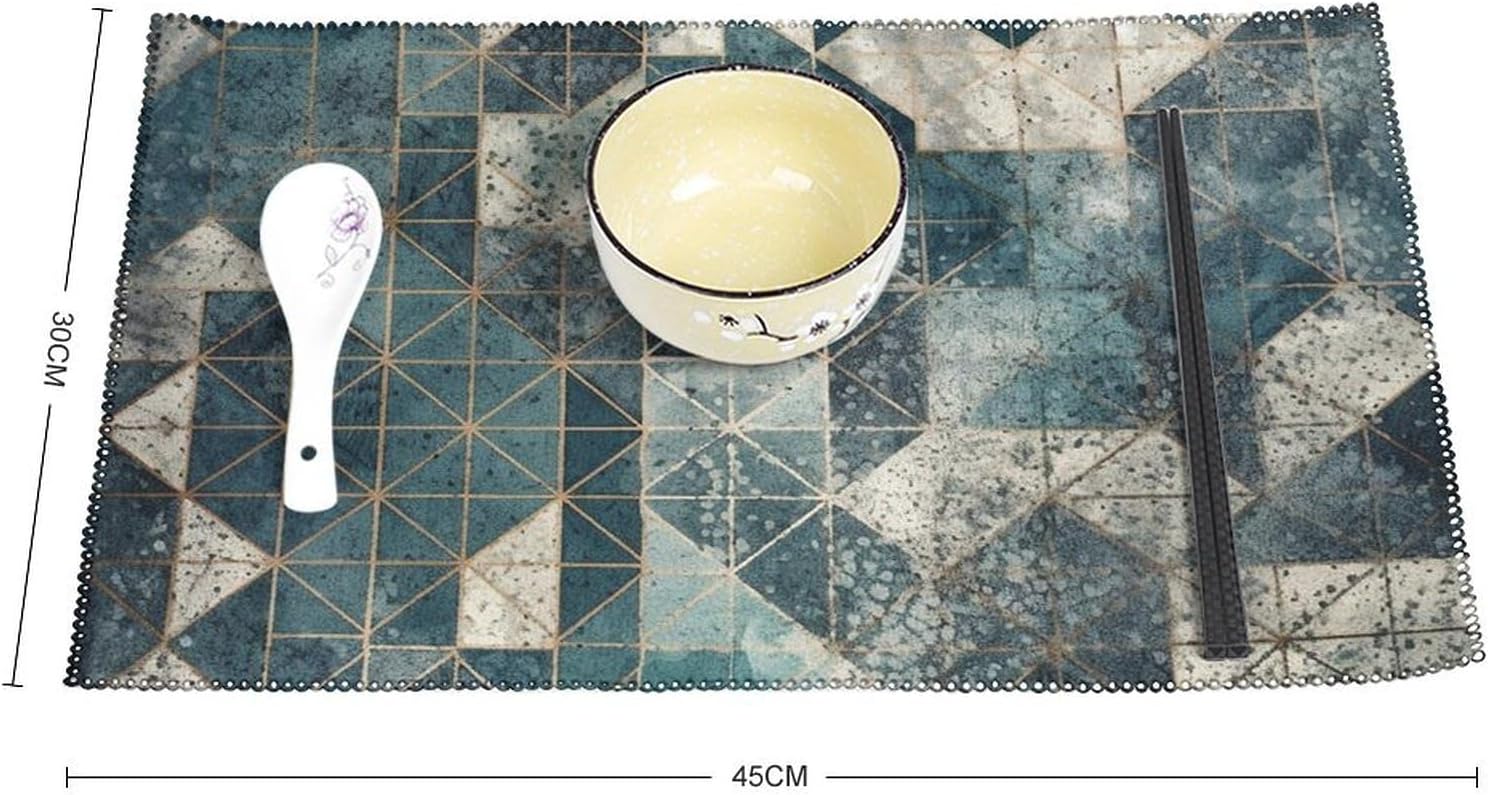 About this itemnPerfect Protection: Crafted from high quality canvas fabric, the Blue And Gray Geometry table protector is thick, protecting your tables and furniture from hot dishes, stains and scratches.They provide a non-slip surface, resist fading, and are easy to clean, elevating your dining experience.nMeasurements: Each package includes 4 pieces of placemats measuring 17.7 x 11.8Inch.If there is any problem,please contact us, our customer support team is always ready to help you. It is suitable for all hot drinks and plates, protect your dining table from scalding.nGreat Gift Idea: The stylish placemats set makes s great housewarming, wedding or birthday gift. They are quality assured, practical, stylish, and add a touch of elegance to any home. Add style to your dining setting while ensuring table protection.nVersatile Uses:Our placemats can be used as nice accessories to match your different decor purposes such as table mats, pot holders, coasters, laptop pads, etc. The rustic and neutral design fits any occasions and helps to create a warm and inviting atmopshere.nEasy to Care: Hand wash with warm soapy water or wipe dry directly; do not wash in a washing machine or use steel balls or something very difficult to clean.They provide a non-slip surface, resist fading, and are easy to clean, elevating your dining experience.