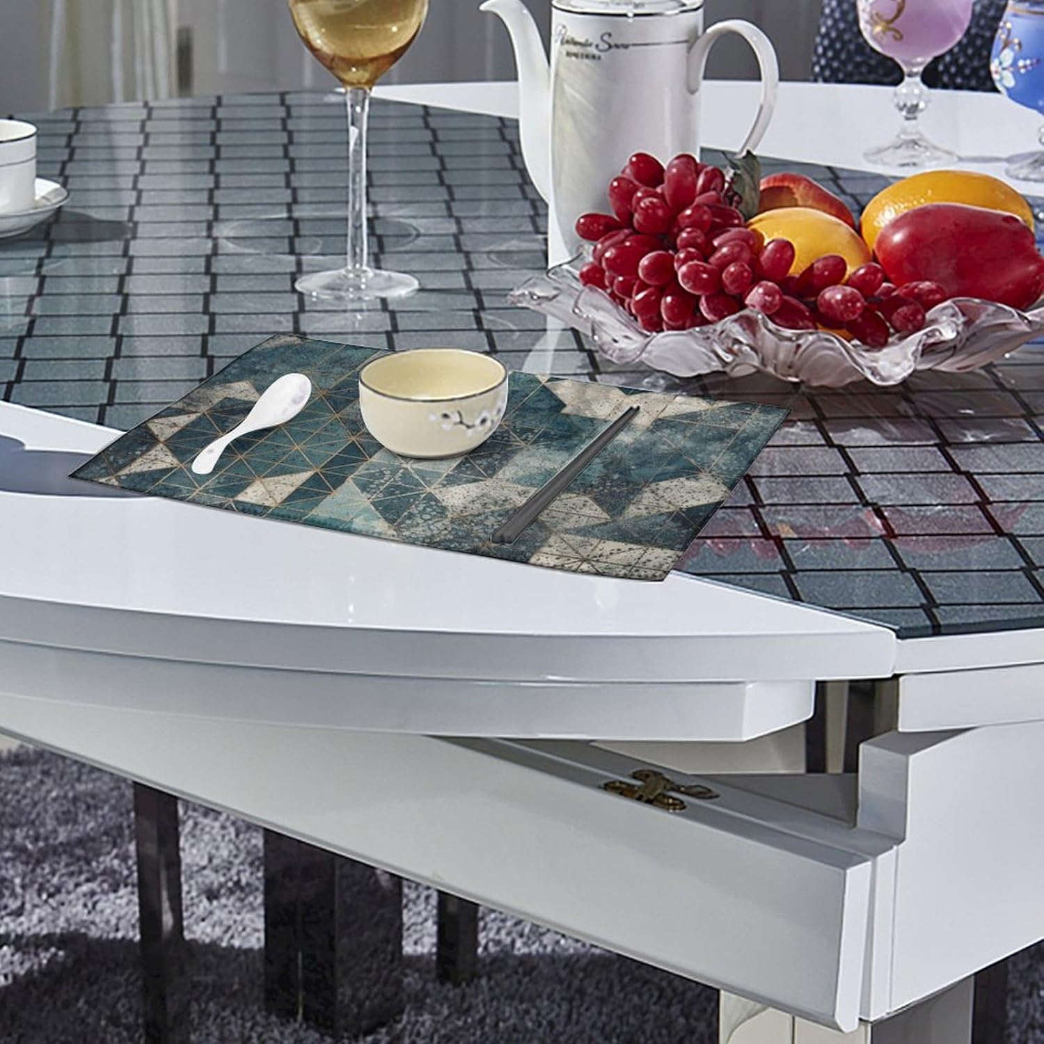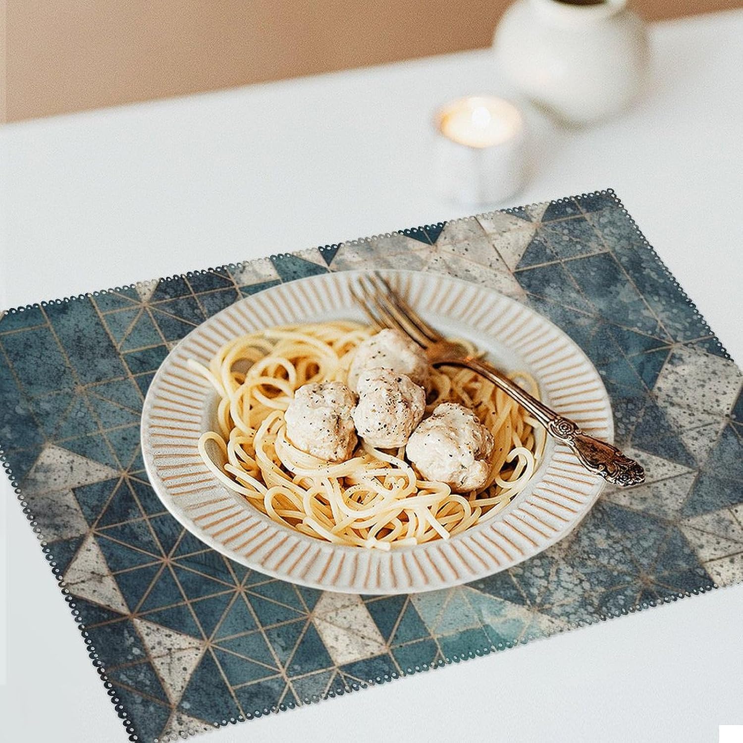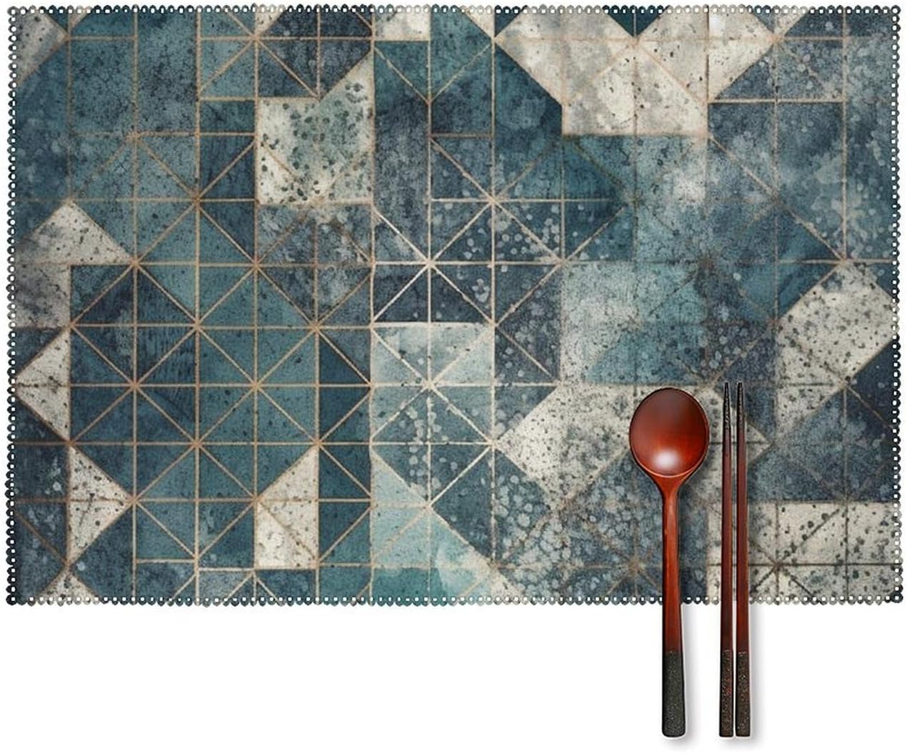 About this itemnPerfect Protection: Crafted from high quality canvas fabric, the Blue And Gray Geometry table protector is thick, protecting your tables and furniture from hot dishes, stains and scratches.They provide a non-slip surface, resist fading, and are easy to clean, elevating your dining experience.nMeasurements: Each package includes 4 pieces of placemats measuring 17.7 x 11.8Inch.If there is any problem,please contact us, our customer support team is always ready to help you. It is suitable for all hot drinks and plates, protect your dining table from scalding.nGreat Gift Idea: The stylish placemats set makes s great housewarming, wedding or birthday gift. They are quality assured, practical, stylish, and add a touch of elegance to any home. Add style to your dining setting while ensuring table protection.nVersatile Uses:Our placemats can be used as nice accessories to match your different decor purposes such as table mats, pot holders, coasters, laptop pads, etc. The rustic and neutral design fits any occasions and helps to create a warm and inviting atmopshere.nEasy to Care: Hand wash with warm soapy water or wipe dry directly; do not wash in a washing machine or use steel balls or something very difficult to clean.They provide a non-slip surface, resist fading, and are easy to clean, elevating your dining experience.