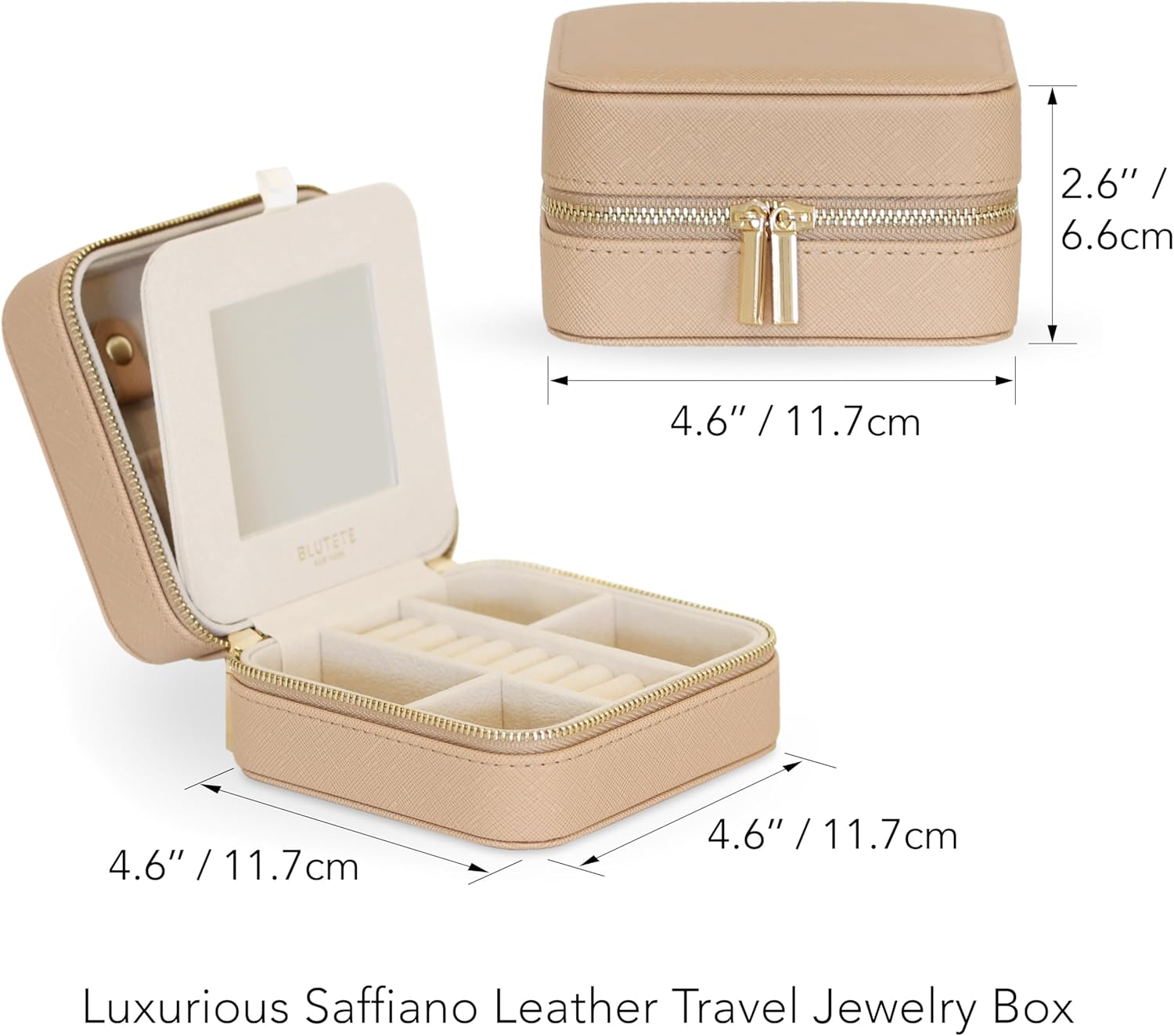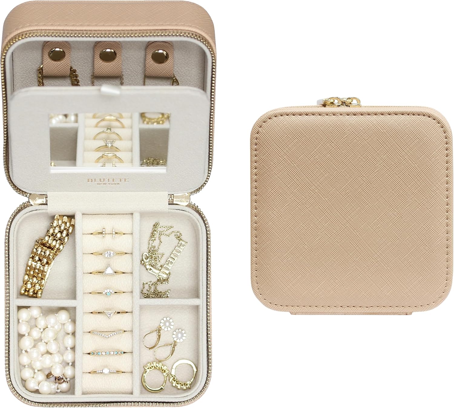 BLUTETE Saffiano Leather Travel Jewelry Box with Mirror | Portable Jewelry Zipper Case | Multi Compartments Jewelry Organizer for Women | Popular Gift Jewelry Box Rings Earrings Nacklaces (Sand)