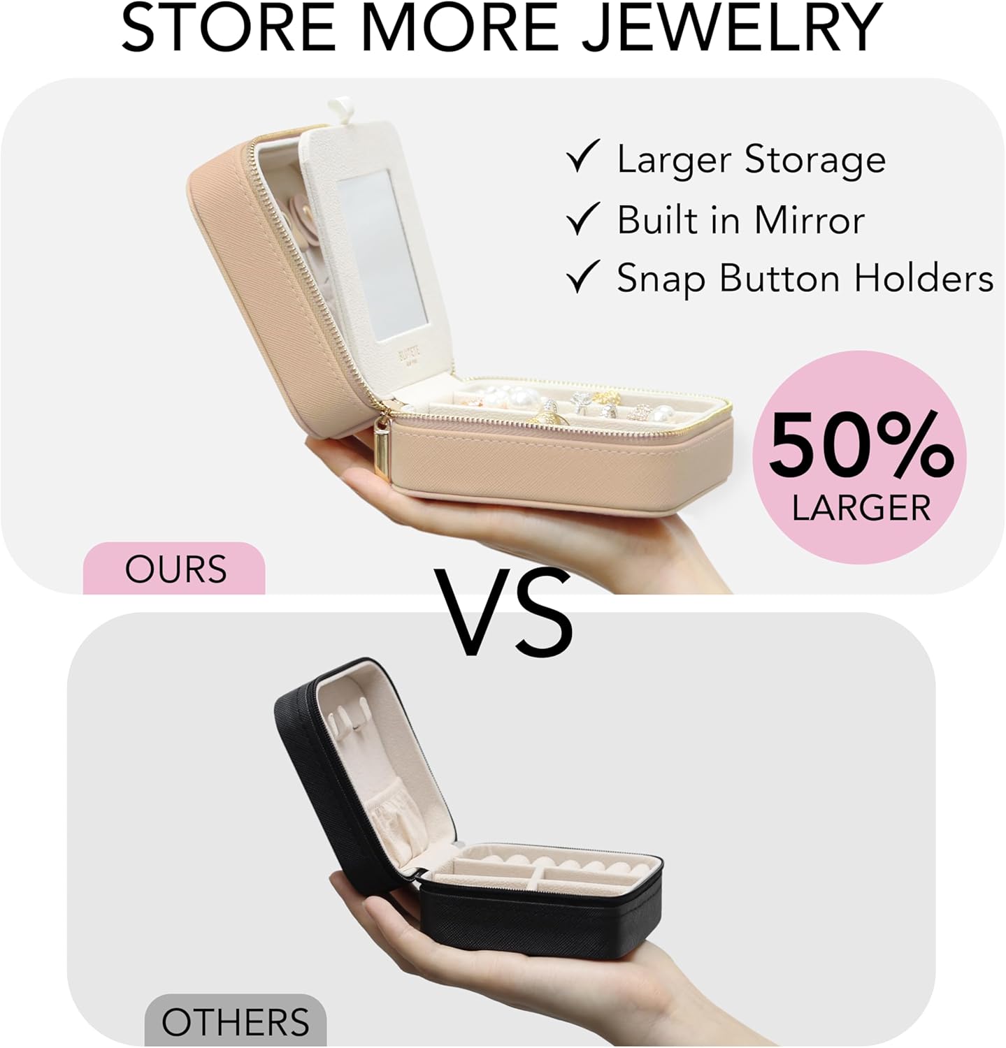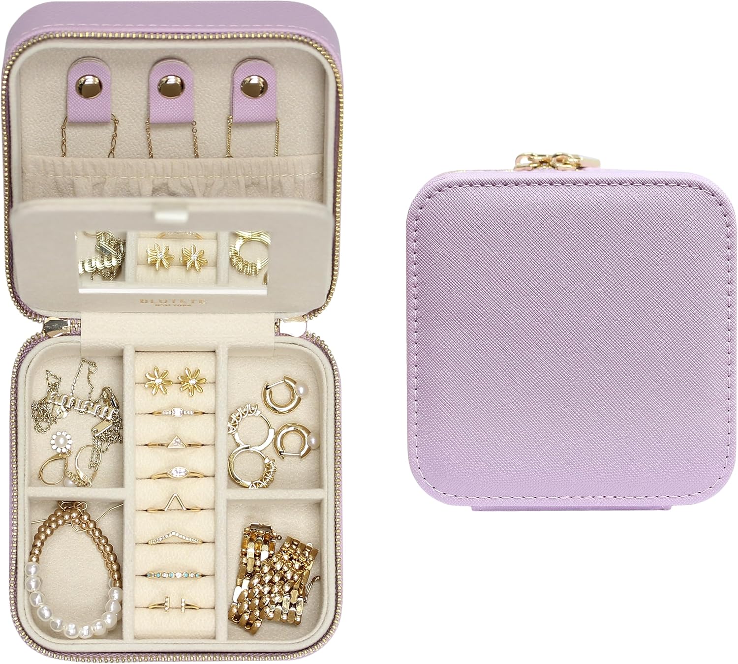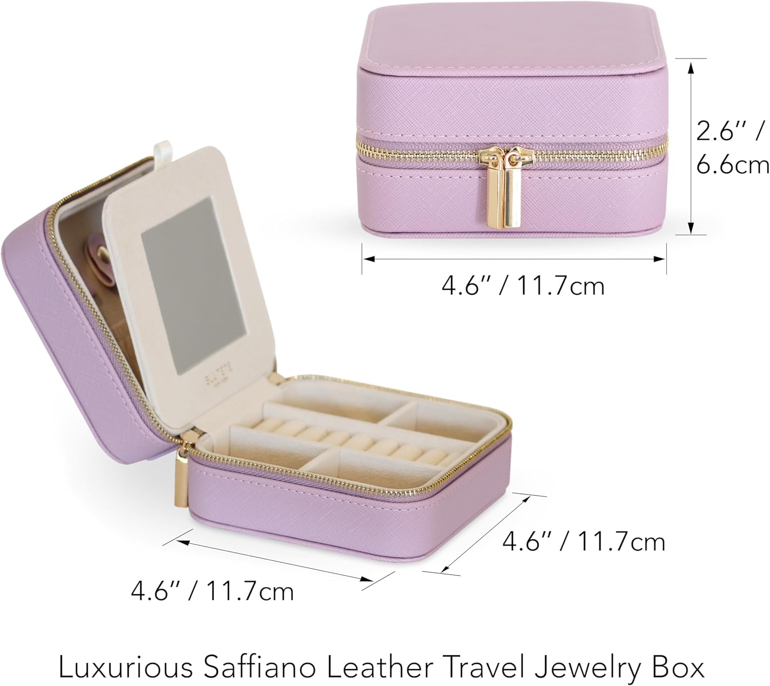 About this itemn??[ Beautiful & Functional ] This stylish travel jewelry box is perfect for organizing jewelry at home or away.n??[ Compact & Portable ] Its compact size fits perfectly into any travel bag. No more tangled chains or misplaced earrings. Our travel jewelry box keeps everything in place.n??[ High Quality Materials & Finishing ] Made from high-quality Saffiano leather for a luxurious feel, soft lining inside adds an extra layer of protection, ensuring your jewelry remains pristine throughout your journey.n??[ Jewelry Organizer with Mirror ] Removable 4 rectangular divisions with a mirror, ring slots, safety elastic pouch, and necklaces hooks. Never lose your jewelry ever again.n??[ Big Spacious ] Upgraded space enough to hold a lot of accessories.n??[ Perfect Gift ] Whether for yourself or someone special, this travel jewelry box makes for a thoughtful and practical gift that will be appreciated for years to come. Perfect present for special occasions, including wedding, bridal party, bridal shower, engagement, bridesmaid gift package, Mother’s Day, Valentine’s Day, Christmas, sweet sixteen, birthday, prom, graduation, anniversary.n??[ Trust ] We guarantee our product quality as we handpick them personally with additional care.n See more product details