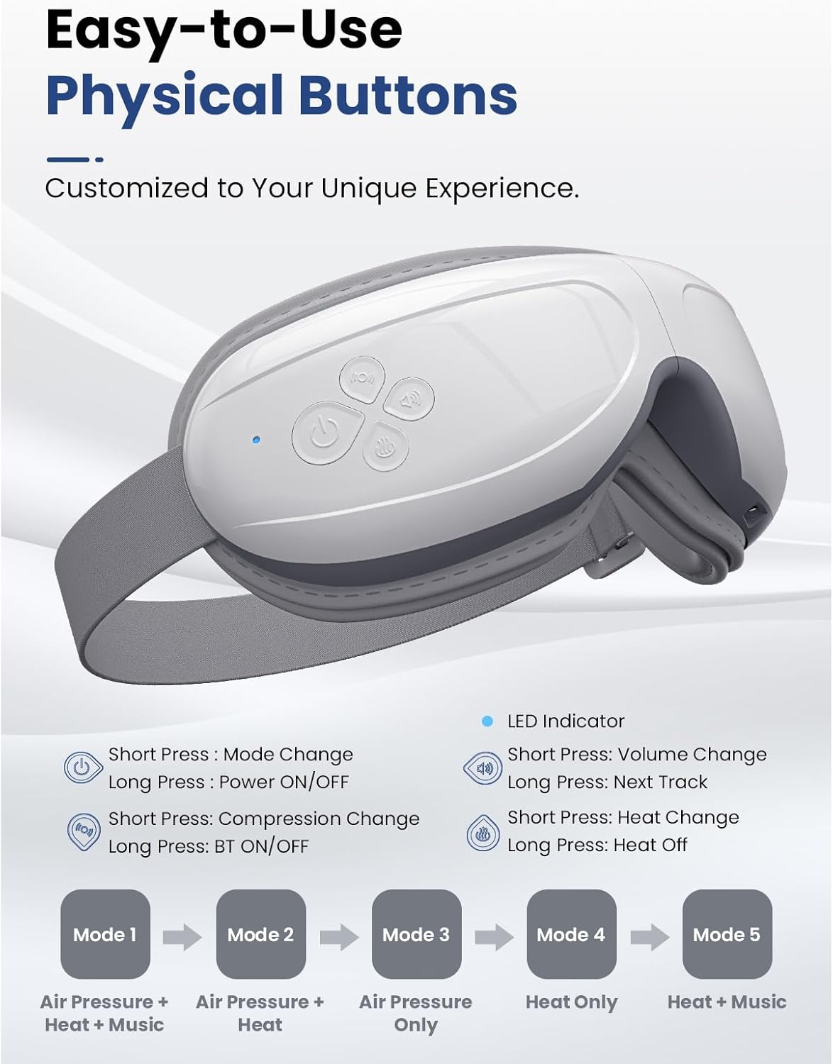 About this itemnMulti-Function Eye Massager: Offers 5 massage modes, 4 intensity levels, and heat function with temperature range of 104-113°F to target eye strain, improve blood circulation, and relieve dry eyes.nPortable and Rechargeable: Cordless design with 1200mAh rechargeable battery (2-3 hours charge time) and 15-minute auto-off feature for convenient use anywhere, with reduced 45dBA noise level.nCustomizable Experience: Built-in white noise music can be turned on/off, and ability to connect to personal devices to play your own music playlists.nErgonomic Design: Double-layered massage pad with adjustable elastic strap for comfortable fit and reduced pressure on the eyes.