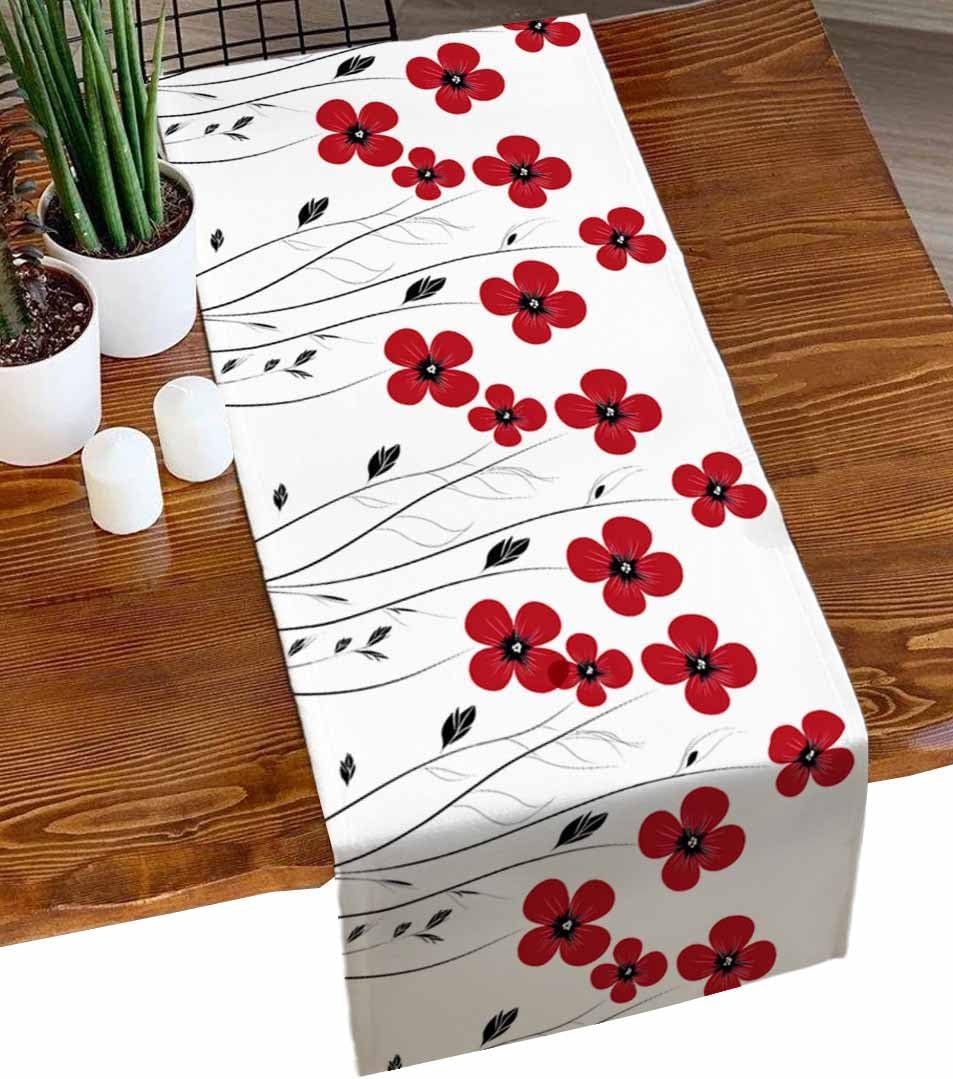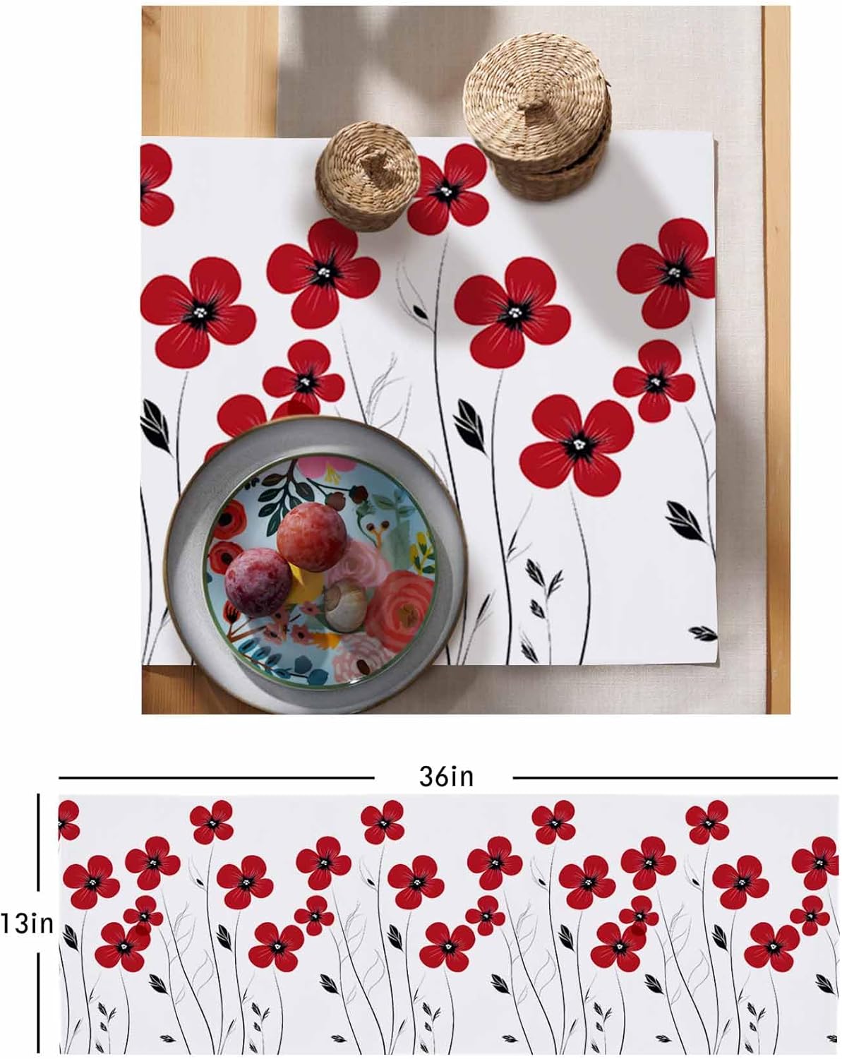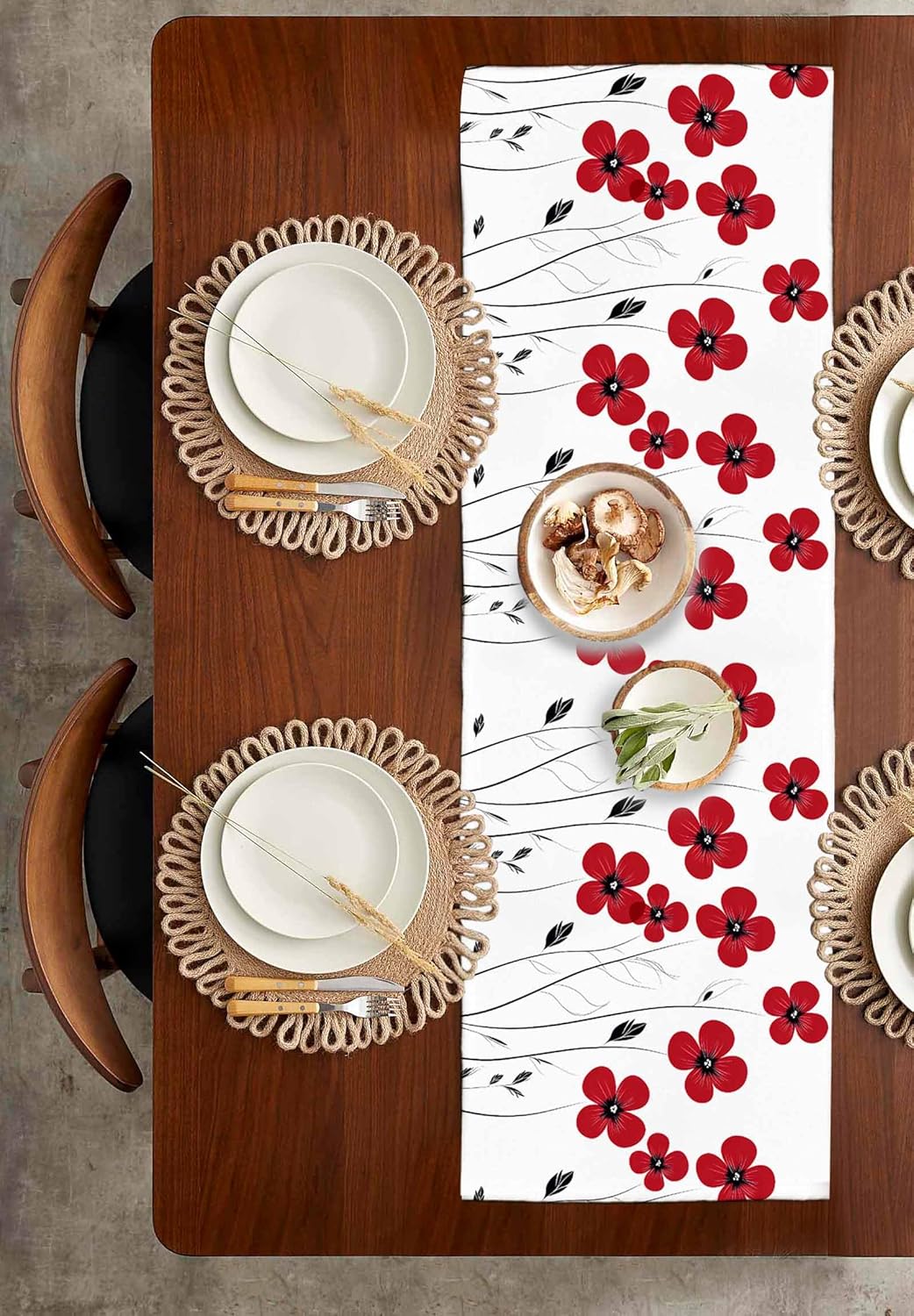 Boho Floral Table Runner 36 Inches Short, Red Flower Country Pastoral Nature Leaves Linen Small Kitchen Dining Coffee Table Runners Dresser Décor, Burlap Tabletop Runner for Table, Wedding, Party