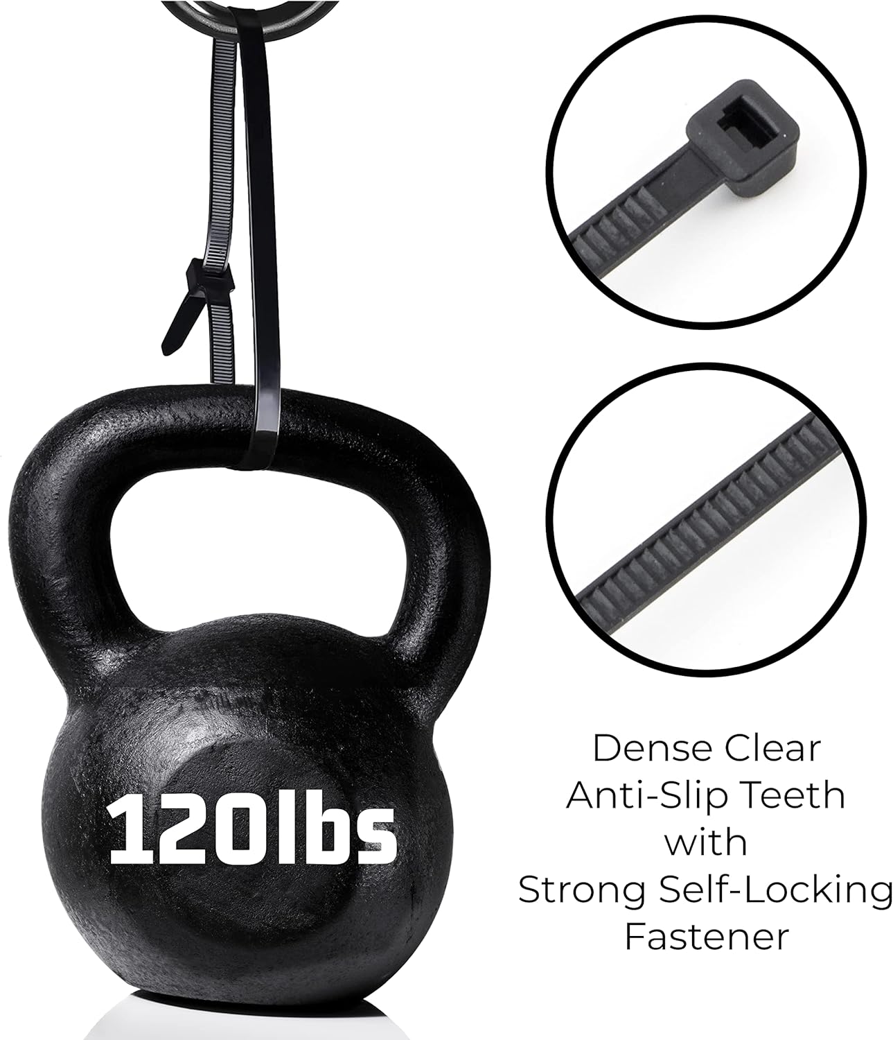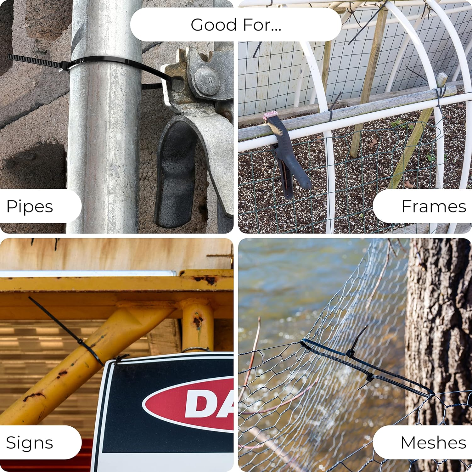 About this itemnEasily organize cables with our heavy-duty 12-inch black zip ties. Rest assured they won’t break even in extreme conditions, making them perfect for all your cable management needs.nDiscover the versatility of these zip-ties, suitable for both indoor and outdoor use. These are resistant to ice, rain, snow, heat, and direct sunlight with their heavy-duty outdoor capabilities.nOur cable ties are temperature-resistant from -31F to +195F (-35C to +90C). These exceptional ties excel in extreme cold and hot conditions while remaining weather and UV resistant.nCrafted from top-quality Nylon 66 material, these zip ties are built to last. Their superior strength sets them apart from the competition, making them the go-to choice for heavy-duty applications.nEach pack of Bolt Dropper Zip Ties contains 100 pieces, each measuring 12 inches in length. Made of UV-resistant Nylon 66, with tensile strength of 120lbs, a width of 7.6mm, and a thickness of 1.3mm.n See more product details