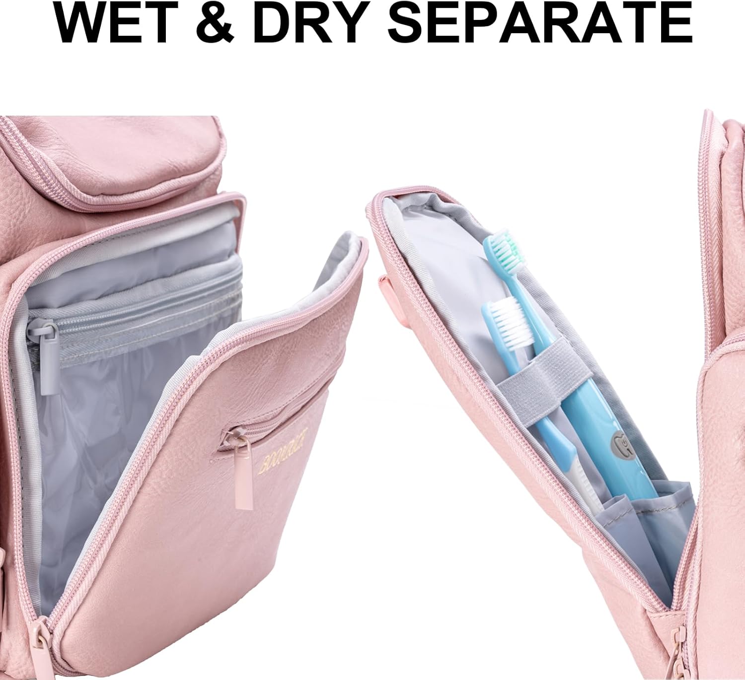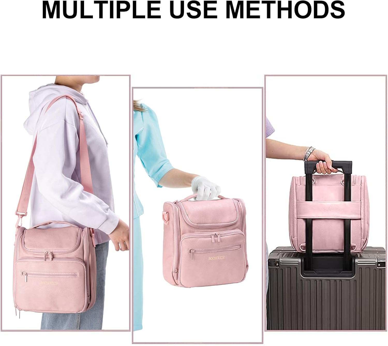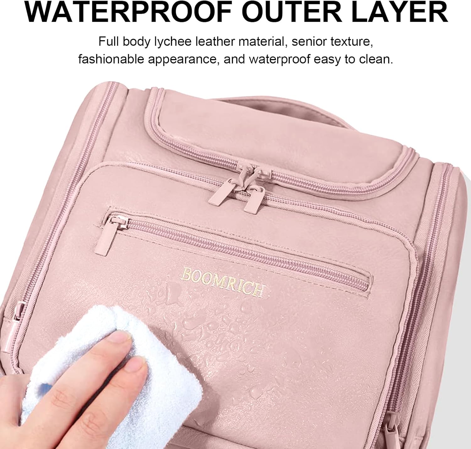 BOOMRICH Large Toiletry Bag for Women, Hanging Leather Travel Makeup Bag with 360° Hook and Shoulder Strap, Travel Organizer for Full Sized Container, Toiletries, Brushes (Pink)