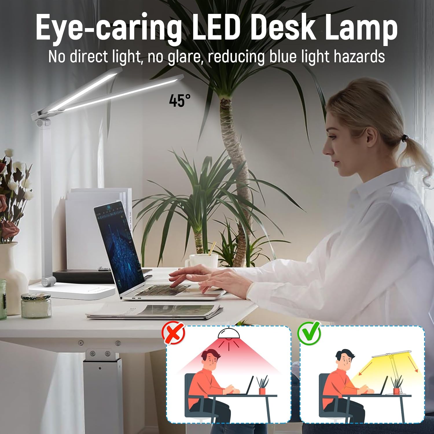 About this itemn50 Lighting Modes: The possibilities are endless! 50 customizable Modes. Through the touch control of the desk lamp, you only need to tap to meet your lighting needs. From 3000K warm light to 6000K white light, experience the change from autumn to summer. You can match the brightness and color as you like, allowing you to enjoy working, painting and studying under the light. The table lamp has a memory function, and the next time it is turned on, it will still be the light you like.nEye Protection Desk Lamp: Step into a new realm of eye comfort! With the help of advanced technology, we have fully upgraded the lamp beads, structure and rotation angle. This desk lamp uses 100 high-quality, energy-saving lamp beads, saying goodbye to glare, flicker and blue light hazards from the root. Its high color rendering index (Ra>80%) presents you with delicate colors. Even if you use it for a long time, it can effectively protect your eyes and reduce fatigue.nDouble Folding Design: The double-head design releases double the space, and it is equipped with 12W high power to illuminate your surroundings. 3 flexible hinges allow you to adjust the irradiation angle at will. The double light swing arm can be extended horizontally by 180°, or vertically folded by 220°, and the base can be rotated vertically by 90°. Its foldable design is born to save desk space, allowing you to spread light anywhere (office, living room, bedroom, dormitory, etc.).nEnergy Saving & 45 Minutes Timer Off: No need to replace bulbs. Our LED desk lamp adopts semiconductor chip light-emitting technology, no glass bubble, not afraid of vibration, not easy to break, 85% energy saving than ordinary incandescent lamps, and longer service life. The fixed reading mode with 4000K warm light can be turned on with one button, allowing you to swim in the sea of books. With a 45-minute timer, it is easier to turn off the lights, allowing you to sleep when you want to sleep.nUSB Power Supply (AC Adapter Included): Say goodbye to extra costs. The desk lamp is equipped with a 5V2A adapter and a 1.2-meter power cord to ensure your convenience. Even if you take it out, it can be powered by a mobile power supply or a computer to solve your troubles. In addition, the table lamp is also equipped with an additional USB charging port, as long as it is connected to the power supply, it can charge your mobile phone and iPad, providing you with more convenience.n See more product details
