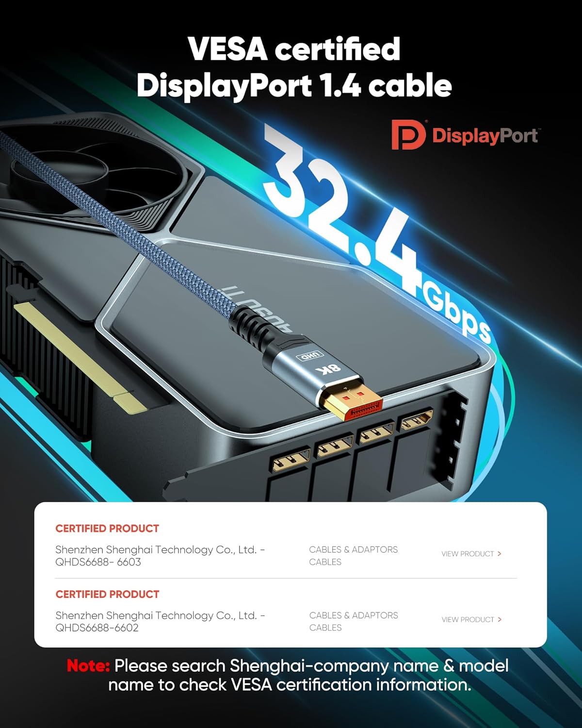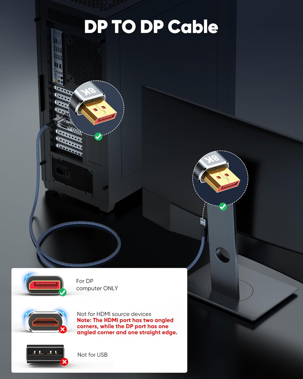 About this itemnVESA Certified 8K 4K DisplayPort Cable 1.4: Capshi DisplayPort/Display Port/DP Cable (NOT HDMI/Mini DP) supports high resolutions 8K(7680×4320)@60Hz, 4K@60Hz/120Hz/144Hz, 2K/1080P@120Hz/165Hz/240Hz; Backwards compatible with DisplayPort 1.3/1.2/1.1, etcnEnhanced Gaming Experience: DisplayPort 1.4 provides 32.4 Gbps of bandwidth, supports high refresh rates, high resolutions, DSC and Dynamic HDR; Maximize the performance of your graphics card and monitor with no motion blur, screen tearing, or flickeringnDurable Design: The SR Flexible strength design, 24K gold-plated ports, latch-free and military-grade tensile nylon can ensure that this 8k Display Port cable withstand up to 25,000 flex times and accurately transmits signals, greatly extending use lifenUniversal Compatibility: The DisplayPort cable is compatible with all graphics cards and monitors with DisplayPort ports; It supports DP, DP++, and DisplayPort++; Avoid using extensions or adapters, as signal conversion may reduce performancenStrict Quality Control and After-Sales Service: Our DisplayPort cable 1.4 has undergone rigorous performance tests in the laboratory before delivery; Each box contains one 6.6-foot DP cable. Please ensure that the length meets your needs and usagenNote: If you find that your actual needs exceed the products length or encounter any unexpected issues during use, please feel free to contact Capshis professional customer service. Our expert computer engineers are ready to assist you and resolve any problems you may have