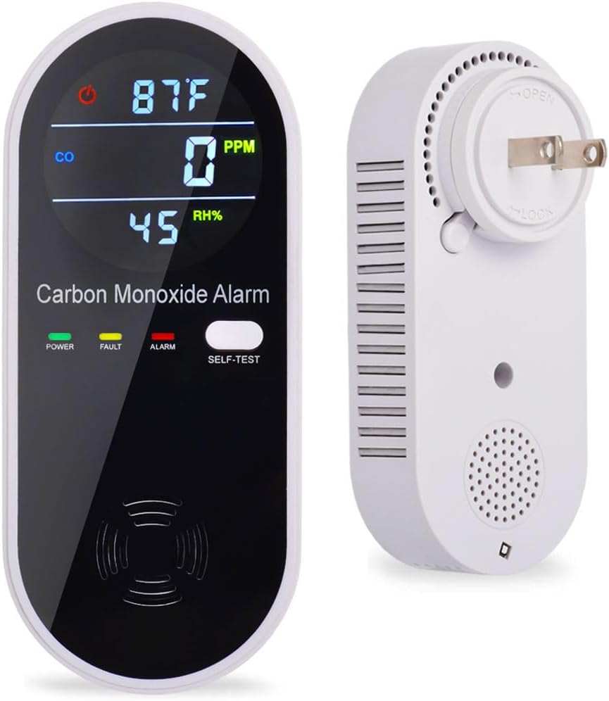 About this itemn3 In 1 Carbon Monoxide Detectors – Equipped with 3 major air indicators of Carbon Monoxide(0 to 1000PPM), Temperature(1 to 176 ?), and Humidity(0% to 95%RH) to protect your family.nAccuracy & Durability – This Carbon Monoxide Detector use ed Electrochemical Sensor, high reliability, more responsive, when the CO gas concentration reaches the alarm level(>150ppm), the Voice and SLight alarm will work.nEasy to Use – Plug and play, saving installation time.nCompact Design – Portable CO Gas Detector is small and light, can be carry to anywhere easily, Big color LCD display, The high-definition screen makes it easy to read even at night.nProtect Your Home – Carbon monoxide alarm are suitable for bedroom, kitchen, living room, bathroom, apartment, garage, office, restaurant, hotel, RV etc.nWorry-Free After Service – We are willing to provide you with unconditional returns and exchanges within 180 days. If you have any questions, please contact us by email, we will try our best to help you solve the problem.n See more product details