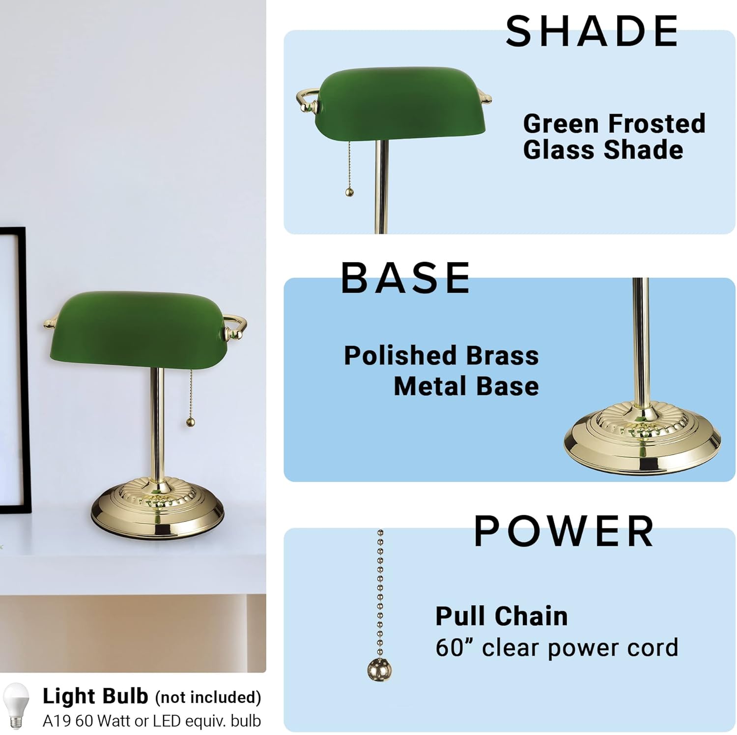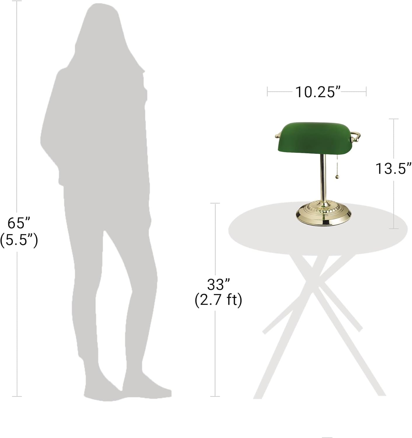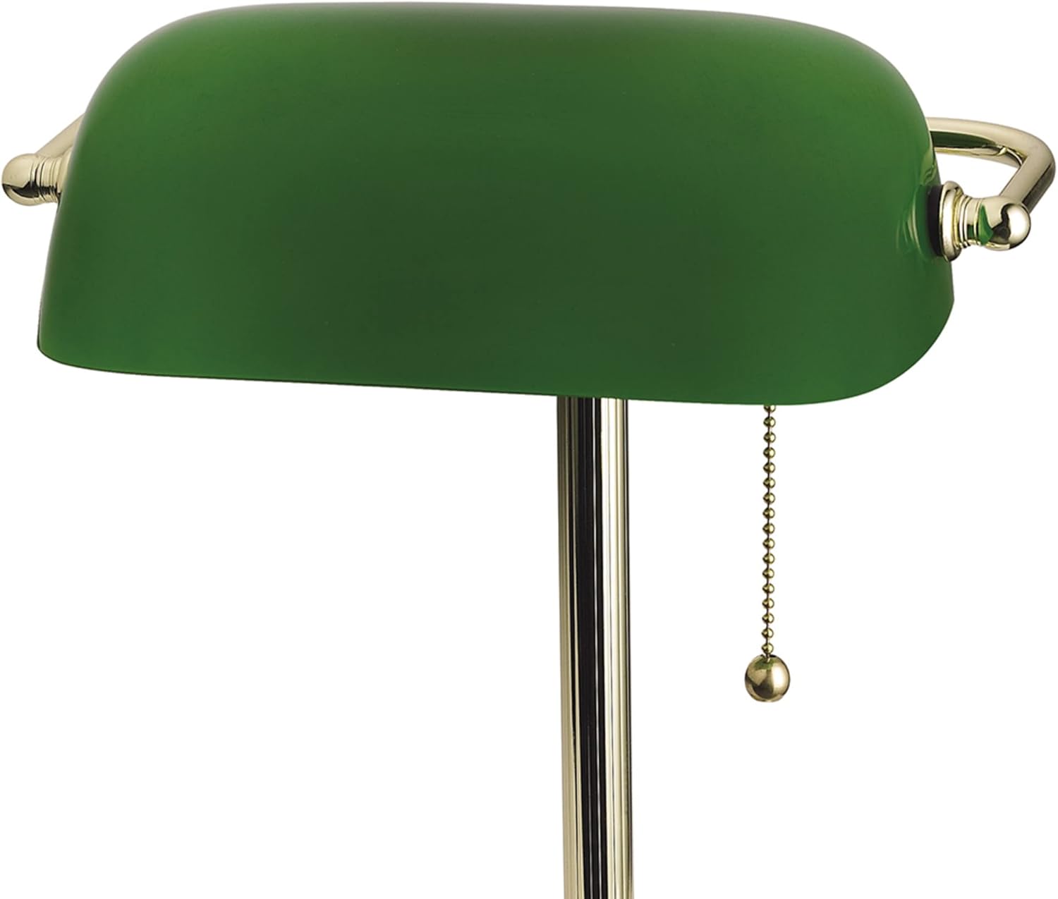 About this itemn· ELEGANT BANKER’S LAMP: A traditional desk lamp suitable for providing ambient lighting to your study, bedroom, living room, or anywhere else in your homen· CLASSIC DESIGN: Complete with an attached on/off pull chain under the shade, this lamp is reminiscent of a vintage bankers lamp with a brass-plated finish and adjustable frosted-glass green shaden· EFFICIENT LIGHTING: Compatible with A19/E26 60-watt lightbulb or the LED equivalent (not included)n· SMART HOME COMPATIBLE: Powered by a 60