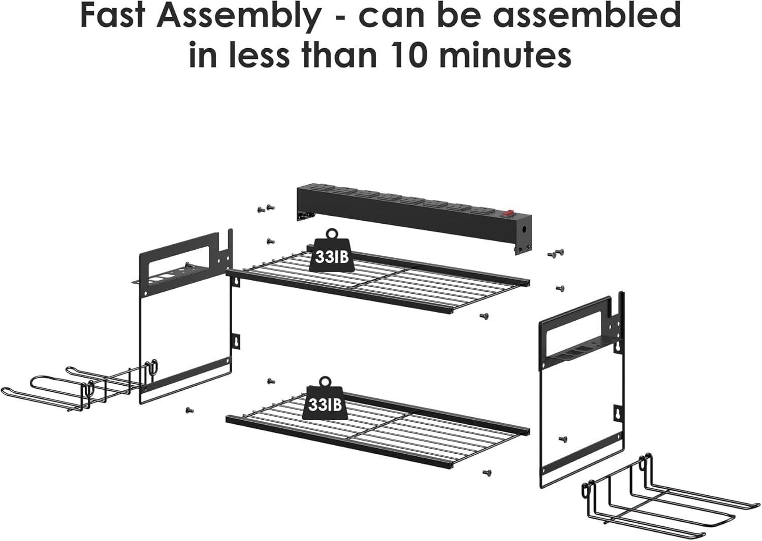 About this itemnOrganized Charging Station: This metal tool storage shelf with a built-in power strip offers a convenient all-in-one solution for charging power tools and batteries while keeping them neatly organized.nSpace-Saving Design: Measuring 30.9 x 16.9 x 9.37 inches, this compact unit features two shelves, 16 storage holes for tools of various sizes, and 4 drill holders, maximizing storage in a small footprint.nEasy Assembly and Mounting: With simple instructions and all necessary tools included, this shelf can be assembled in 10-15 minutes and easily mounted on the wall for added convenience.nCustomizable Look: Available in black, red, and yellow color options, you can choose the one that best complements your existing tools and garage decor.n See more product details