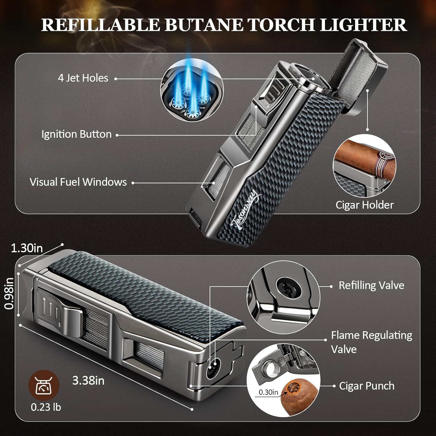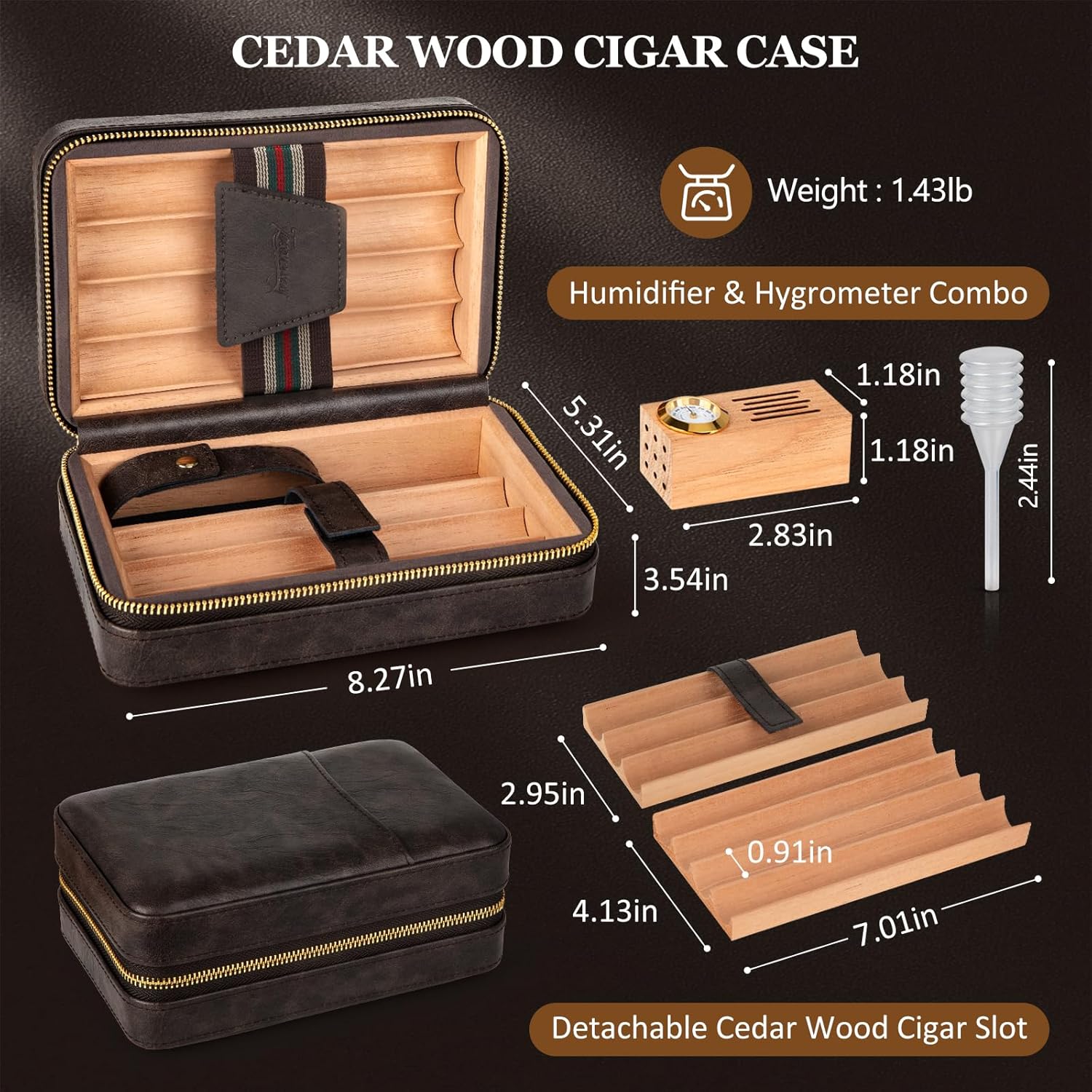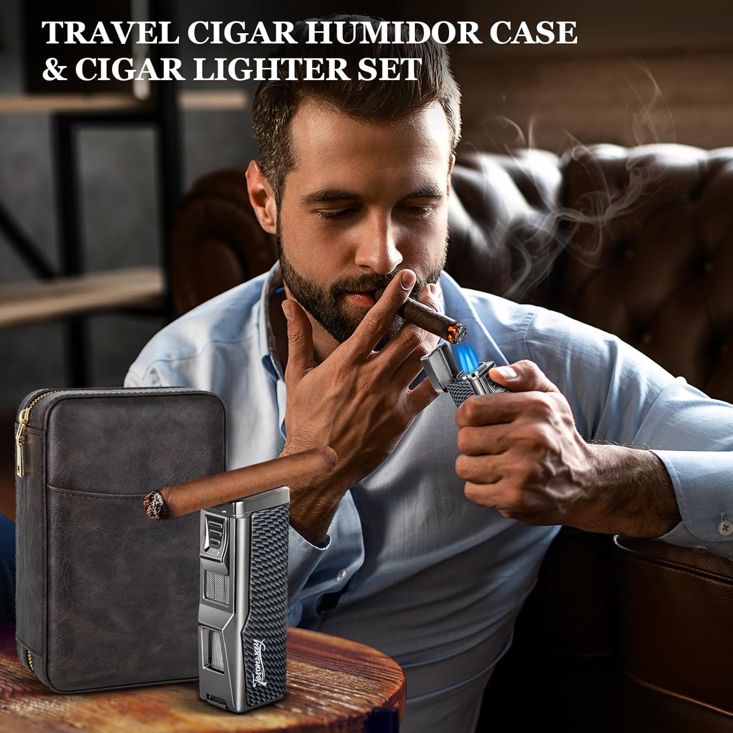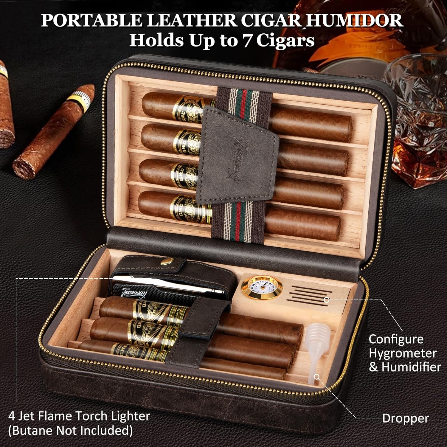 ?Leather Cigar Travel Case?Cigar Humidors are made of premium leather with cedar wood lining. The carefully selected premium leather has excellent flexibility and elasticity, is abrasion-resistant and breathable, and has a clear grain. The Spanish cedar wood lining gives off a natural aroma that enriches and mellows the flavor of the cigars. A removable hygrometer and humidifier are also included to ensure that your cigar collection is stored in an ideal context.n?Multi-Function Cigar Torch Lighter?Powerful four-jet flame lighters, its top safety cover is cleverly designed as a cigar holder to hold your cigar securely. The body has a visual fuel window to monitor the fuel level, a folding cigar punch at the bottom for fast and sharp cigar punching, and a flame adjustment valve to adjust the flame size to meet your needs in all aspects. (Note: Lighter does not contain butane)n?Detailed Design?The cigar humidor case and refillable butane lighters set are perfect for keeping your cigars fresh and flavorful for all your cigar enjoyment needs. Designed with a zipper-lock closure, the cigar cases provides a superior seal for the cigar storage environment, a removable cedar cigar tray inside easily separates the cigars, and a Velcro protective band prevents damage to the cigars due to humidor movement and bumps.n?Preferred Travel Cigar Humidor?Our portable travel cigar case with multi-functional butane torch lighter is perfect for enjoying your cigars while traveling, camping, or on the go. Compact and portable, this small humidor takes up less space and has a suitable storage space for up to 7 cigars, which is perfect for carrying around while ensuring that your precious cigars are safe and secure on the go, allowing you to enjoy the best flavor of your cigars at all times.n?Cigar Gifts for Men Unique?Specially made for cigar lovers, the cigar travel humidor and cigar butane lighter set is a perfect gift for cigar lovers on Father’s Day, Christmas, Birthdays, Anniversaries, and Valentine’s Day, adding more convenience to cigar lovers’ cigar experience. If you have any questions during the shopping process, please get in touch with us, we have sincere after-sales service.