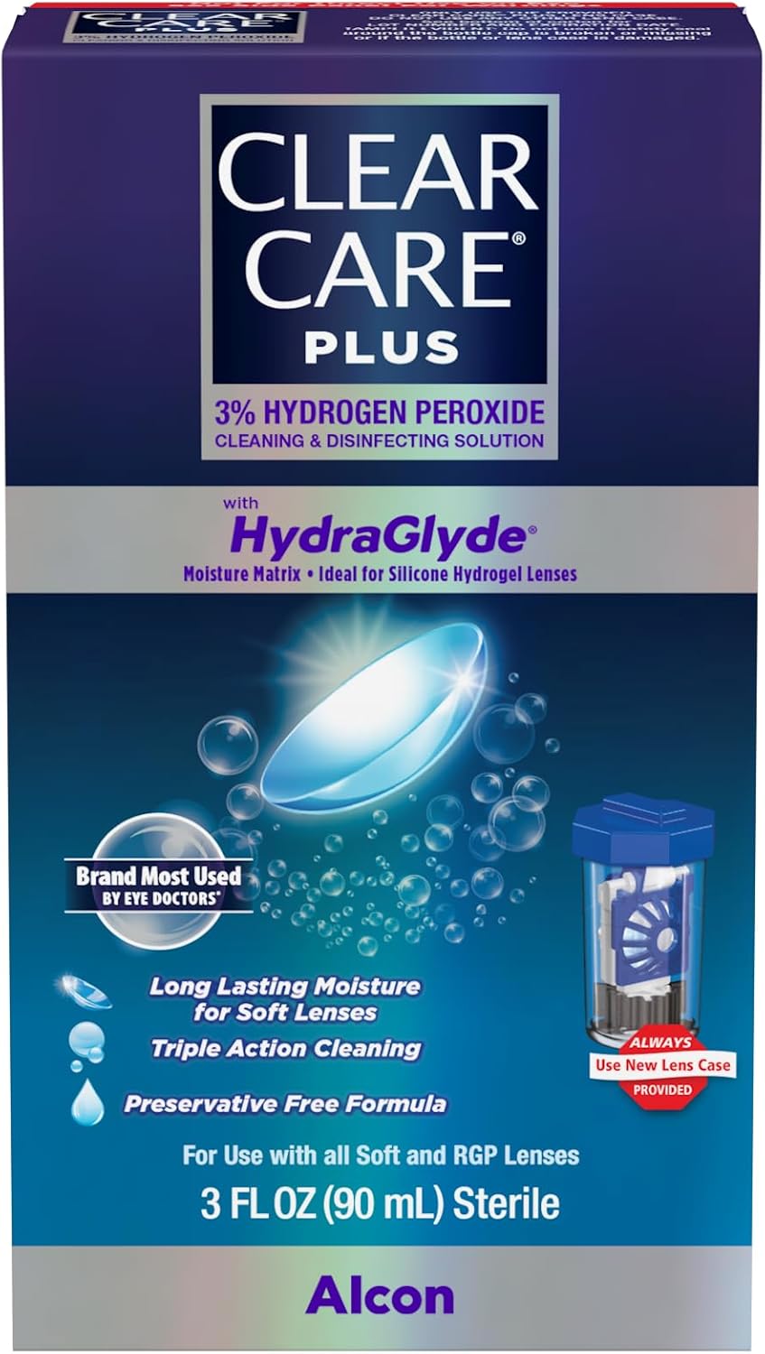 About this itemnNot only does Clear Care Plus Solution clean and disinfect your contact lenses with the bubbling power of hydrogen peroxide, it also surrounds your lenses with long-lasting moisturenPatented HydraGlyde Moisture Matrix wraps your soft lenses in long-lasting moisture for a fresh lens feeling Triple Action Cleaning loosens dirt, deep cleans and removes proteinnExclusive lens case features a platinum disc which activates our gentle, bubbling action and neutralizes our hydrogen peroxide into a gentle saline solutionnNever put Clear Care Plus Solution directly in or around your eyes. Follow instructions completely and do not skip any stepsnSafe for all Soft and Rigid Gas Permeable Contact Lenses