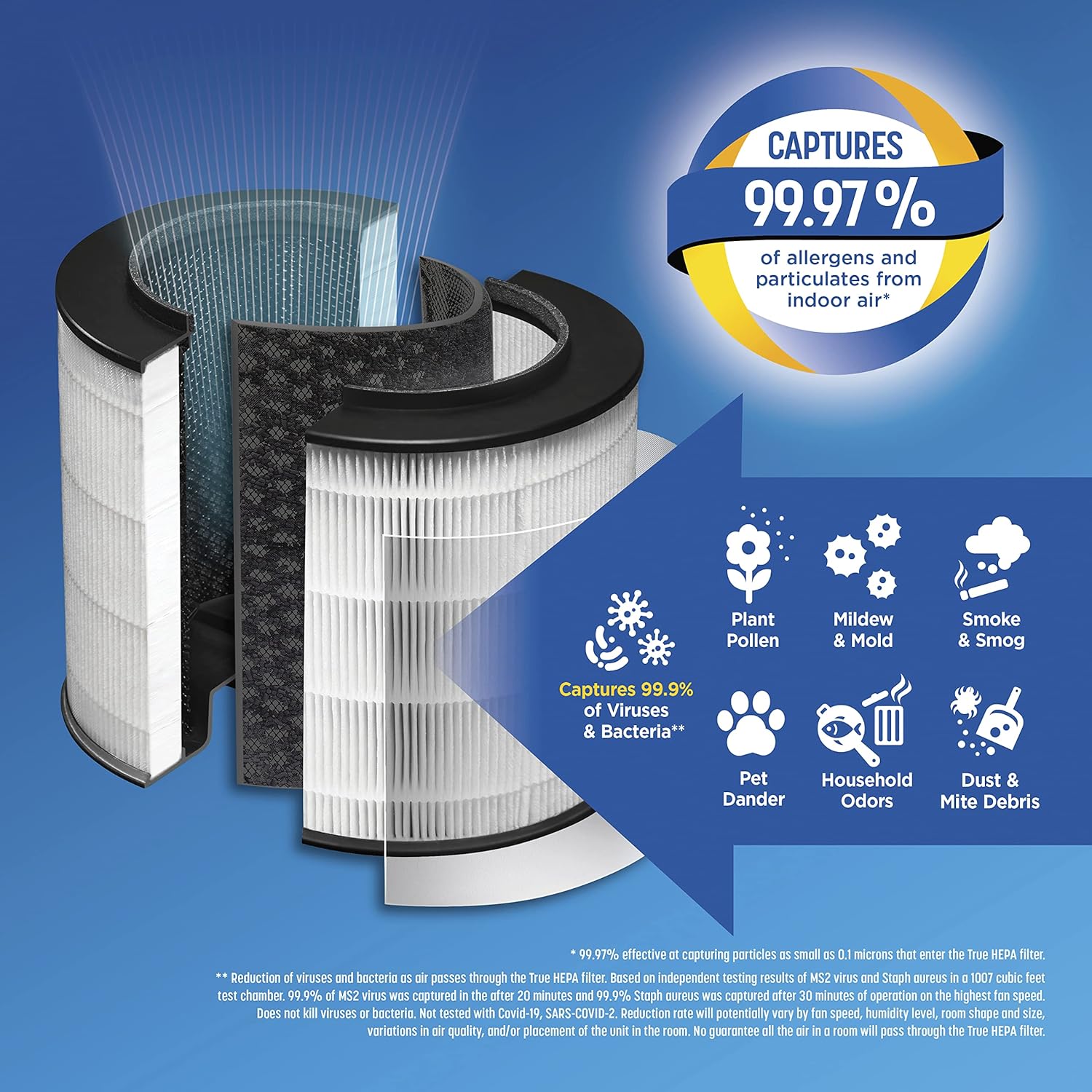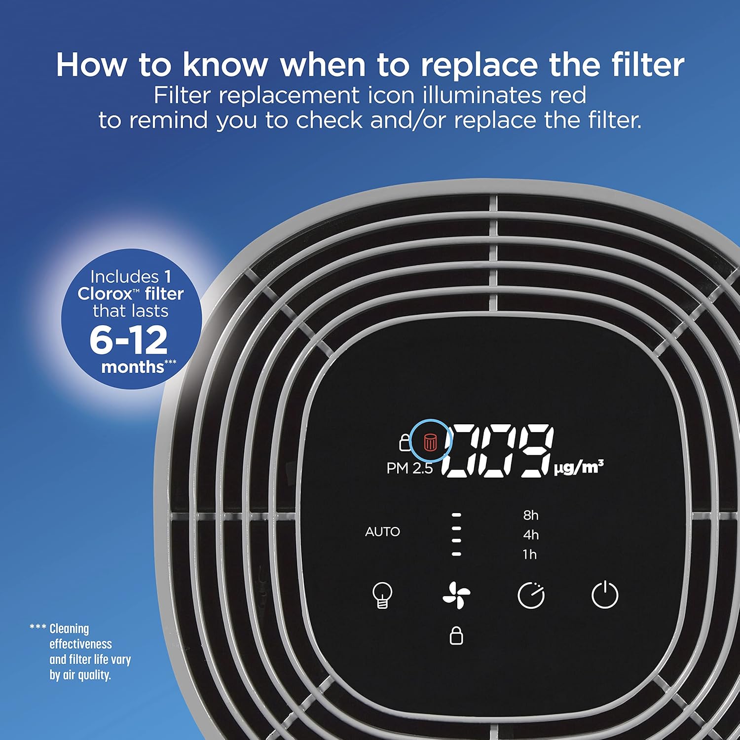 About this itemnCAPTURES 99.97% OF ALLERGENS AND PARTICULATES* AND REDUCES VIRUSES AND BACTERIA.** With the Clorox True HEPA Replacement Filter, you can breathe easier. It has True HEPA filtration to capture 99.97%* of particles as small as 0.1 microns and 2 additional filters to capture larger particles and odors.n3 STAGE 360° FILTER: Delivers 360° air purification by capturing allergens and particulates in 3 filter layers. The outside pre-filter catches large dust particles and pet hair, then the True HEPA filter captures 99.97%* of allergens and particulates. The active carbon filter reduces unpleasant odors to keep air smelling fresh.nREPLACEMENT FILTER FOR CLOROX MEDIUM ROOM AIR PURIFIERS: Fits Clorox Medium Room Air Purifier model # 11030 and Clorox Medium Room Smart Air Purifier model # 11031. Includes 1 Clorox filter that lasts 6-12 months.***nFAST, EASY INSTALLATION. Turn the air purifier over and twist to pull out the true HEPA filter for easy replacement it’s that easy.nHOW TO KNOW WHEN TO REPLACE THE FILTER. Filter replacement icon illuminates red to remind you to check and/or replace the filter. It is recommended that you replace the filter every 6-12 months.n* 99.97% effective in capturing particles as small as 0.1 microns that enter the true HEPA filter.n** Reduction of viruses and bacteria as air passes through the true HEPA filter. Actual % of reduction varies. Does not kill viruses or bacteria.n*** Cleaning effectiveness and filter life vary by air quality.n See more product details