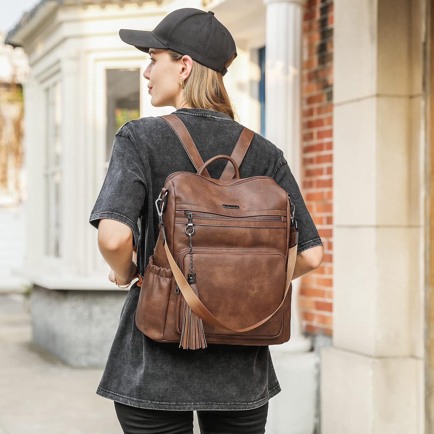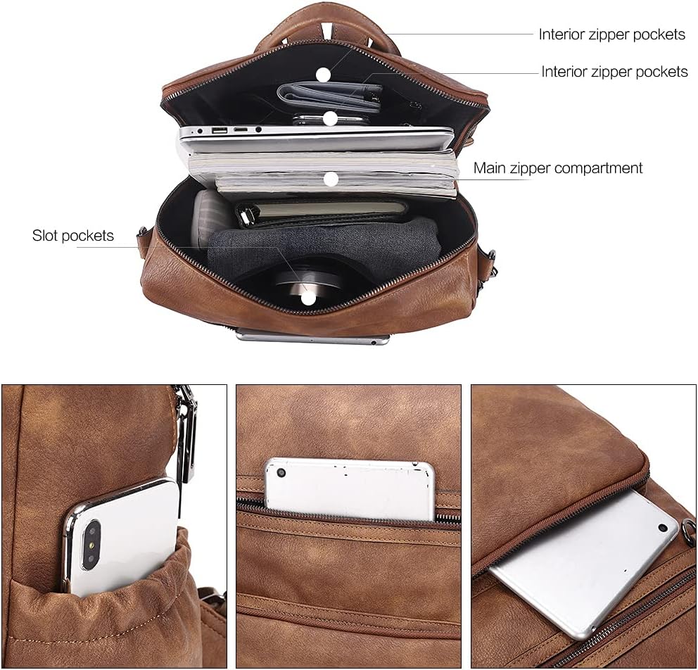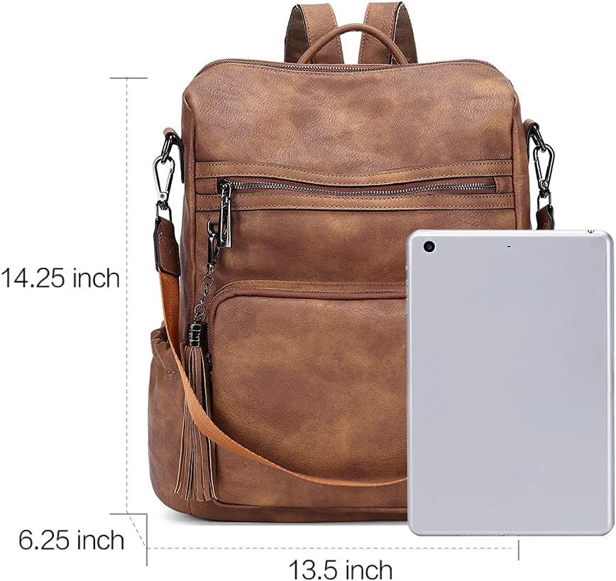 High-end Material: Travel backpack are made of high-quality PU leather material with reinforced stitching, gun-tone hardware, soft fabric lining, delicate tassel designed for fashion appearance and adjustable canvas shoulder straps for convenience.nMultiple Compartments?1 main compartment with 2 inner zipper pockets, 2 inner slot pocket, 2 front zipper pockets, 2 side pockets and 1 back zipper pocket. Different sizes pockets are enough for you to hold your items like 14