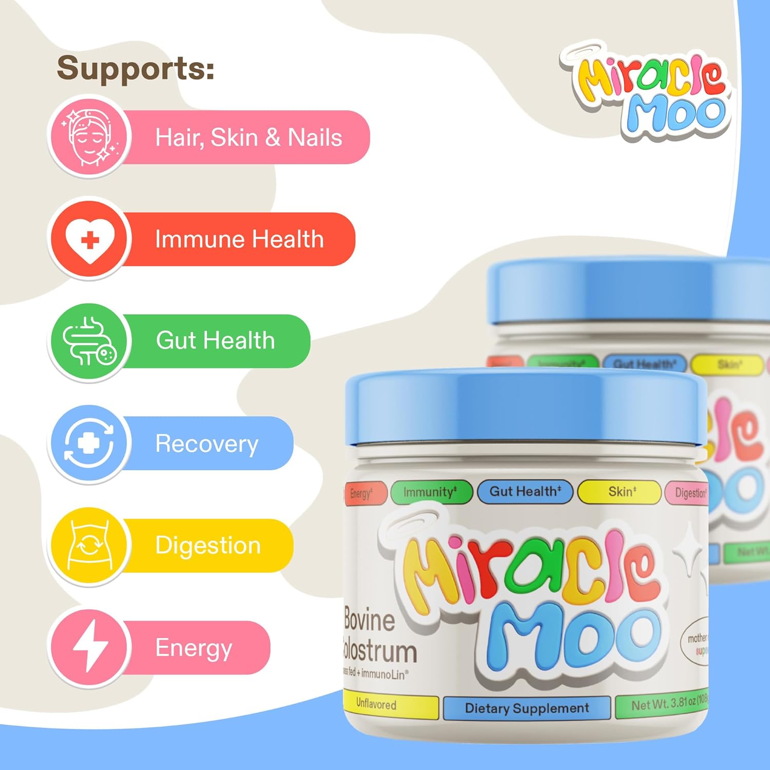 About this itemn?? MIRACLE MOO PREMIUM COLOSTRUM: Experience our remarkable colostrum powder with an extraordinary IgG content and ImmunoLin IgGs, vital immunoglobulins, profoundly support immunity, fortify the gut, and foster holistic well-being. Embrace utmost quality with our elite colostrum, a promise of proven outcomes.n?? REVOLUTIONARY IMMUNOLIN: The ONLY colostrum containing ImmunoLin to take your colostrum to the next level. Harness the power of IgG rich, immune supporting ImmunoLin. This ingredient took 35 years of research culminating in High-IgG ImmunoLin. Support your gut health, unlock wellness and fortify your immunity and curb inflections. Including hair, skin, and nails supporting vitamins.n?? POWERED BY OUR COMMITMENT TO QUALITY: Miracle Moo offers a nourishing blend designed to complement your wellness routine. Support your digestive health, muscle recovery efforts, and your immune system with our Colostrum and ImmunoLin formula. Ignite your well-being and maintain focus to support your mind and body daily.n??EASY MIXING: Simply mix a scoop of Miracle Moo into water, smoothies, or your favorite recipes. Seamlessly incorporate the power of nature’s superfood: colostrum into your daily routine and elevate your wellness journey.n??GRASS FED PREMIUM COLOSTRUM: Embarking on excellence, MiracleMoo procures pristine colostrum from USA’s grass-fed cows thriving on family-owned dairy farms. Our commitment to conscious sourcing shines. We select surplus colostrum exclusively, ensuring the nourishment of young calves before collecting this unparalleled resource.