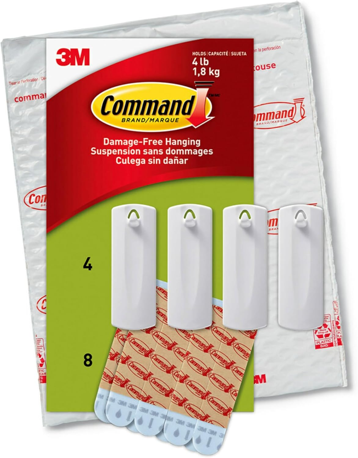 About this itemnINCLUDES- 4 white hangers, 8 large strips; 1 hanger holds 4 lbsnDAMAGE FREE HANGING: Wall hooks for hanging frames with sawtooth backs work without leaving holes, marks or sticky residue on a variety of surfaces without toolsnWORKS ON A VARIETY OF SMOOTH SURFACES: 3M Picture Hangers work on a variety of smooth surfaces, including painted walls, finished wood, painted concrete cinder blocks, laminate, glass, metal and tilesnSURFACE PREP: Clean with rubbing alcohol to remove grime and dust to allow the tool free wall hangers to bond to the surface; the indoor temperature must be between 50 degrees Fahrenheit and 105 degrees FahrenheitnUSAGE TIPS: Wait seven days after painting before using the picture hanging hooks to allow paint to cure; do not hang over beds or on wallpaper; do not use the wall hangers for hanging valuable itemsnEASY CLEAN REMOVAL: Lightly hold the top of the wall adhesive strip and slowly pull straight down towards the floor to remove the Command Picture Hangers and prevent damage of surfaces; reuse your hook again by purchasing large indoor Command Refill Stripsn› See more product details