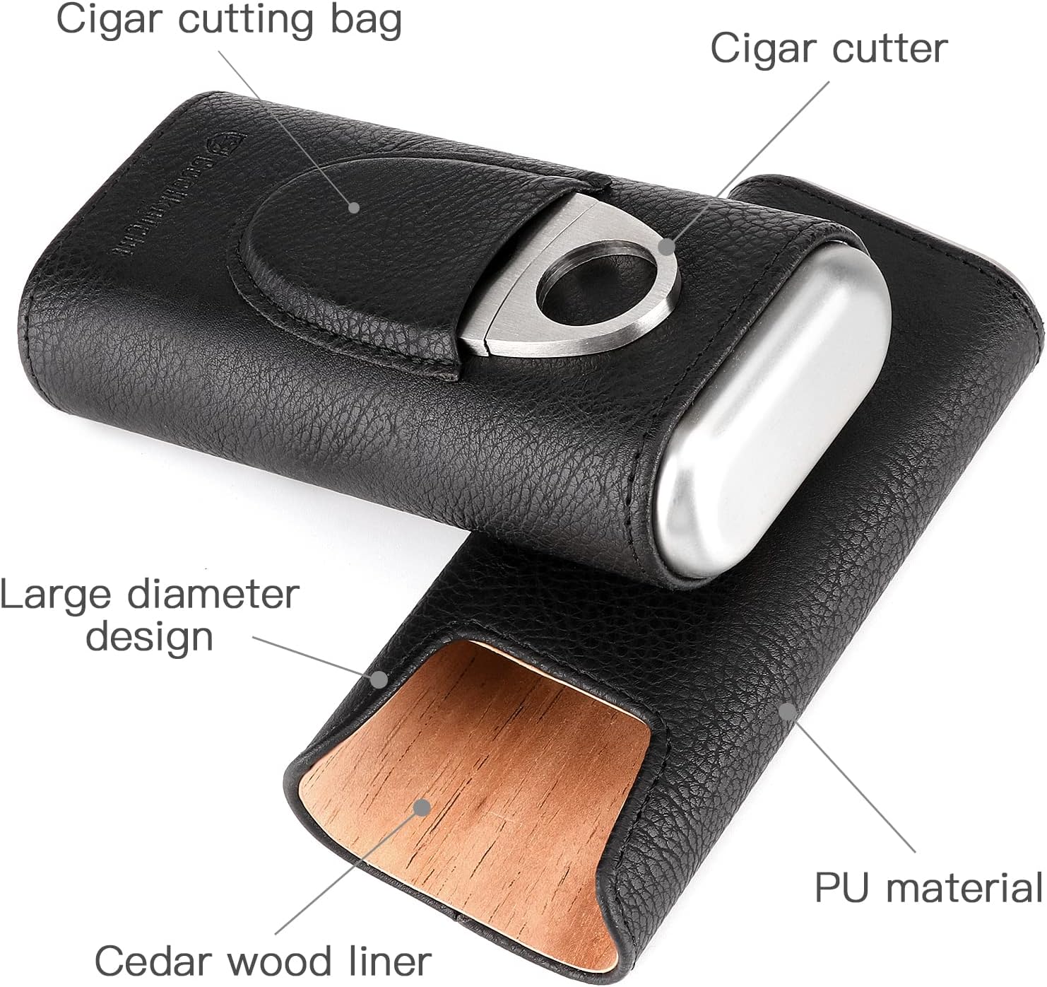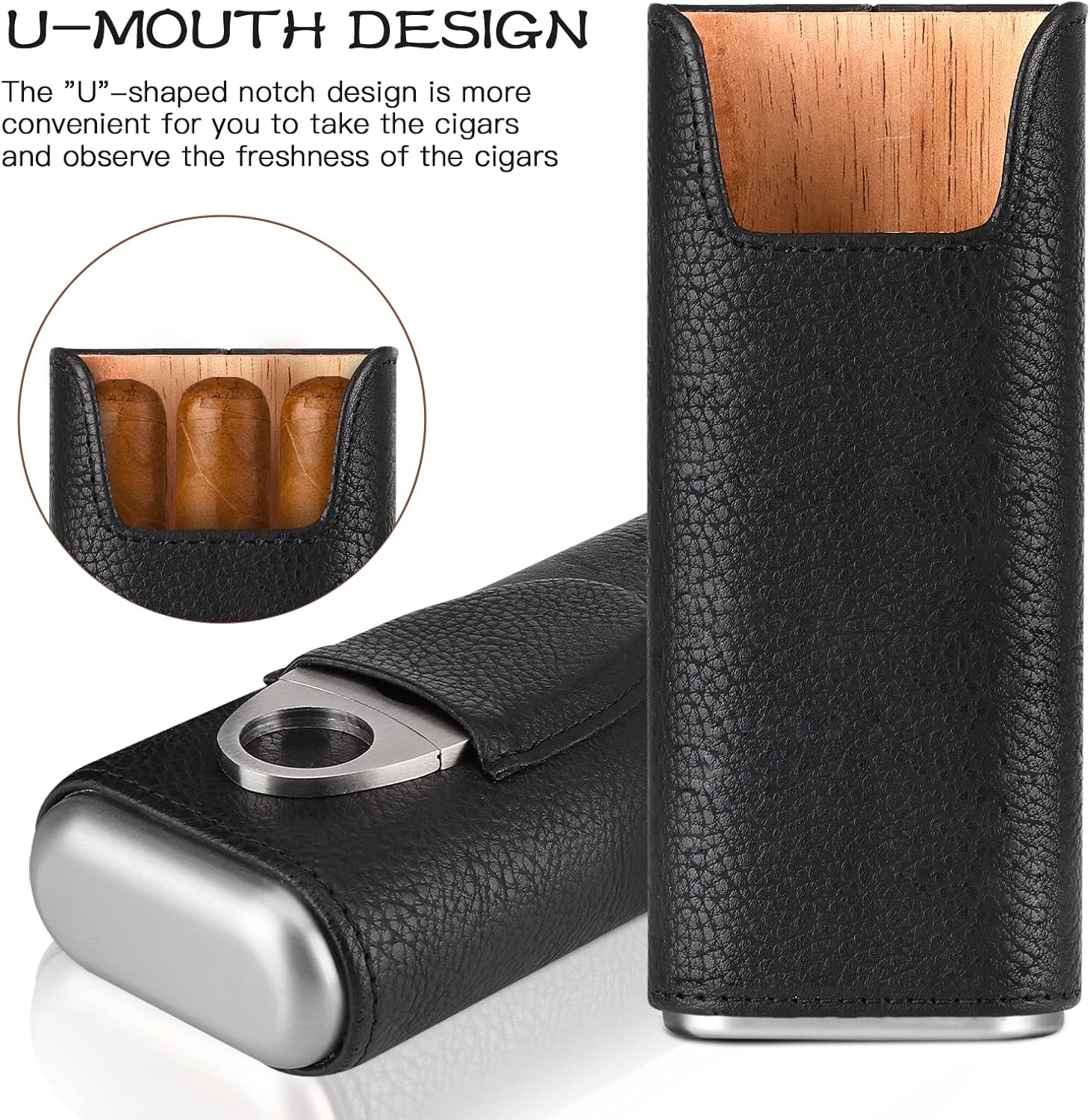 Spanish Cedar Wood: Spanish cedar wood lining. The inside of the cigar box is protected by cedar wood with good moisture and air permeability, which effectively keeps the cigar fresh, and its woody special smell can also promote the alcoholization of the cigar.nFashionable Portable Cigar Box: The portable cigar humidor is made of high-quality PU leather, which is exquisite in appearance, light and portable. This cigar travel case can store three precious cigars while you travel. It is very suitable for travel, restaurants, meetings or golf.nCigar Accessories: Our portable cigar case is equipped with a cigar cutter, made of 420 stainless steel. It is very durable. When not in use, can put the knife in the front pocket of the cigar humidor.nThe Perfect Gift Set: It is an excellent gift for husband, boyfriend, groomsman, boss, father, any cigar lover on Father’s Day, Birthday, Anniversary, Valentine’s Day, Christmas, Thanksgiving, New Year and other holidays.nAfter-Sales Serve: If you are dissatisfied with them for any reason or encounter any trouble during use, please contact us in time. We will provide you with the best solution.