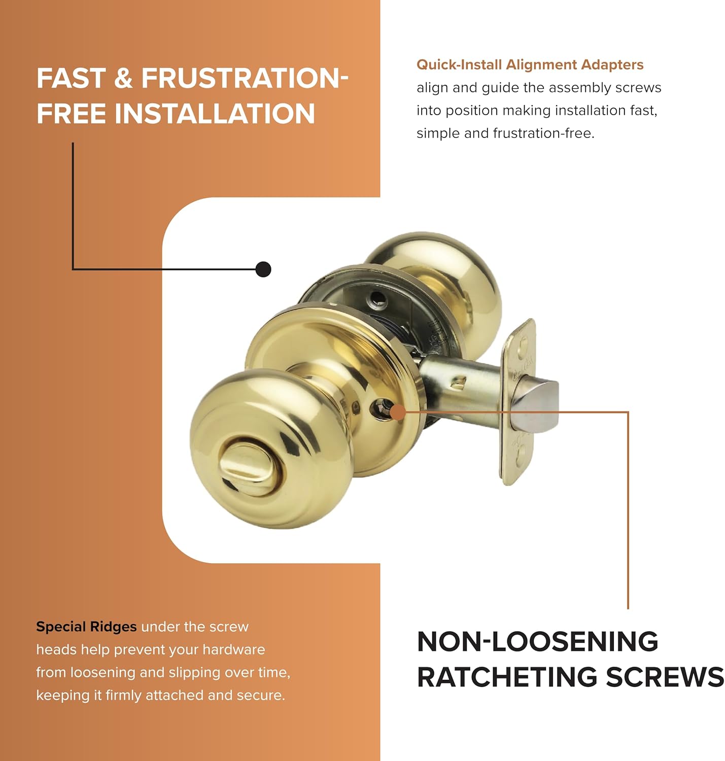 About this itemnELEGANT DESIGN – These Copper Creek bedroom and bathroom door knobs feature round corner adjustable latches, decorative rosettes, and a polished brass finish, perfect for enhancing your aesthetic when upgrading, remodeling, or building a new homenPRIVACY DOOR KNOBS – Ideal for bedroom and bathroom use, these locking door knobs feature an exterior privacy release button and operate with coin or standard screwdriver and no privacy key requirednSAFE AND SECURE – Each door knob has a security rating of ANSI 156.2 Grade-3 and features durable nickel plated bolts with a solid steel chassis, latch face, and strikes for unbeatable strength, security, and durabilitynDURABLE ALL METAL CONSTRUCTION – Made with high quality materials, these door knobs feature solid brass cylinders, heavy duty steel latches, and nickel plated bolts that are durable against wear and tearnEASY INSTALLATION – The Quick-Install Alignment Adapters guide the assembly screws into position for simple, fast installation while the Non-Loosening Ratcheting Screws keep the door knob hardware steady and securely attachedn See more product details