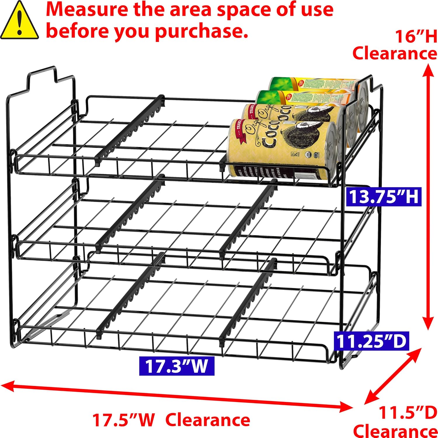 About this itemn[For Best Fitting Result & Optimal Usage] – Ensure you have at least 17.5 inches of width, 11.5 inches of depth, and 16 inches of height available in your chosen location, cabinet or pantry shelf.n[ Product Dimension ] 17.3 W x 11.25 D x 13.75 H inches. | Minimum Clearance Required – 17.5 W x 11.5 D x 16 H inches. | USPTO Patent No: US10051979B2.nSTACKABLE DESIGN: get multiple sets and stack them together to hold more cans.nSpacious & Roomy – store up to 36 can or variety size can/jars | Adjustable & Versatile – Six adjustable plastic dividers get different size can, jars,beverage can aligned and organized.nAssembled in a minute and no hardware needed, sturdy construction, this is a large rack for your pantry room please make sure have enough space on the shelf or countertop to utilize it.