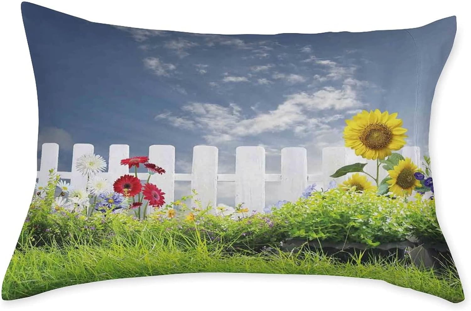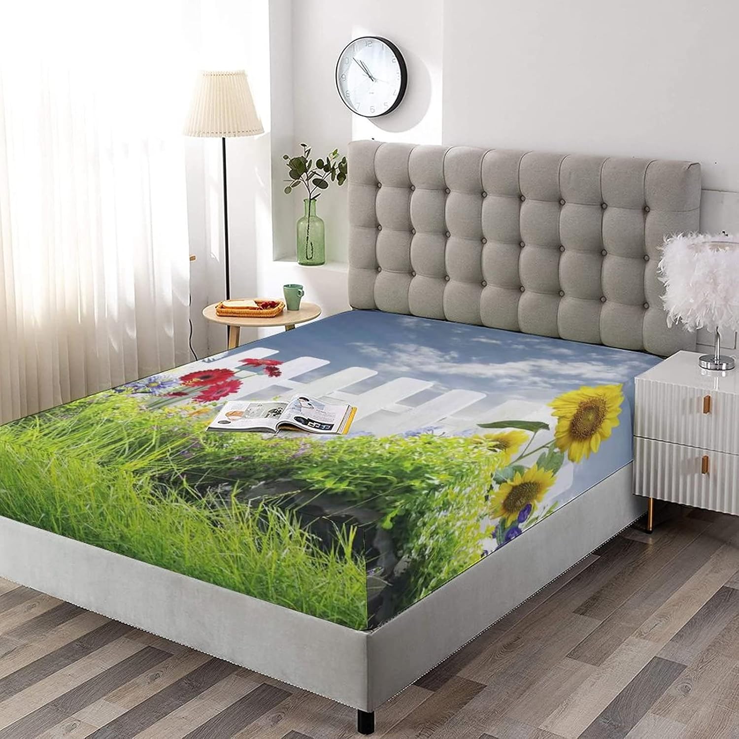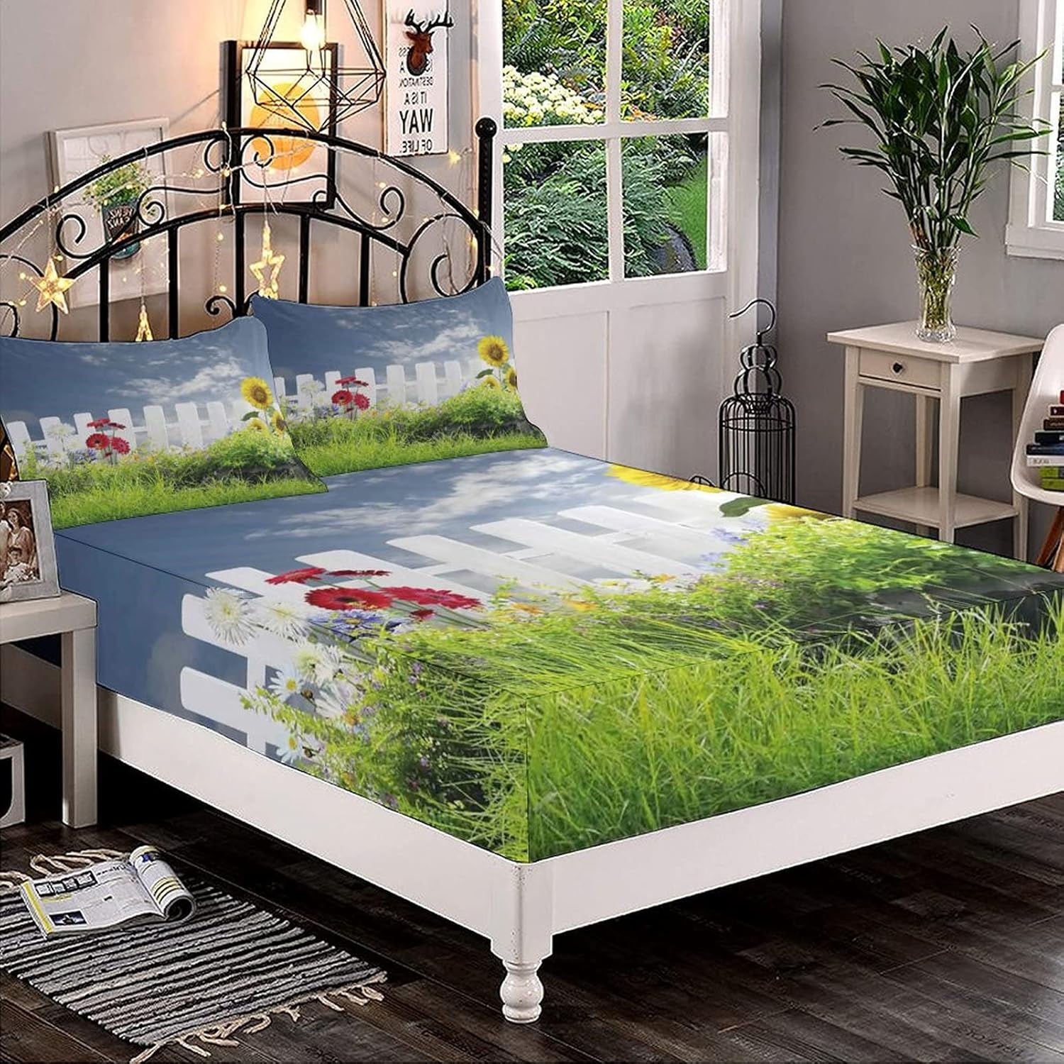 Decorative Bedding Sheet Set Twin XL Size, Farm Deep Pockets Fitted Sheet & 2 Pillow Sham Set, Grass Foliage Field with Sunflowers Daisy Hedge Fence Print Microfiber 3pc Bed Sheets Set