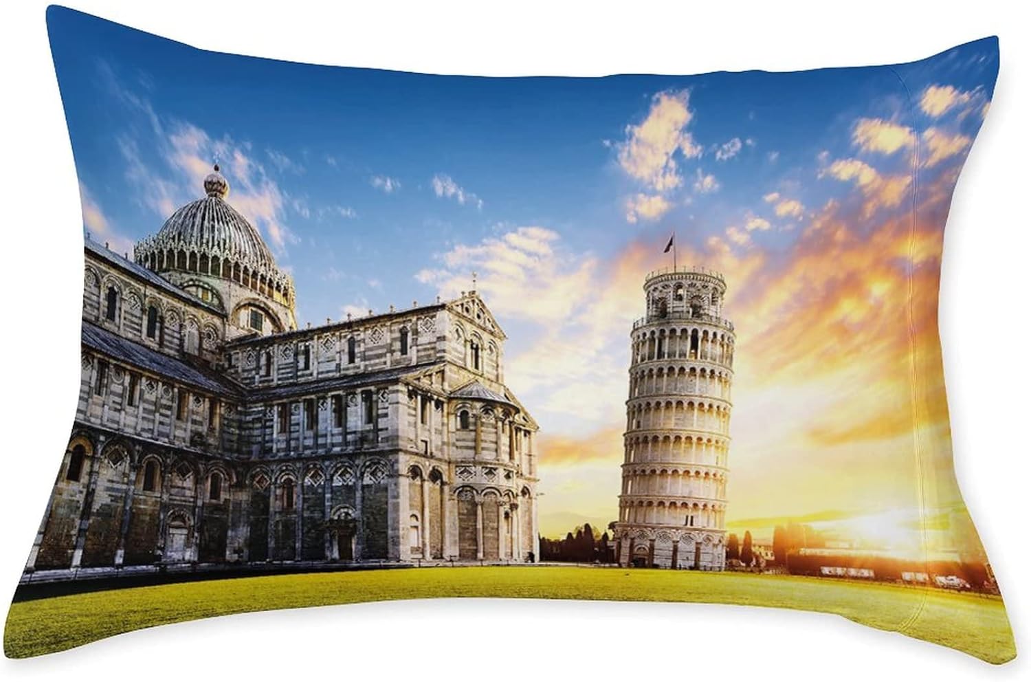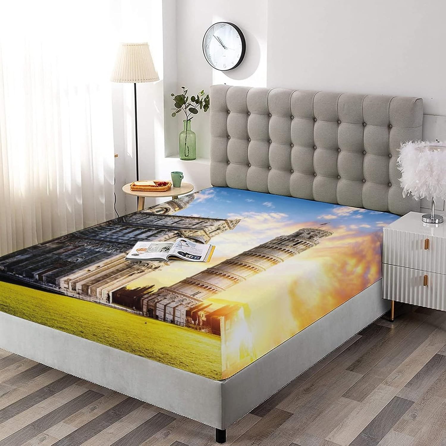 Decorative Bedding Sheet Set Twin XL Size, Italy Deep Pockets Fitted Sheet & 2 Pillow Sham Set, Miracoli Complex with The Leaning Tower of Pisa Print Microfiber 3pc Bed Sheets Set