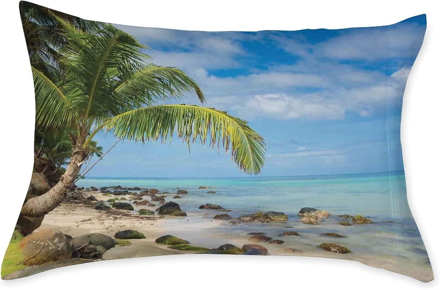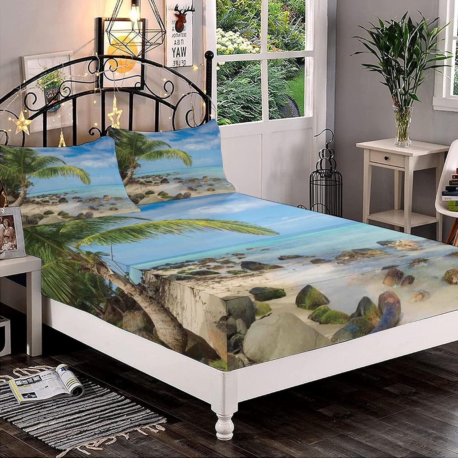 Decorative Bedding Sheet Set Twin XL Size, Seaside Deep Pockets Fitted Sheet & 2 Pillow Sham Set, Romantic Beach Palm Trees on Caribbean Island Print Microfiber 3pc Bed Sheets Set