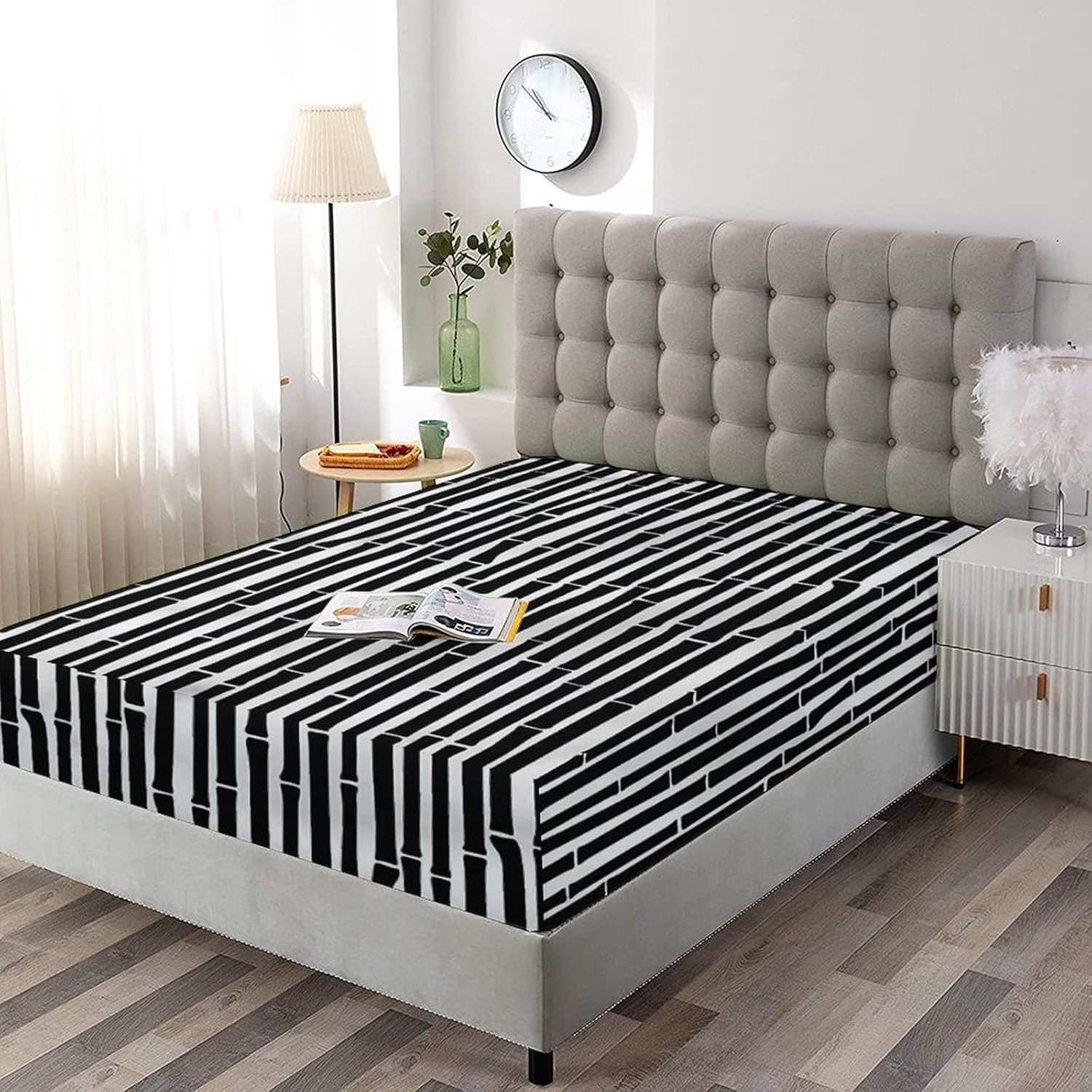 Decorative Bedding Sheet Set Twin XL Size, Tropical Deep Pockets Fitted Sheet & 2 Pillow Sham Set(No Flat Sheet), Black and White Stems Print Microfiber 3pc Bed Sheets Set, for Women & Men Bedding