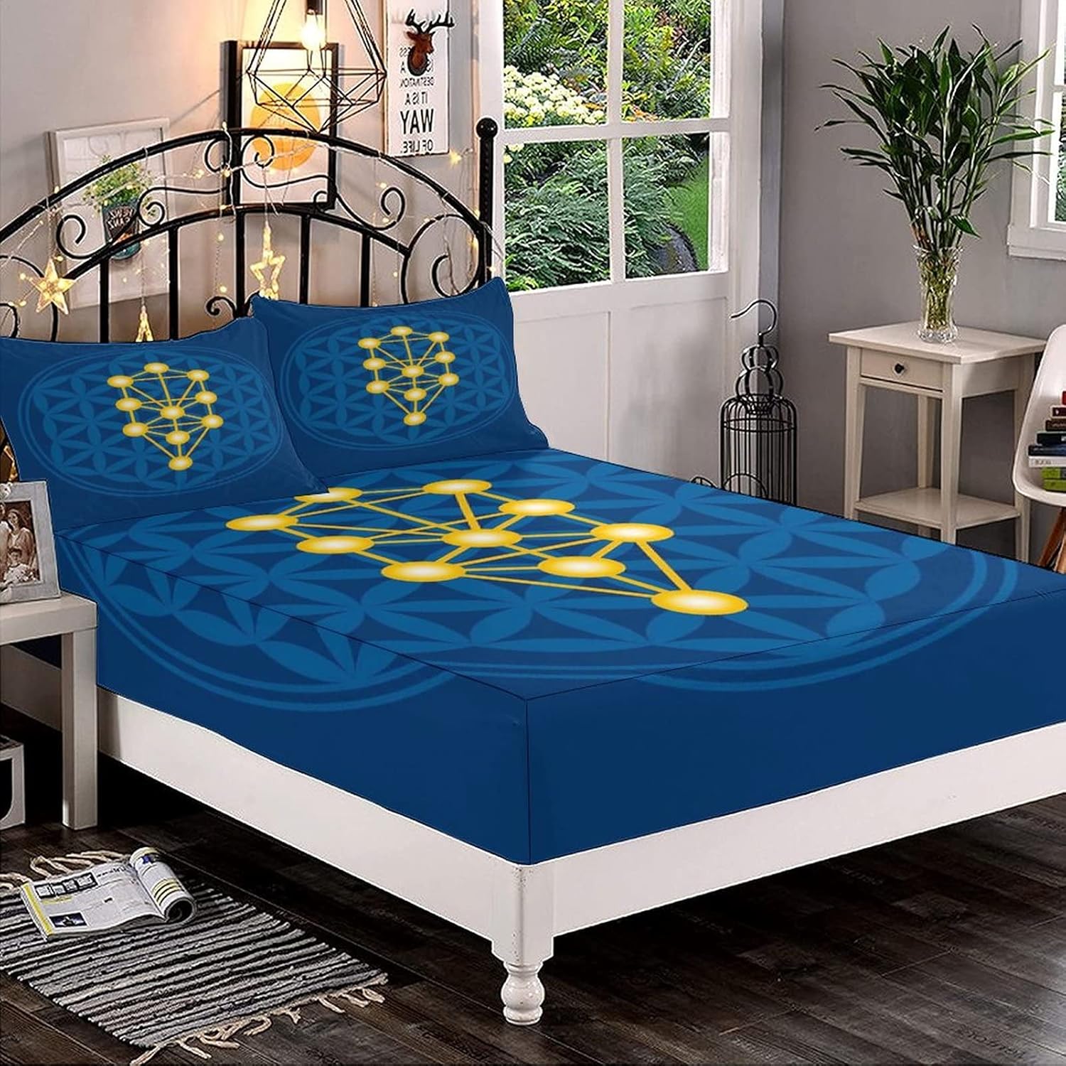 Decorative Fitted Sheet Set Twin Size, Egyptian Deep Pockets Fitted Sheet & 2 Pillow Sham Set, Spiritual Symbol over Flower of Life Ancient Abstract Printed Microfiber Bedding 3pc Set,for Mattress