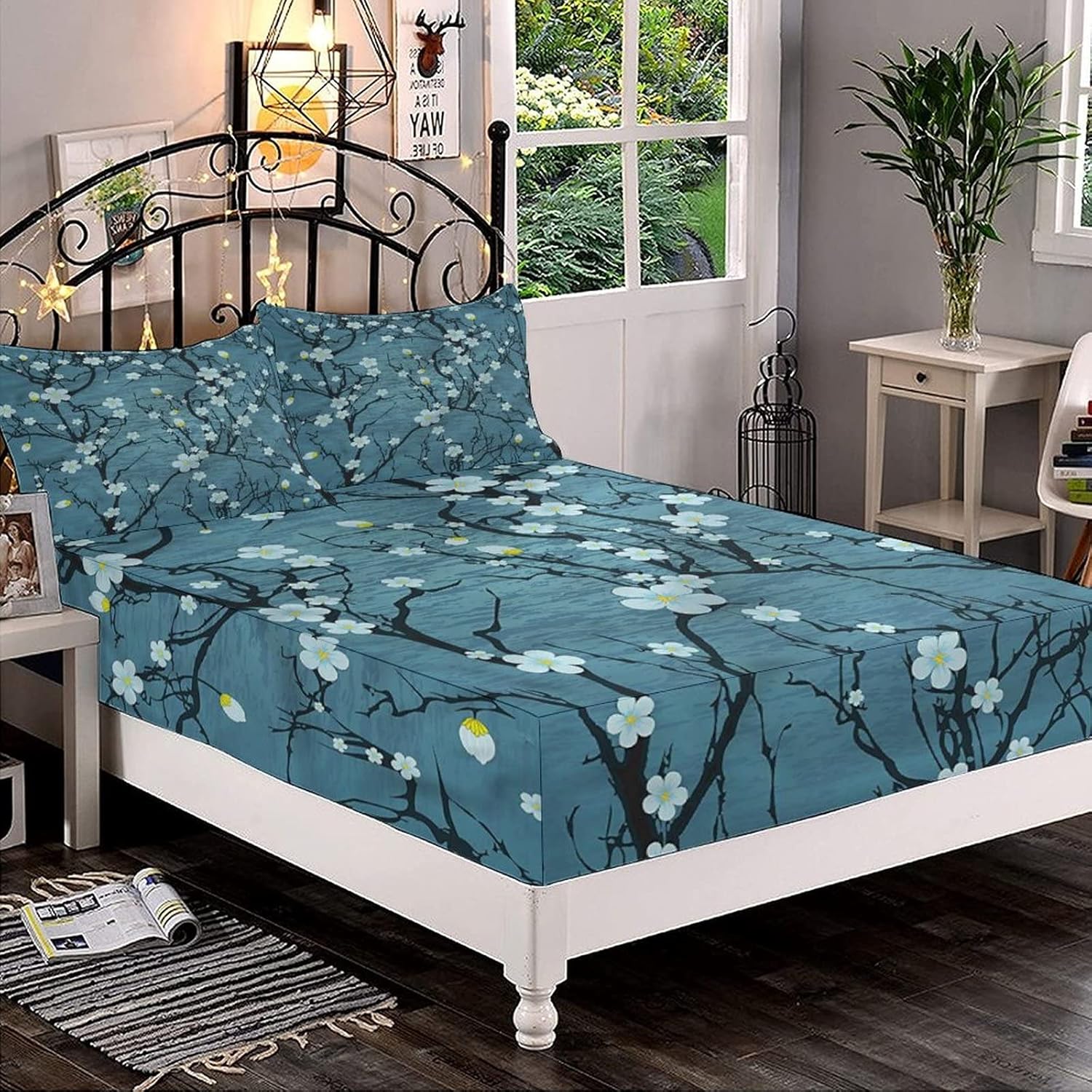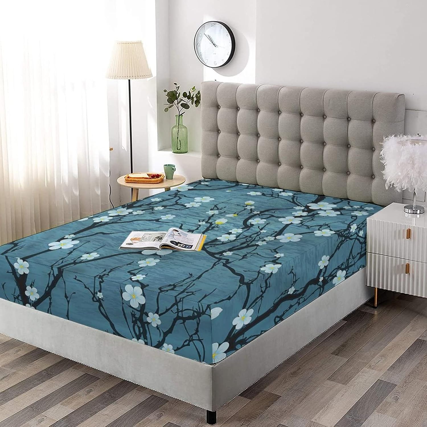 Decorative Fitted Sheet Set Twin Size, Floral Deep Pockets Fitted Sheet & 2 Pillow Sham Set(No Flat Sheet), Sakura Cherry Tree Branches Printed Microfiber Bedding 3pc Set, for Mattress (Deep: 5