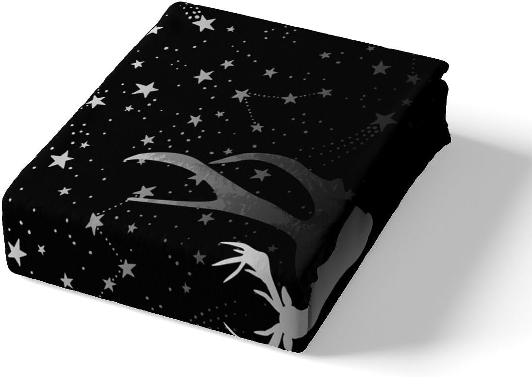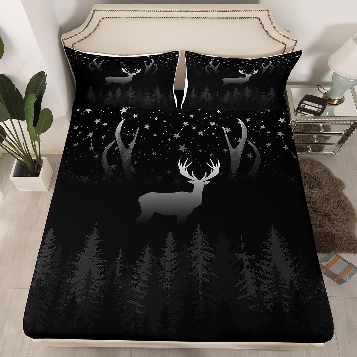 Deer Silhouette Fitted Sheet Full Size Pine Tree Jungle Animals Plants Print Bedding Set 3Pcs,Black White Starry Sky Night Bed Sheet Hunting and Adventure Camper Deep Pocket Sheet,2 Pillowcases