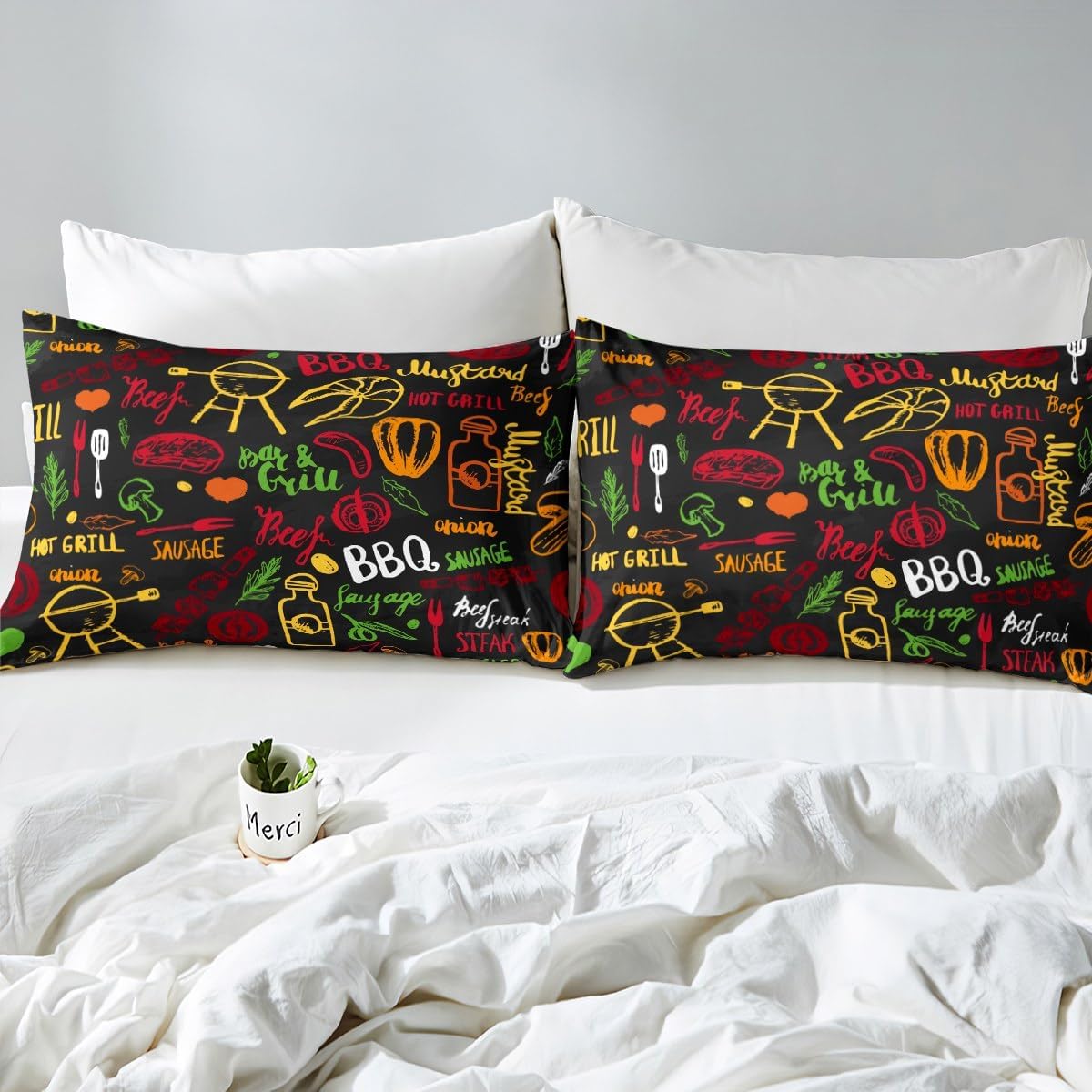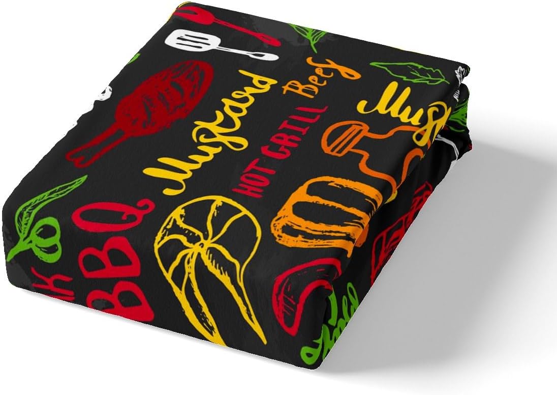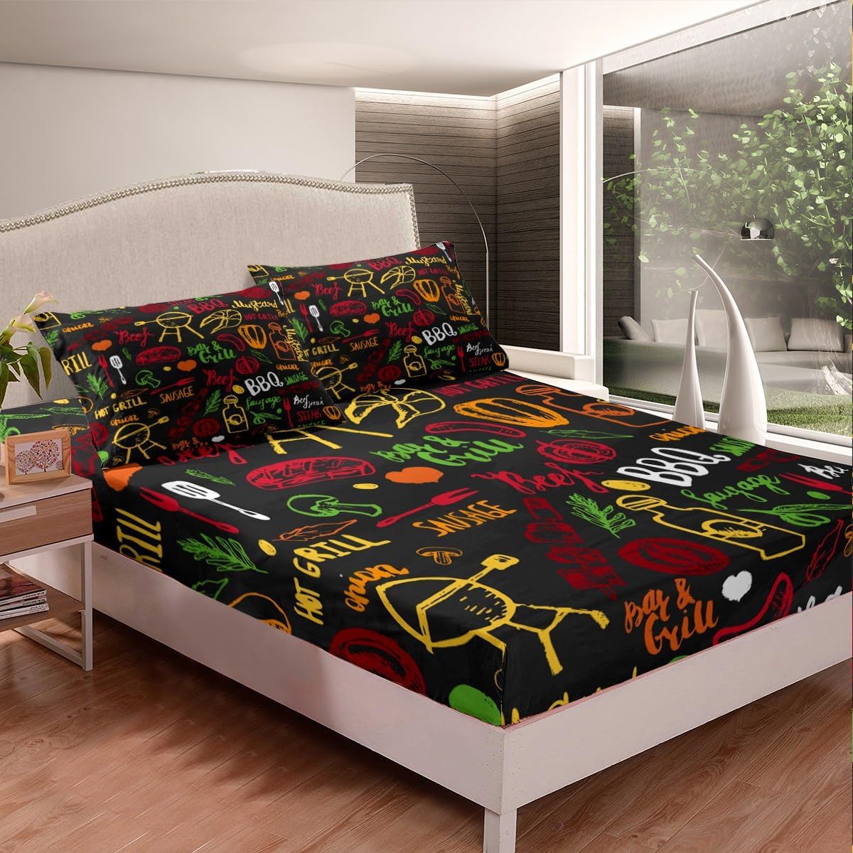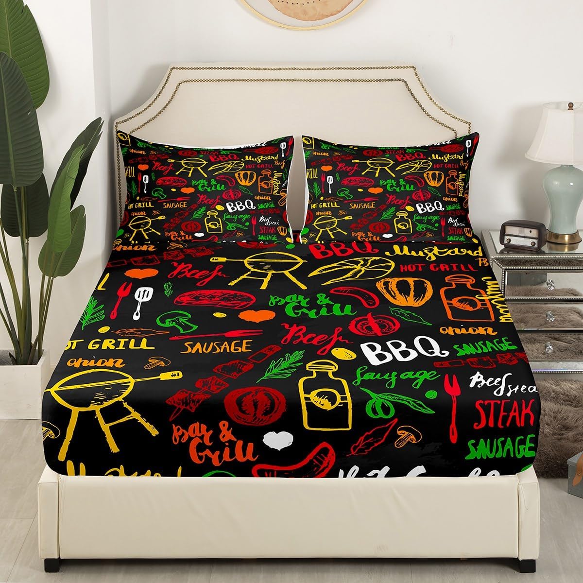 Delicious Food Bed Sheet Set Hand Draw Meat Fruits Food Fitted Sheet for Ultra Soft Barbecue Bedding Cover Set Room Decor Queen (No Flat Sheet)