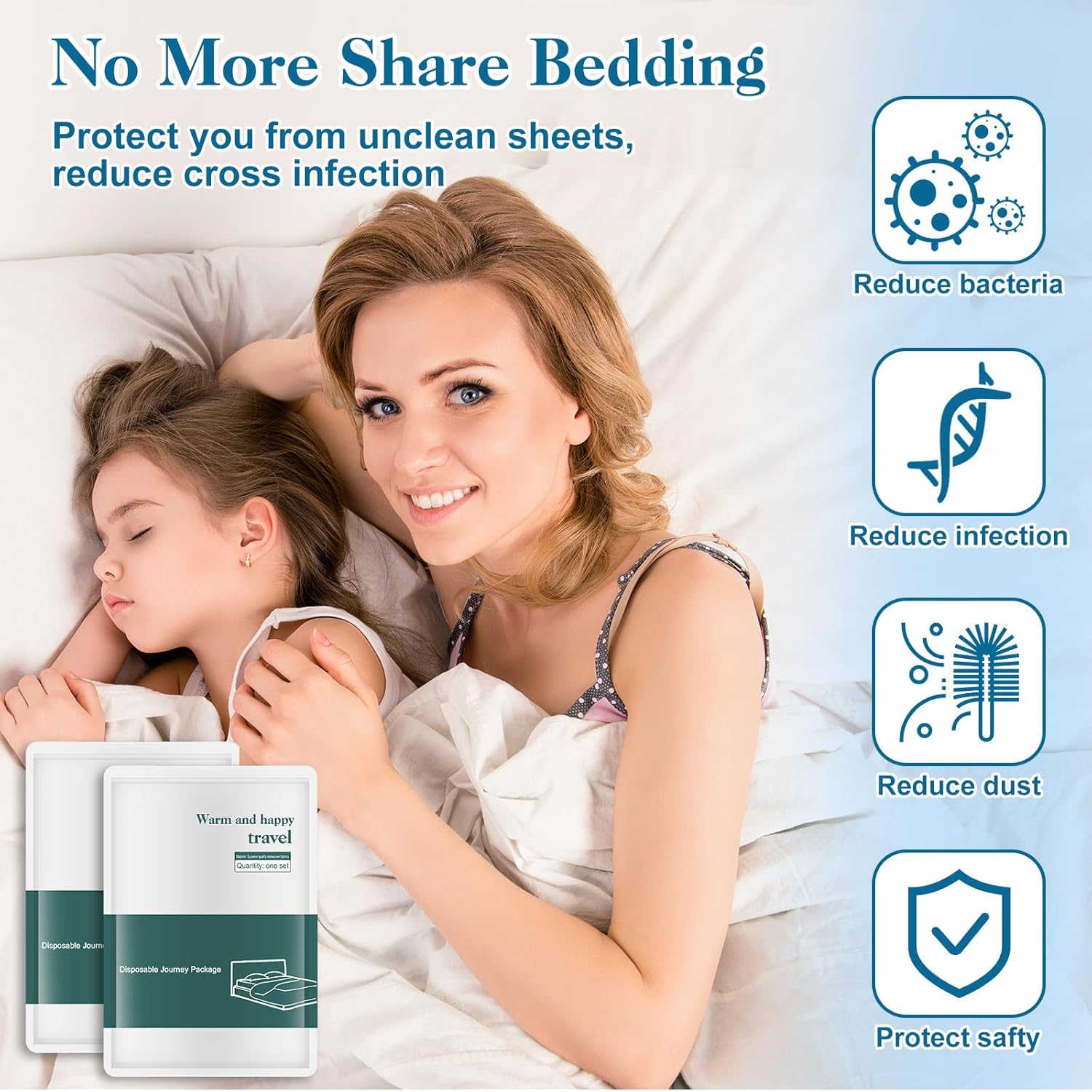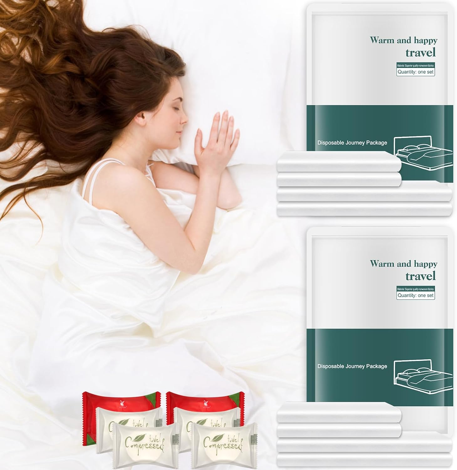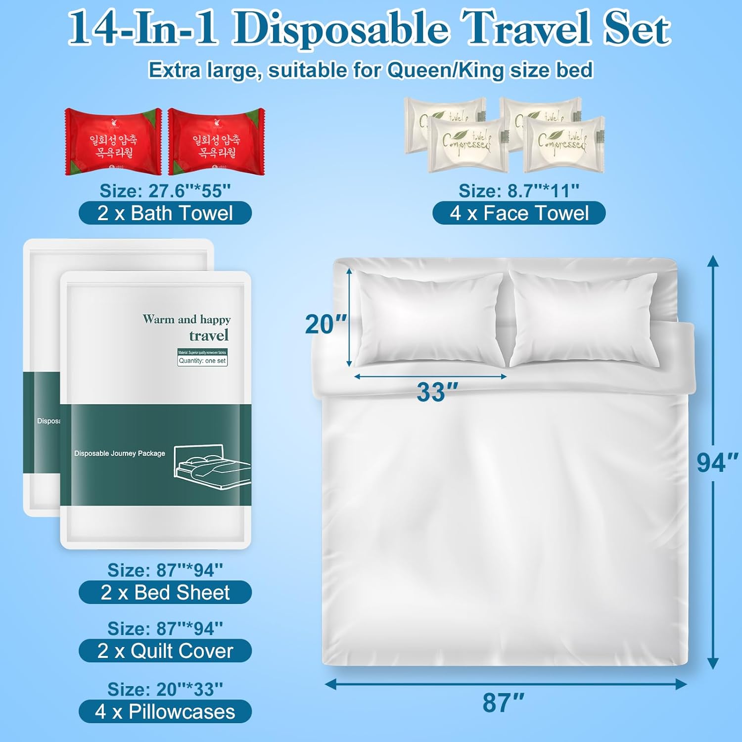 About this itemnGenerous Size and Versatility: Comkrivy 14 Pcs travel bedding set includes 2 oversized disposable bed sheets (87×94 inches), 2 quilt covers (87×94 inches), and 4 pillowcases (20×33 inches), ideal for most hotel and standard, king and queen bed sizes. It also comes with 4 face towels and 2 bath towels, perfect for various settings, including home visitors, hotels, vacation rentals, hospitals, massages, camping trips, daycare cot and more.nHigh-Quality Material: Crafted from premium thick non-woven fabric, our disposable bed sheets for travel are soft, breathable, and durable. It’s designed to be gentle on sensitive skin while offering excellent tear resistance, ensuring a comfortable sleep experience.nExceptional Waterproofing: With advanced leak-proof technology, our travel sheets repel liquids, preventing any seepage and keeping your bedding clean and dry, even in unexpected situations.nHygienic and Safe: Produced through fully mechanized processes and UV sterilization, our bedding is free from fluorescent agents and harmful chemicals. Each item is vacuum packaged and individually sealed for maximum cleanliness, no longer share bedding with others, reducing the risk of cross-contamination.nConvenient and Travel-Friendly: Each disposable bed sheet is compactly packaged for easy portability, making it ideal for travel, business trips, and outdoor adventures. Enjoy a fresh and sanitary sleeping environment wherever you go!