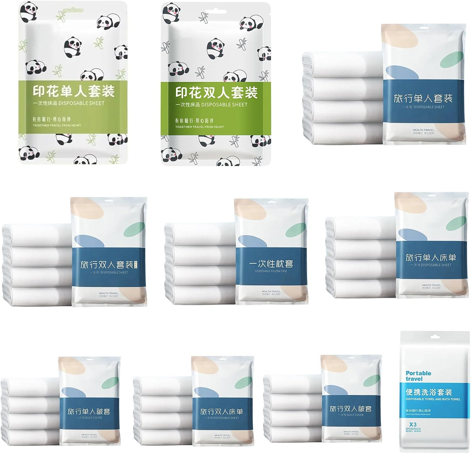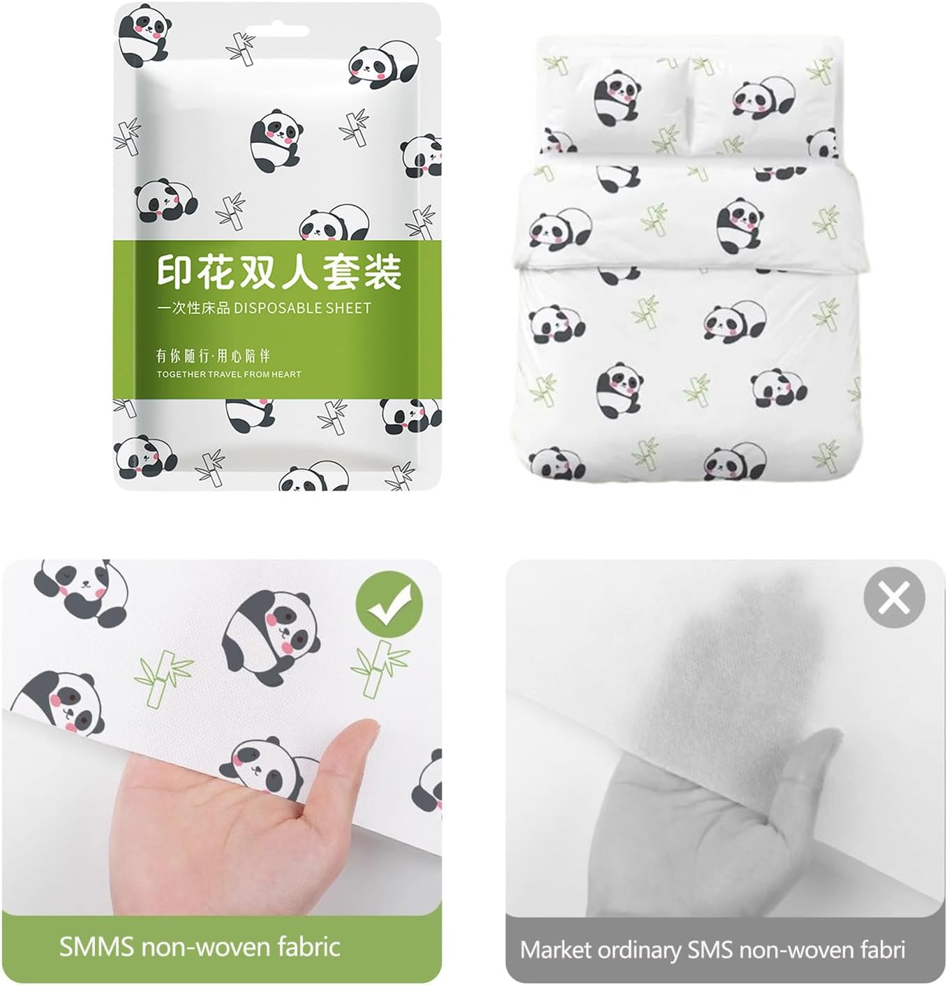 for travel, business professional, and guests staying in hotel, as well as families with children or pet who prioritizenensures during any temporary stay with easy to use, Disposables bedding set that combines comfort with impeccables hygiene.nfrom nonwoven fabric, this set offer soft, comfortable touch with excellent breathability and effective protections to keep your bedding Cleans.nWhether on the road, staying overnight at a hotel, or convenient bedding solution for home, our Disposables bed.nhygiene with Disposables bed sheet set, with duvet Covers and pillowcase, Pandas pattern.