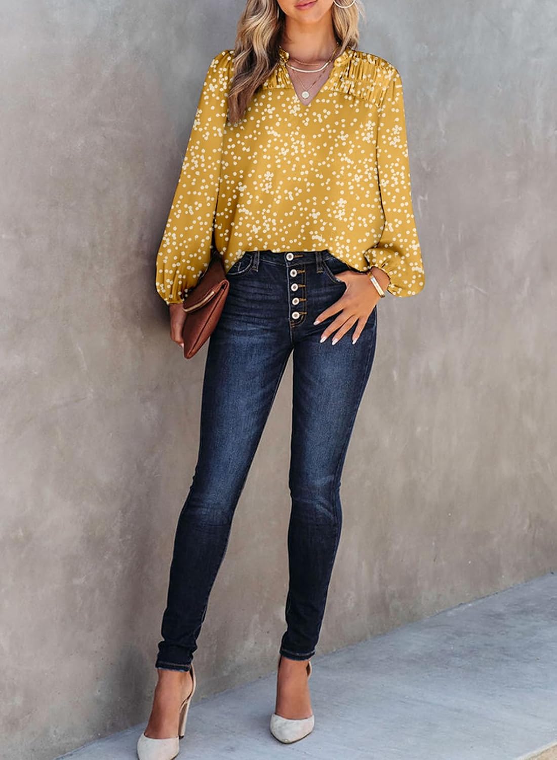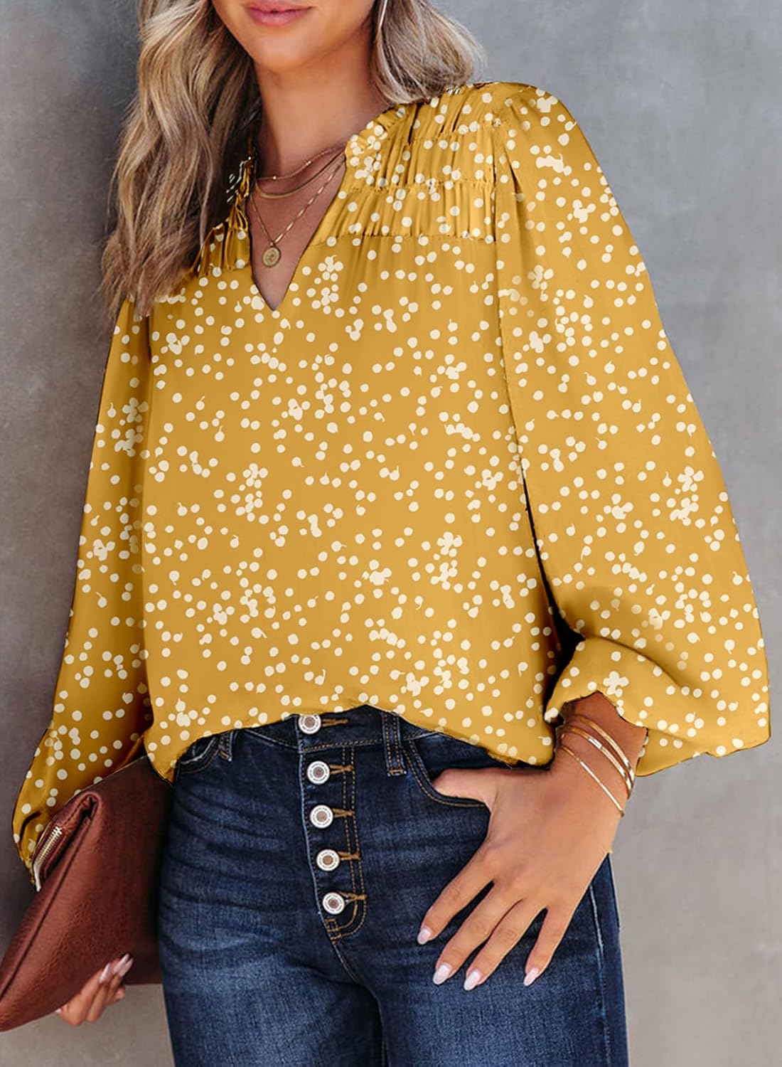 Dokotoo Women’s Casual V Neck Alicia Floral Print Smocked Long Sleeve Chiffon Blouses Bohemian Top Shirts