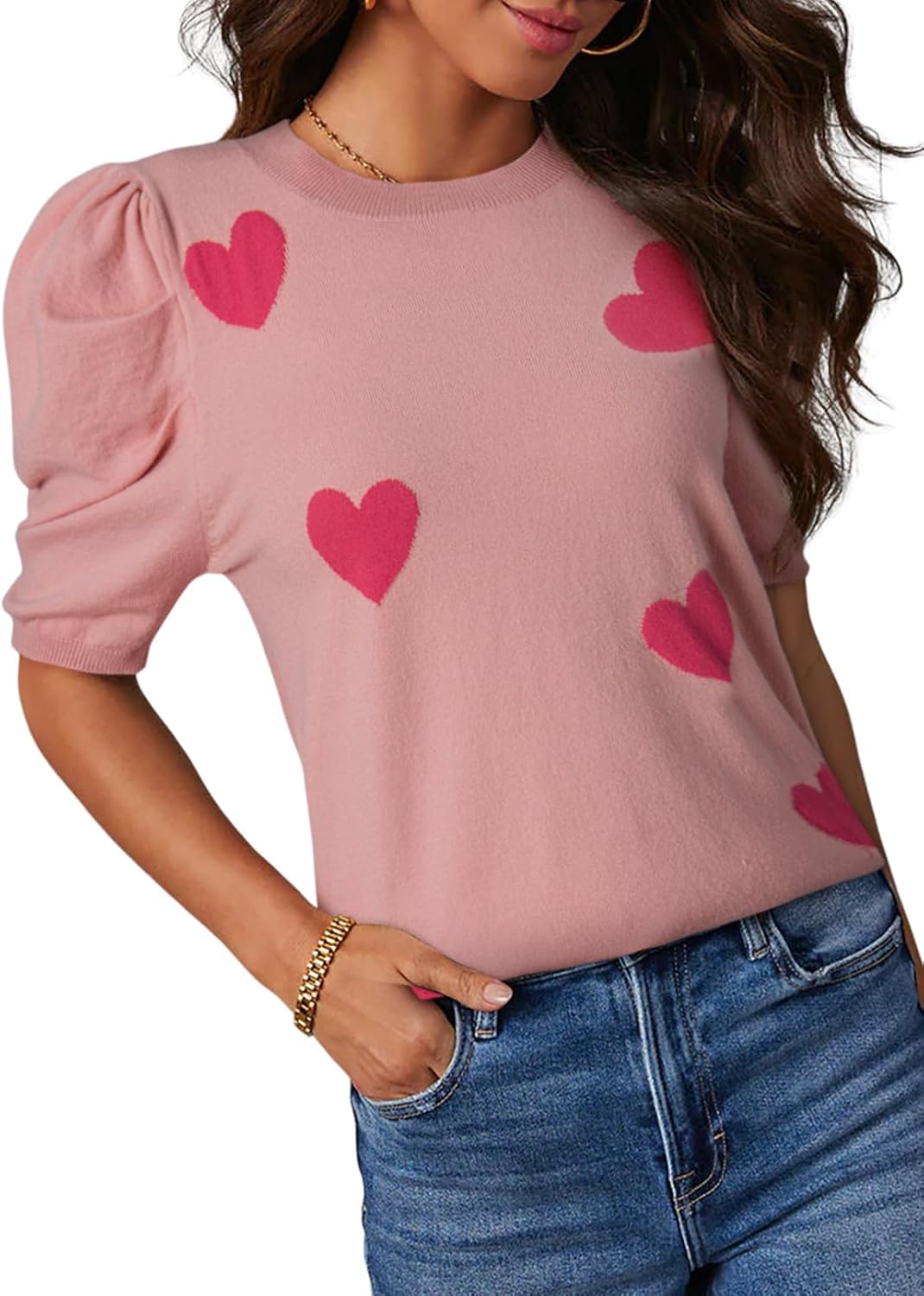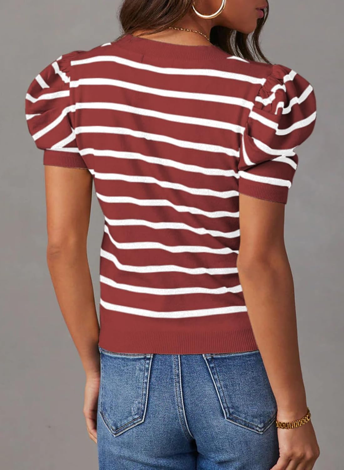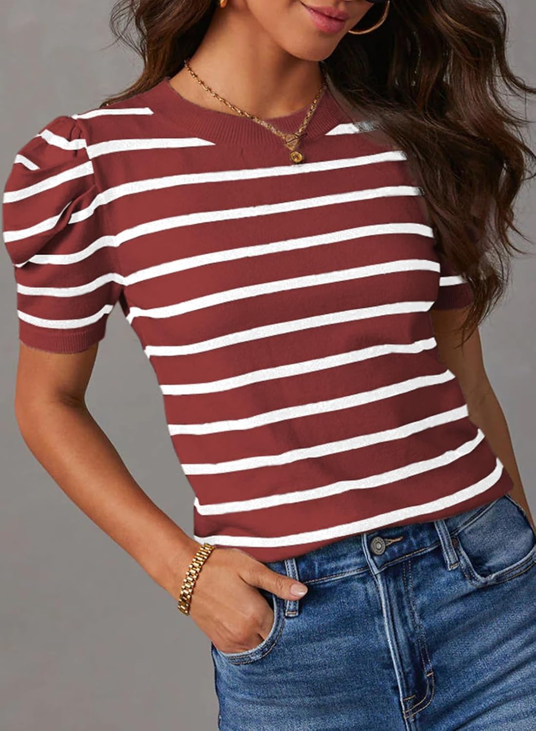 Dokotoo Women’s Short Puff Sleeve Knit Tops 2025 Trendy Crewneck Striped T Shirts Casual Summer Blouses