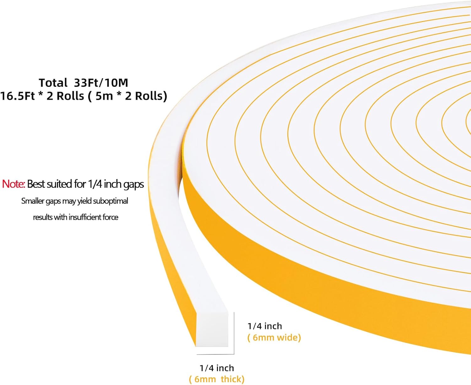About this itemn??SAVE ON ENERGY BILLS- Sealing gaps with this door window insulation strip helps to reduce energy consumption by keeping your room cool in summer and warm in winter, thus reducing electricity bills. You get two rolls of air conditioner insulation foam seal strip with 33 ft in total in each package, providing enough material for multiple seals. And it’s easy to install and apply without extra tools, just simply peel and stick it on for a tight seal. It’s a hassle-free and money-saving solution!n??STRONG GRID ADHESIVE-We use only premium adhesives on every Trisiki’s Foam door seal, which guarantees everything stick firmly. In addition, the innovative grid adhesive backing of this seal strip ensures stronger adhesion by evenly distributing the glue, reducing air bubbles and enhancing durability. This design makes it easy to apply, providing a reliable seal on various surfaces, perfect for doors, windows, and more.n??EXCELLENT RESISTANCE TO DEFORMATION FEATURE-This door weather stripping is made from high density CR foam, Neoprene, which has great sealing and resistance to deformation feature. In addition, the material is environmental friendly, toxic free. The can be used from -50? to 150?n??WIDE APPLICATION-Trisiki’s rubber weather tape is a tough, durable self-stick tape with minimal compression and can help prevent rattles, vibrations and squeaks. It’s widely used as a weatherstrip, or as a gasket or to cushion and stabilize major appliances, such as doors, windows, furniture, electrical cabinets, speakers, toys, handicrafts, sports equipment, vents, air conditioners, plumbing, hvac. Plus, on cars, trucks and boatsn??100% SATISFACTION GUARANTEE-Were dedicated to offering great products with premium quality under strict and highest standards. Contact us if any problem, we provide timely response and perfect solutionn See more product details