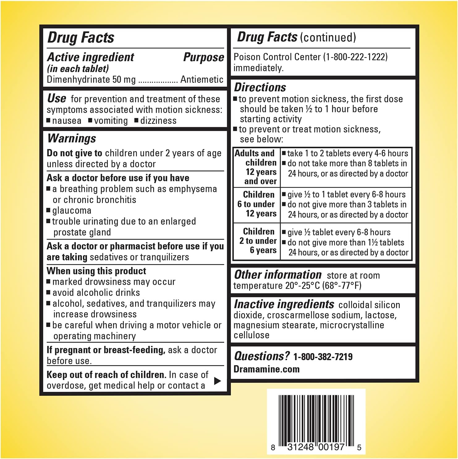 About this itemnDramamine Motion Sickness Original tablets provide powerful, fast motion sickness relief when you need it mostnPrevents and relieves nausea, dizziness and vomiting; a must have for your vacation essentialsnDramamine is the number 1 pharmacist-recommended brand; Named by Pharmacy Times and U.S. News & World Report as number 1 Pharmacist-Recommended Brand for 2022 Motion Sickness Remedies CategorynContains 1 Travel Vial of Dramamine Motion Sickness Relief Original tablets, 12 countnNumber 1 name in motion-related nausea relief IRI Motion Sickness category sales data ending 1/1/2023