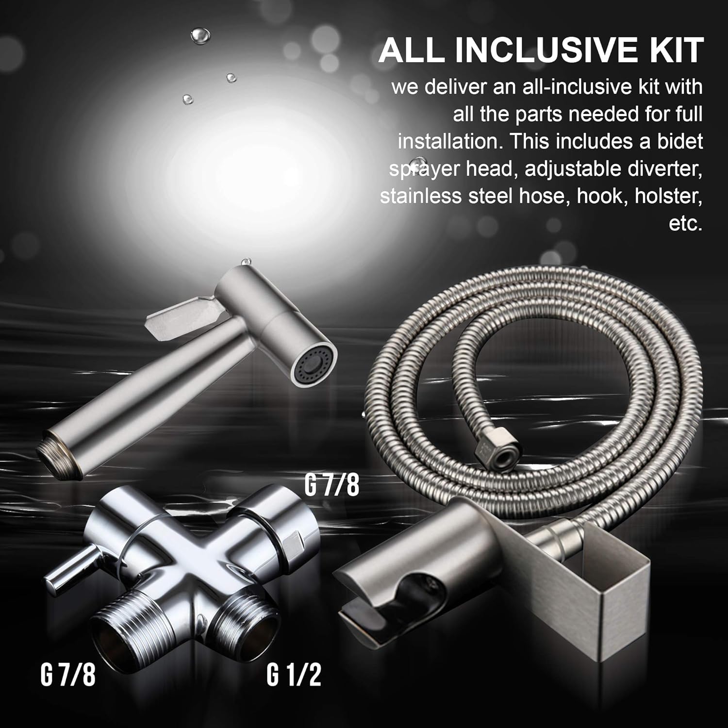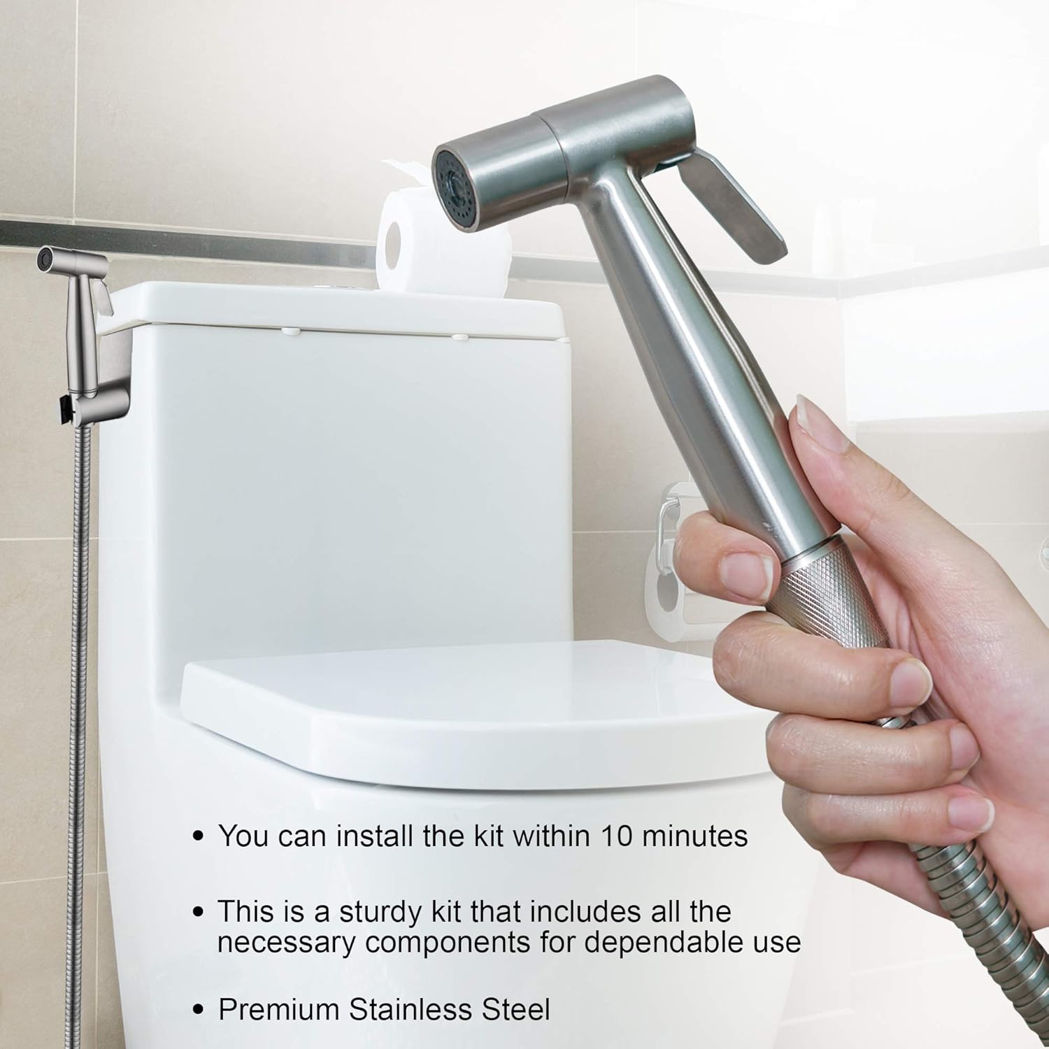 About this itemnPremium Stainless Steel Construction: Crafted from durable type 304 stainless steel, this bidet sprayer resists corrosion and oxidation, ensuring long-lasting performance and a sleek, polished finish.nMultipurpose Hygiene Solution: Designed for daily personal cleansing, this versatile sprayer can also be used as a shattaf shower, cloth diaper sprayer, dog shower, and more, offering convenience and versatility.nComplete Installation Kit: This all-inclusive kit comes with a sprayer head, adjustable diverter, stainless steel hose, hook, holster, and all necessary installation components, making setup a breeze.nBrand Assurance: Droiee prioritizes customer satisfaction, offering a premium bidet sprayer kit backed by a reliable money-back guarantee for added peace of mind.n See more product details