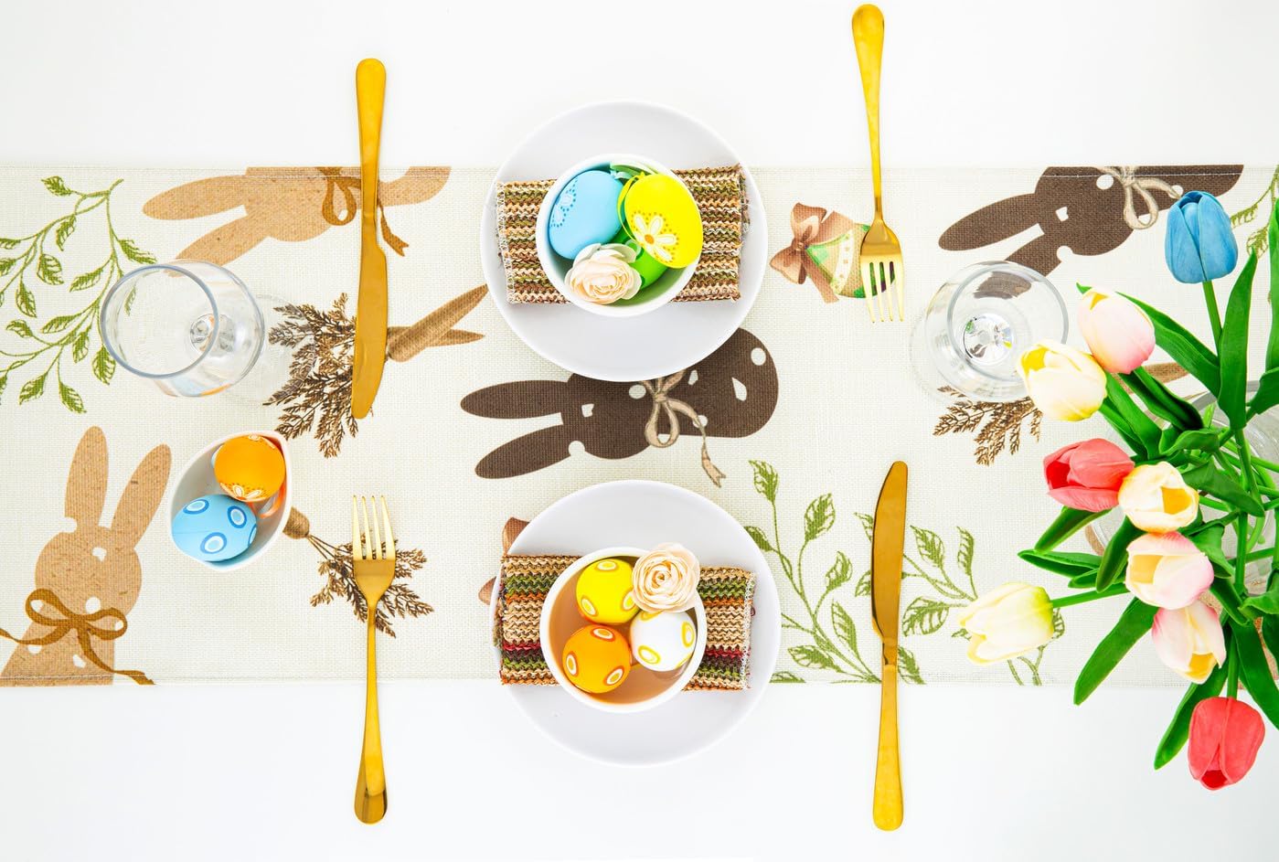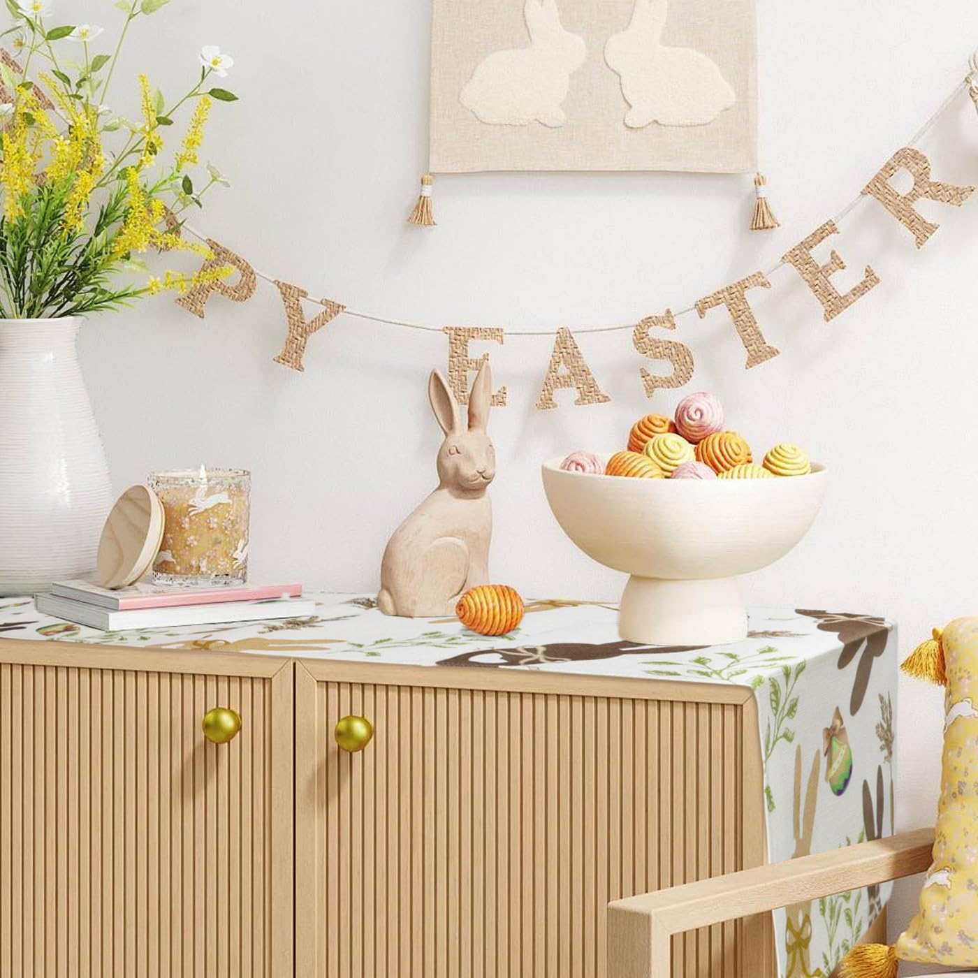 About this itemn100% PolyesternNatural Quality Material: Easter table runner is made of Made of 100% polyester which is very easy to clean and not easy to fade, durable. size: 13 x 72 inches, Package: bubble bag, weight: 110g. Suitable for most standard tables and decorations.nCute Design Full Of Easter Atmosphere: colorful and bright bunny Rabbit Carrot cute pattern, spread in the home decoration, especially the Easter atmosphere, make you happy and feel hope and the beginning of a new life.nVersatile Decoration: with Easter eggs, carrots, baskets, it is very suitable for mantels, coffee tables, kitchen tables, tea tables, parties, special occasions and other occasions to let the guests and you feel the strong Easter atmosphere.nEaster Gift: Easter table runner is made of linen fabric to protect your table from damage by hot pots. It can also be given as an Easter gift to your family, friends and loved ones.nPlease Note:When you receive it, there may be creases due to folding, which need to be laid flat for a while to disappear. It can be hand and m machine washed, Keep out of direct sunlight while drying to keep the colors bright and reduce the chance of fading.