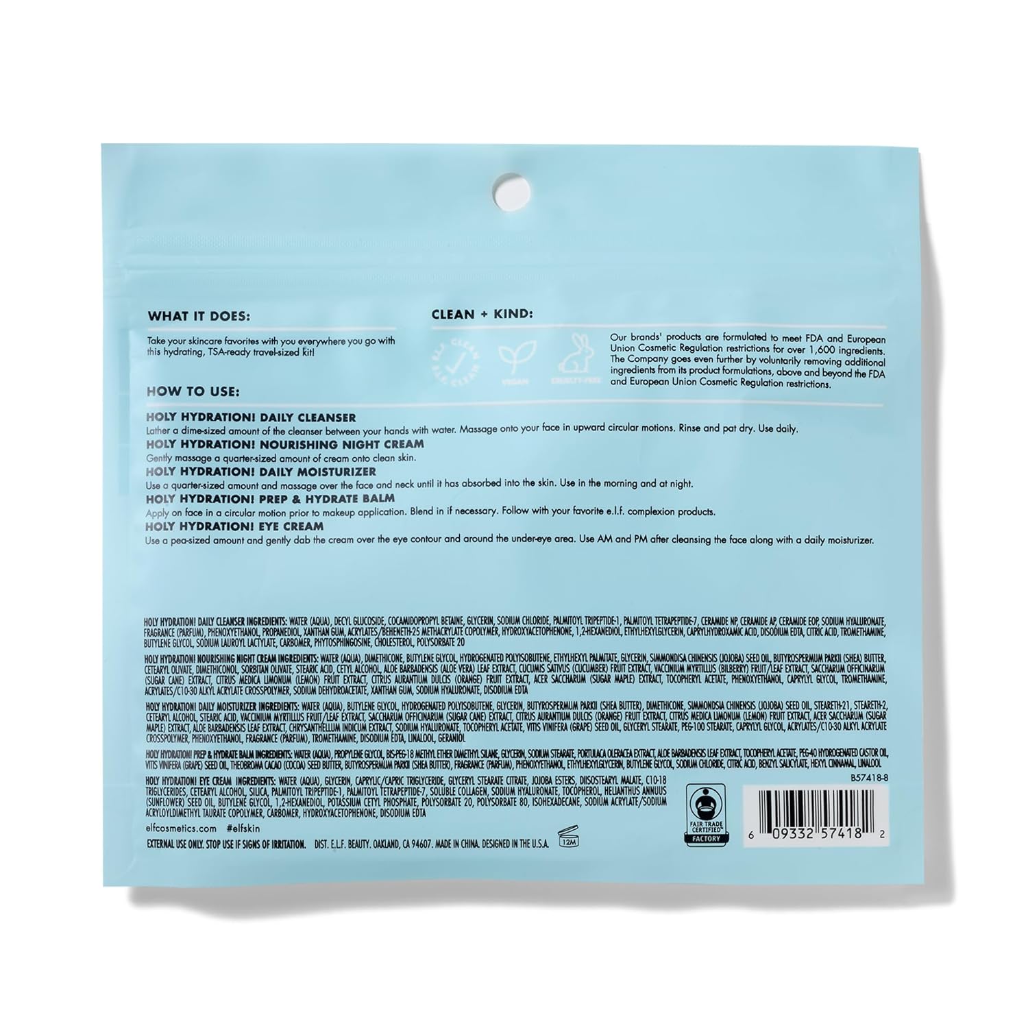 SKINCARE ON THE GO: The e.l.f. Jet Set Hydration Kit contains all of your skincare favourites in a TSA-ready travel-sized kit. The kit includes a Cleanser (30ml), Hydrating Balm (6g), Moisturizer (25ml), Eye Cream (7g) and Night Cream (15g).nNOURISHING & HYDRATING PRODUCTS: Each of these products is packed with nourishing ingredients such as Aloe, Shea Butter, Jojoba Oil, Vitamin E, Peptides and Hyaluronic Acid.nFOR ALL SKIN TYPES: This skincare set is perfectly compatible with all skin types.nHOW TO USE: Cleanse with Daily Face Cleanser & warm water. Tone with Prep & Hydrate Balm by applying all over the face in circular motions. Hydrate in the daytime with Daily Hydration Moisturizer & Eye Cream and in the evening with Nourishing Night Cream.nVEGAN & CRUELTY-FREE: 100% vegan, e.l.f. is double-certified cruelty-free by Leaping Bunny & PETA.
