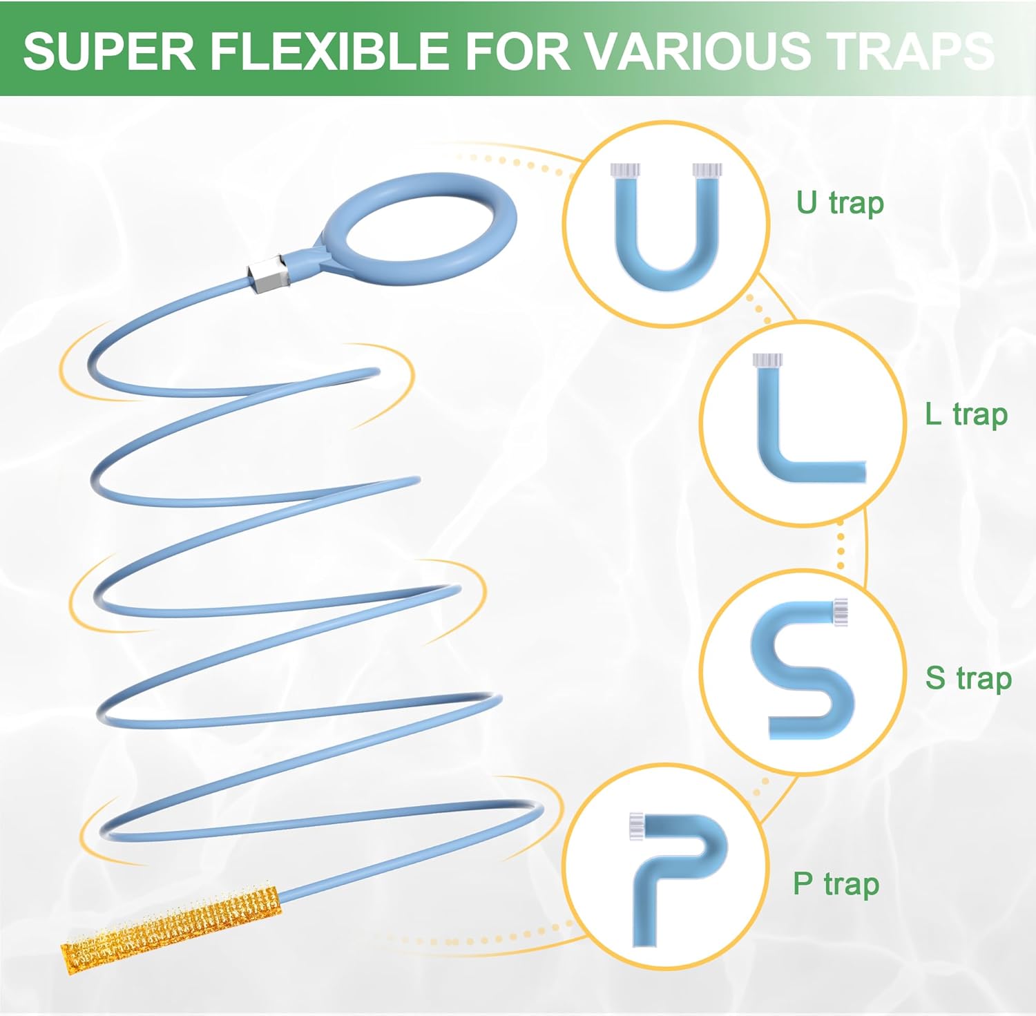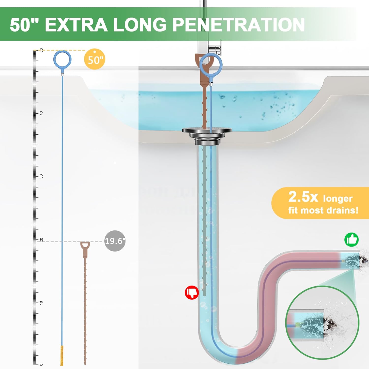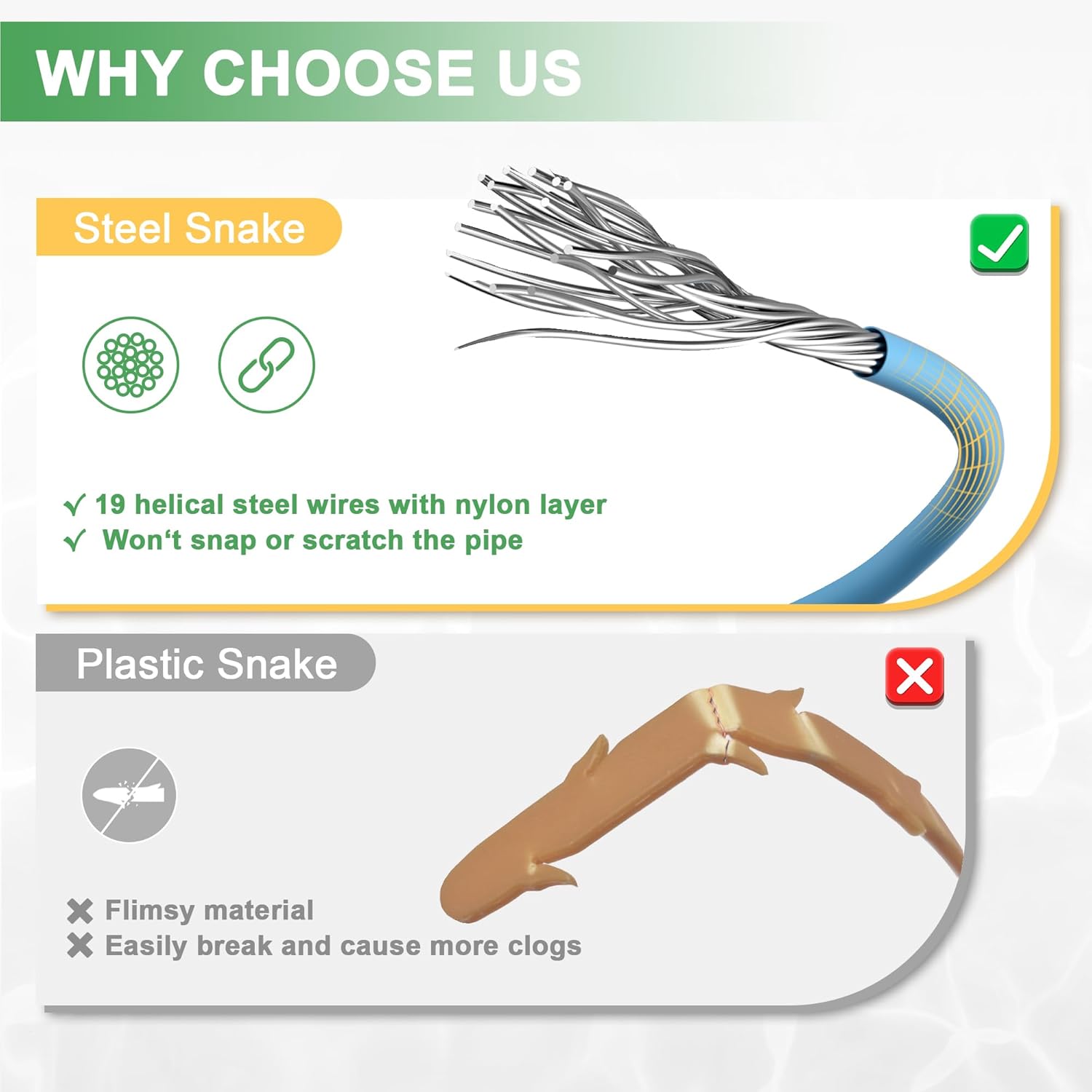 [50” Extra-Long, Slim Drain Snake] Our drain clog remover can reach deep into the drain to solve the blockage in most hard-to-reach places, and the 0.11-in ultra-slim wand is thin enough to fit into various narrow drain openings without getting stuck;n[Anti-Break Steel Material] Embedded with 19 helical steel wires, our drain hair remover increases rigidity to withstand over 300lbs of pushing and pulling force without breaking and its nylon layer boosts flexibility for easy pipe trap navigation;n[Reinforced Micro Hooks] Our drain cleaner tool features stitched and glued micro-hooks for durability to avoid the tip falling off. Unlike plastic snakes with barbs that easily get stuck, our sink snake navigates pipes smoothly with a slim 0.22-in head;n[Easy to Use] Unclog drains in just three steps! Insert the plumber snake into the drain, spin it a few times, and then pull it out slowly. Warm tip: Bending the micro-hook slightly before insertion helps the snake drain navigate the trap more easily;n[Multi-Drain Clog Solver] Say goodbye to tiresome clogs! Our sink snake drain tool is flexible, making it not only suitable for showers, bathtubs, and sink drains, but also effective for specialized applications like fish tank drains and AC drain lines.n› See more product details