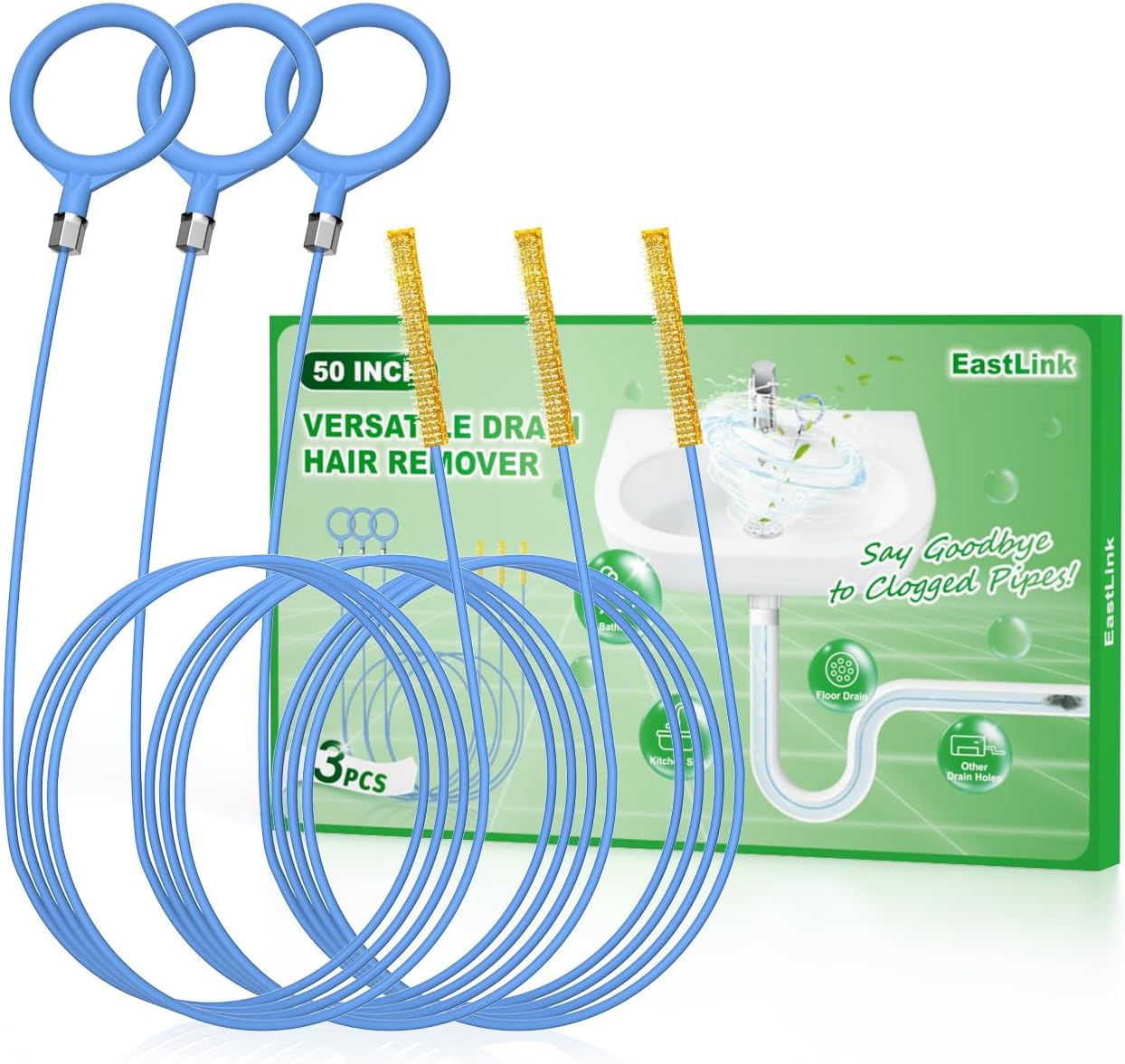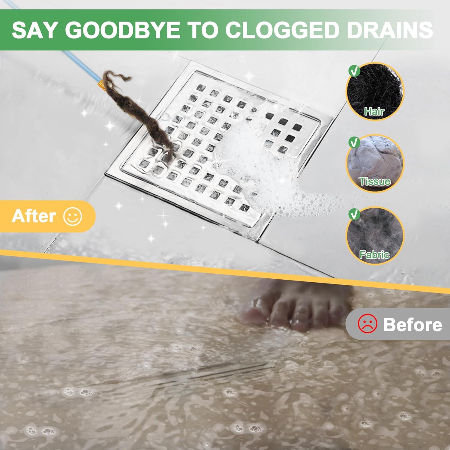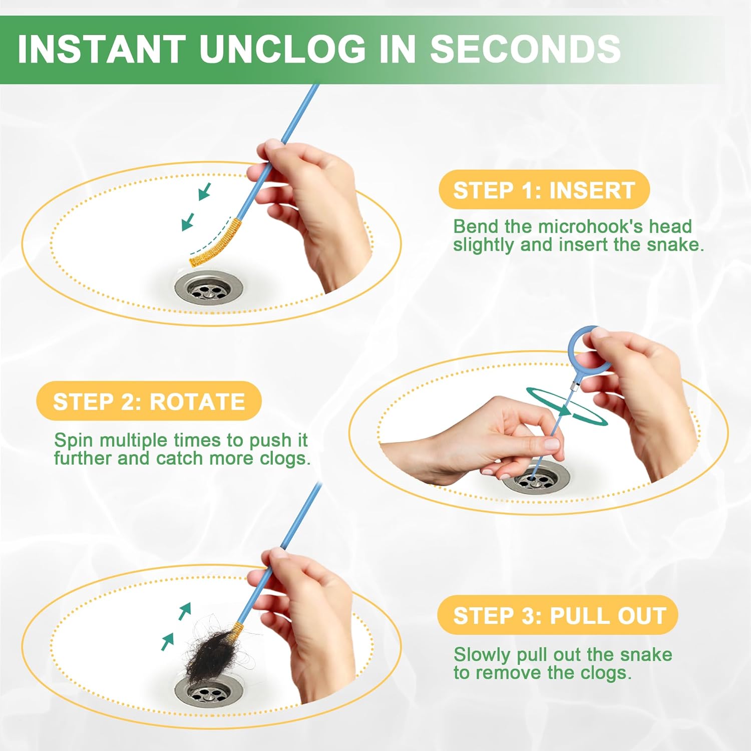 [50” Extra-Long, Slim Drain Snake] Our drain clog remover can reach deep into the drain to solve the blockage in most hard-to-reach places, and the 0.11-in ultra-slim wand is thin enough to fit into various narrow drain openings without getting stuck;n[Anti-Break Steel Material] Embedded with 19 helical steel wires, our drain hair remover increases rigidity to withstand over 300lbs of pushing and pulling force without breaking and its nylon layer boosts flexibility for easy pipe trap navigation;n[Reinforced Micro Hooks] Our drain cleaner tool features stitched and glued micro-hooks for durability to avoid the tip falling off. Unlike plastic snakes with barbs that easily get stuck, our sink snake navigates pipes smoothly with a slim 0.22-in head;n[Easy to Use] Unclog drains in just three steps! Insert the plumber snake into the drain, spin it a few times, and then pull it out slowly. Warm tip: Bending the micro-hook slightly before insertion helps the snake drain navigate the trap more easily;n[Multi-Drain Clog Solver] Say goodbye to tiresome clogs! Our sink snake drain tool is flexible, making it not only suitable for showers, bathtubs, and sink drains, but also effective for specialized applications like fish tank drains and AC drain lines.n› See more product details