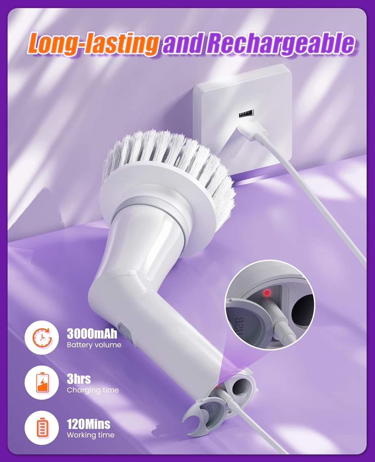 About this itemnUpgrade Electric Spin Scrubber: Equipped with a powerful 25W motor, which can operate firmly even with high pressure and the working noise is under 50 dB. It also has 2 working speeds: 400RPM for daily cleaning and 480RPM for deep clean.nOne Scrubber, Multiple Choices: Electric cleaning brush includes 6 detachable brushes, Round brush for curved surface like bathtub and toilet; flat brush for tile floors and grouts; Corner brush for Corner gaps; Sponge brush for windows…More usage ways waiting for you to explore!nEasily Adjustable, Extremely Light: This shower spin scrubber equipped with extendable Aluminum handle which extends from 14 inches to 47.2 inches, easy to clean hard-reach places, without kneeling or bending over. Brush weighs only 1 lb, even kids can use it with ease.nUltra long-lasting, Wireless Tethering: This cordless shower scrubber comes with a massive 3000 mAh battery, which can last continuously up to 120 mins after 3.5 hours fast charging. Cordless cleaning brush allows you to clean any corner of your home without being restricted.nSturdy Bristles, IPX7 Waterproof: This scrubbers bristle is made of durable PP material, which make sure to clean the stubborn stain easily but without scratching surfaces. The brush is highly sealed to protect damage from water, You can wash the brush head directly in the water. Notice: Do not use brushes under water.nGreat present, Thoughtful Services: The ideal present for lover, parents, friends, coworkers on Christmas, New year, Birthdays, Mother’s Day, Father’s Day. We are committed to providing excellent customer service, please contact us if you have any problems!