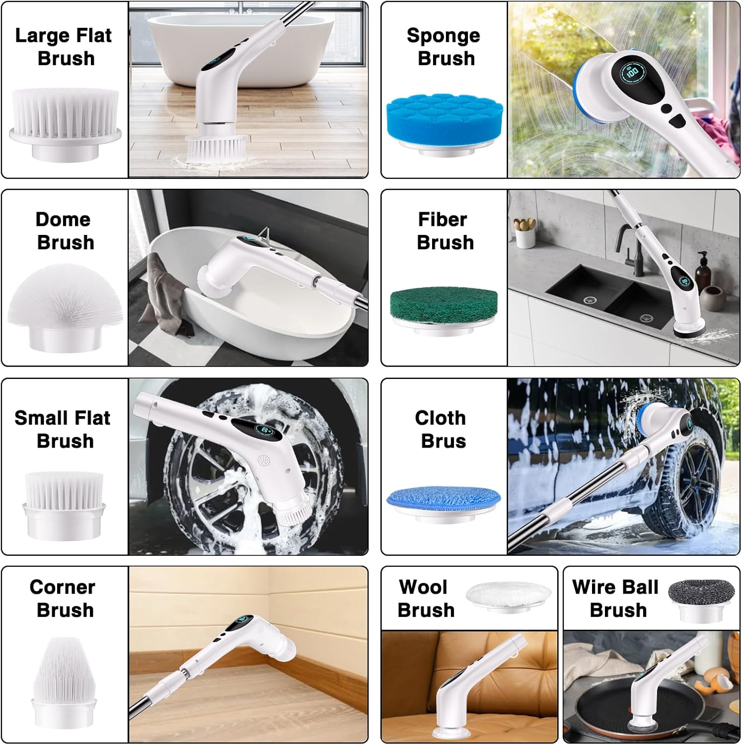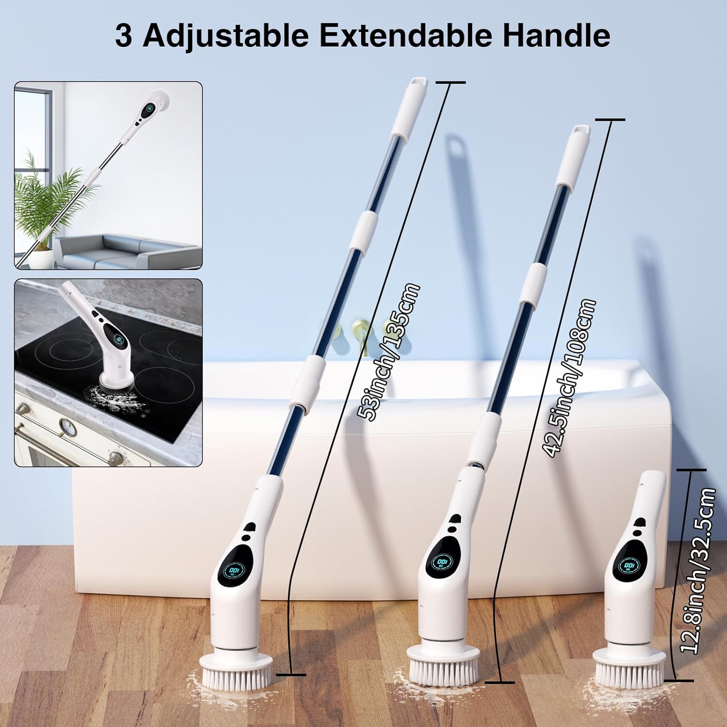 About this itemn?RICH ACCESSORIES?Electric scrubber for cleaning with long handle with 9 replaceable brush heads for tailored cleaning in kitchens, bathroom tiles, and glass. It includes 2 adjustable telescopic rods for easy length customization from 12.8